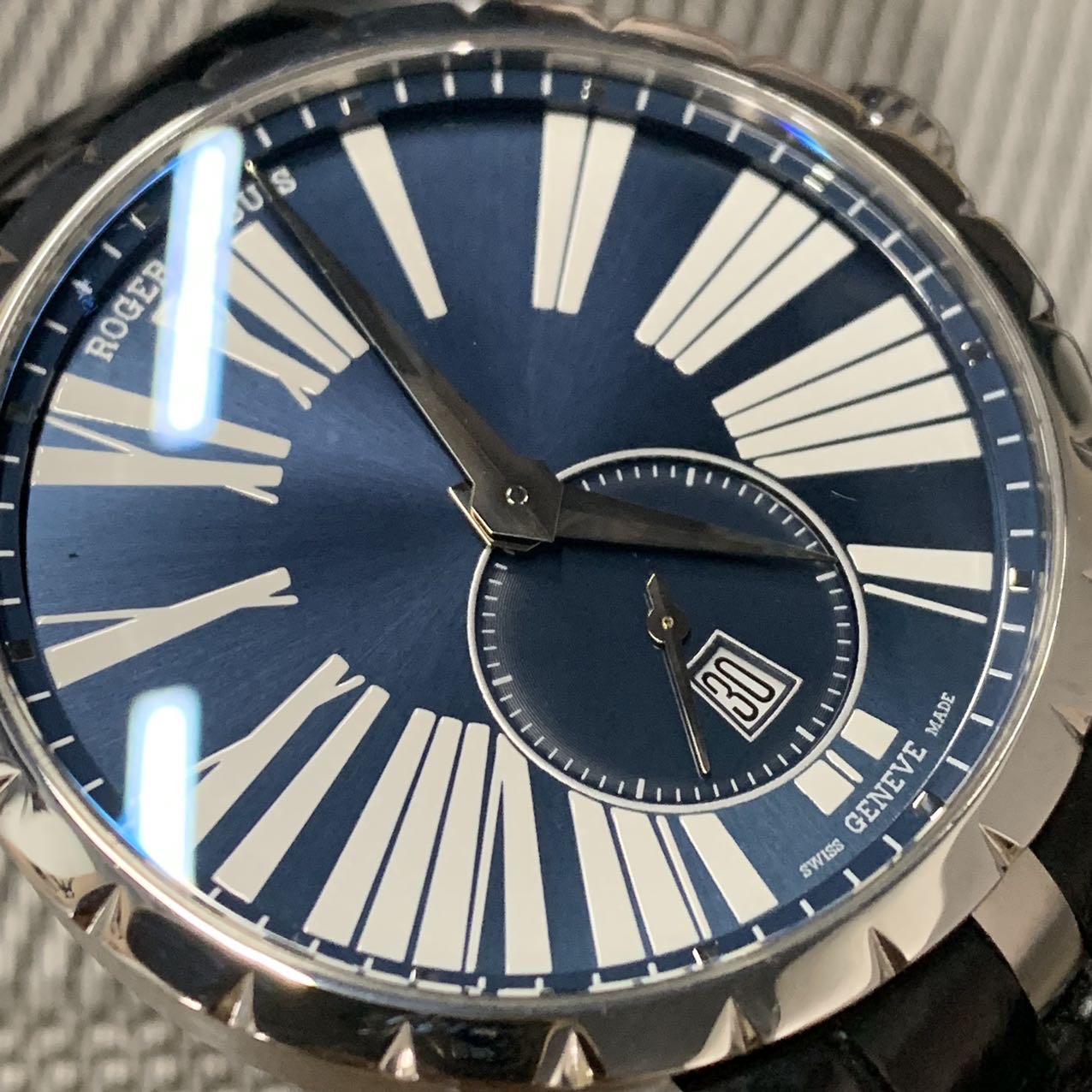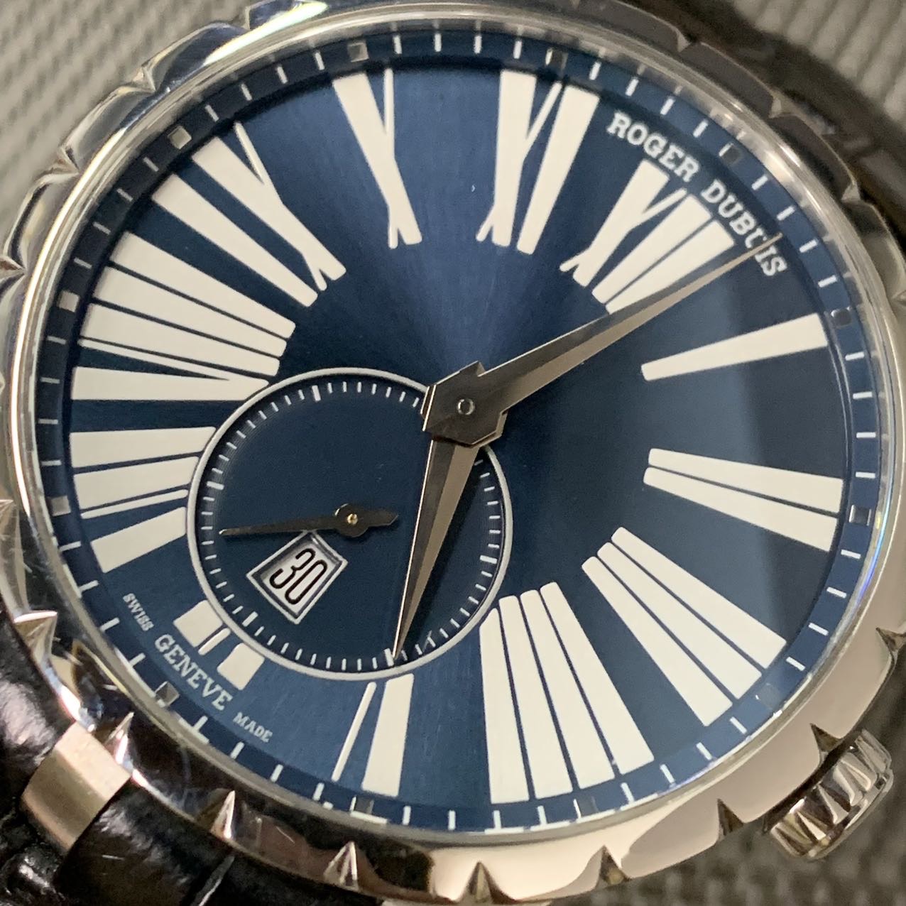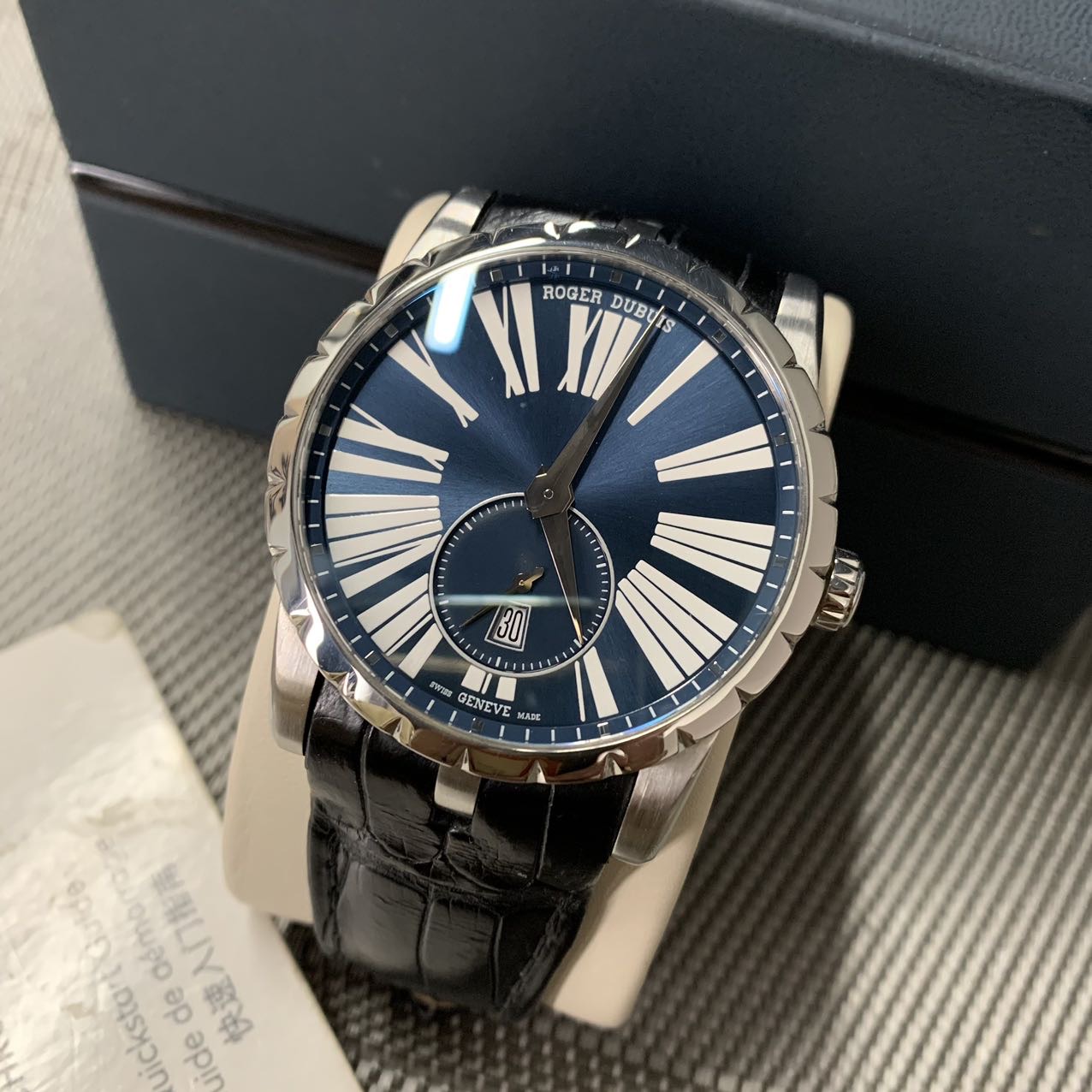 罗杰杜彼 王者系列机械男表,公价10.8万,表径42mm,单表 极品成色97新,质感放射纹蓝面,大气罗马刻度,独立秒针设计 搭载自产RD830机芯,K金陀,携刻日内瓦印记。