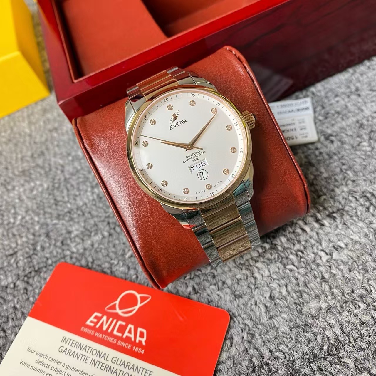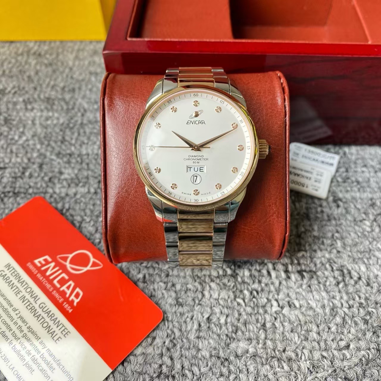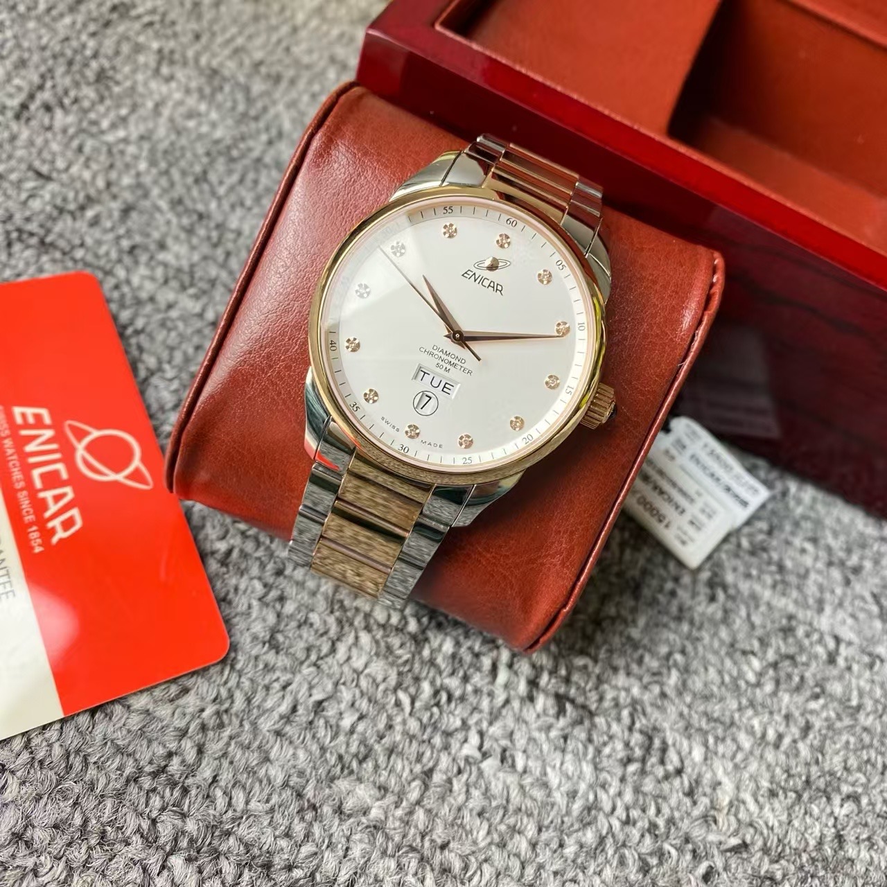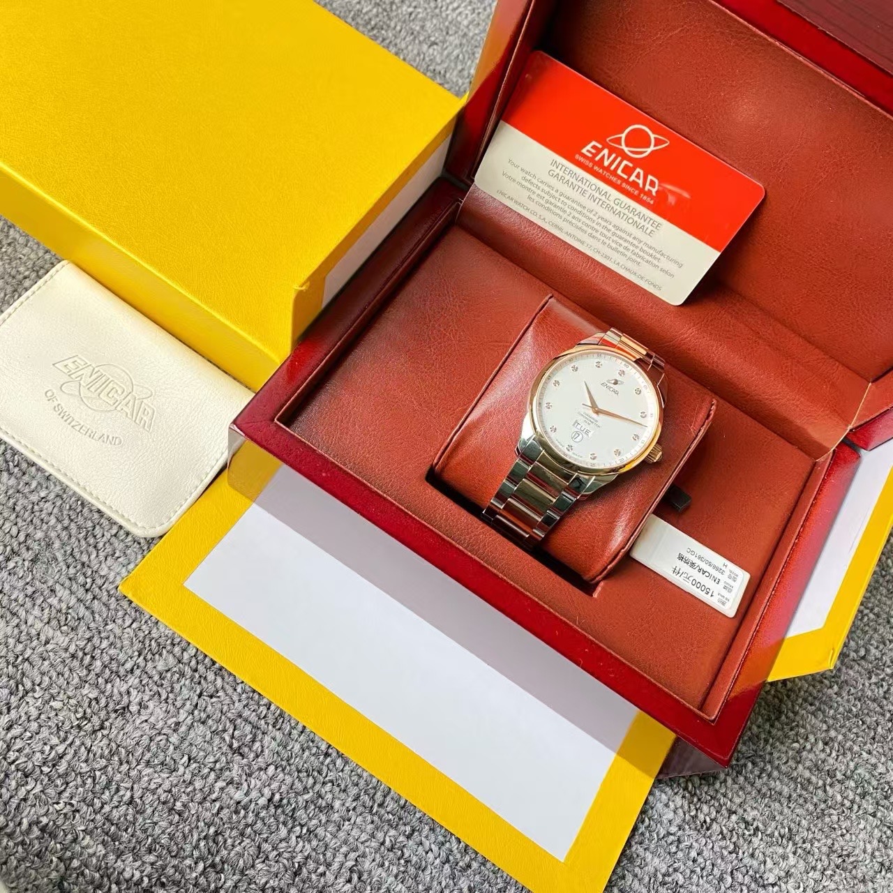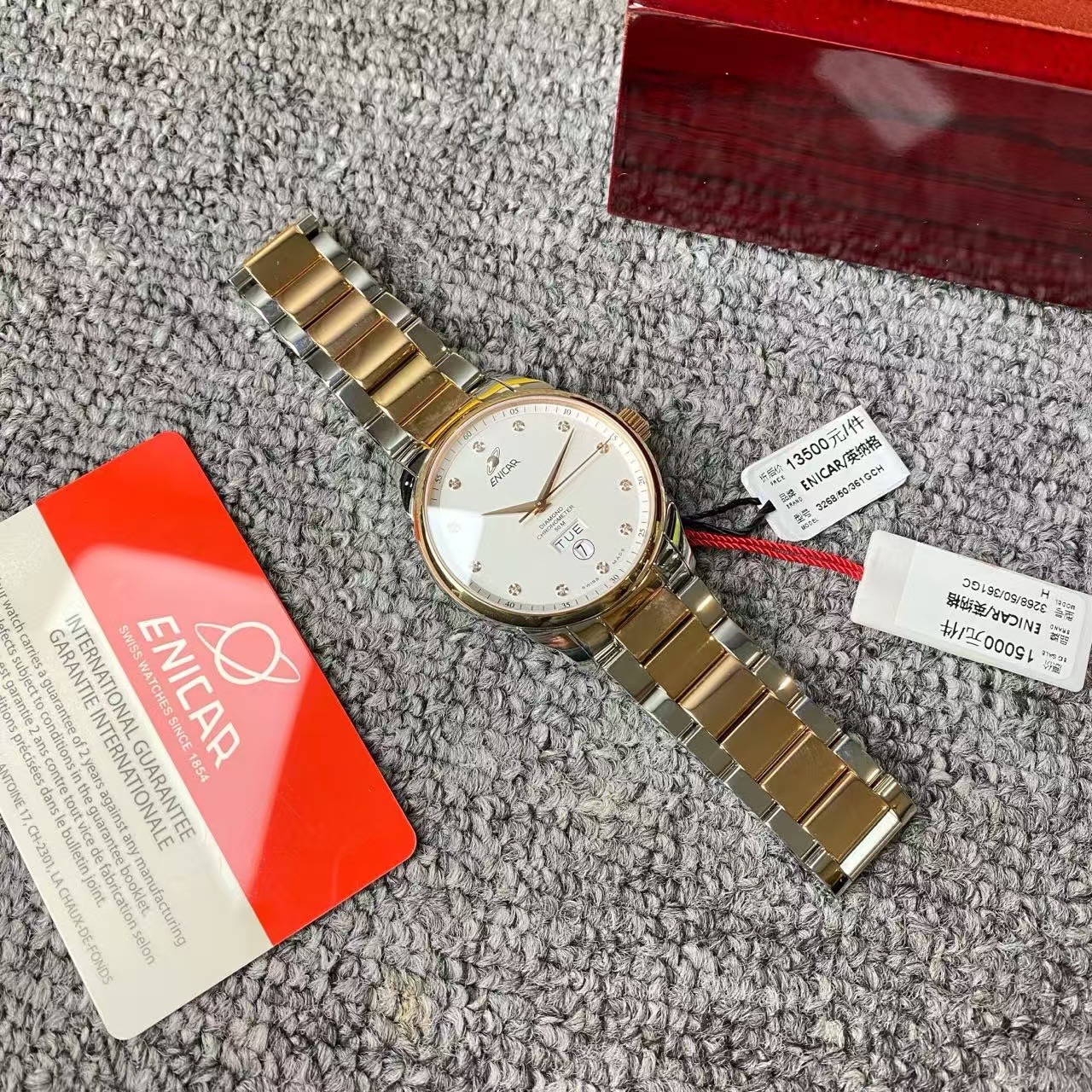 英纳格英雄系列机械男表,公价15000元,全新全套未使用,间金白盘,刻度镶钻,六点位双日历设计,上手大气,性价比最高。