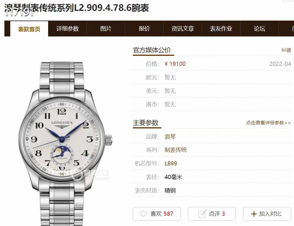 浪琴名匠系列四针月相L2.909.4.78.6自动机械男士腕表,表径40mm,精钢材质,抗磨损合成蓝宝石表镜,日期、月相显示功能,公价21300元