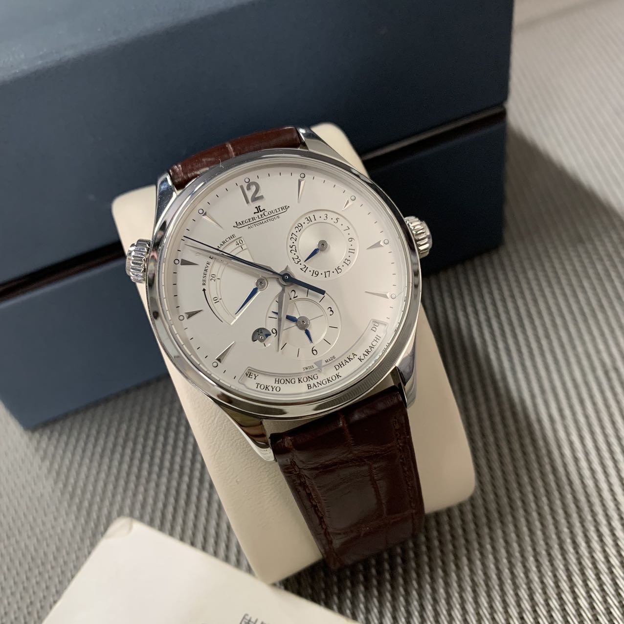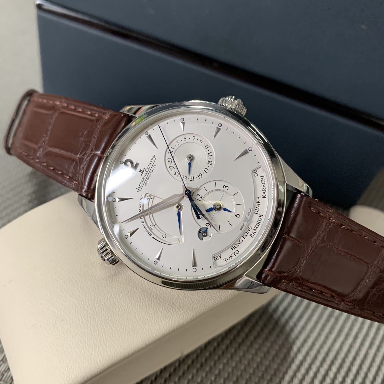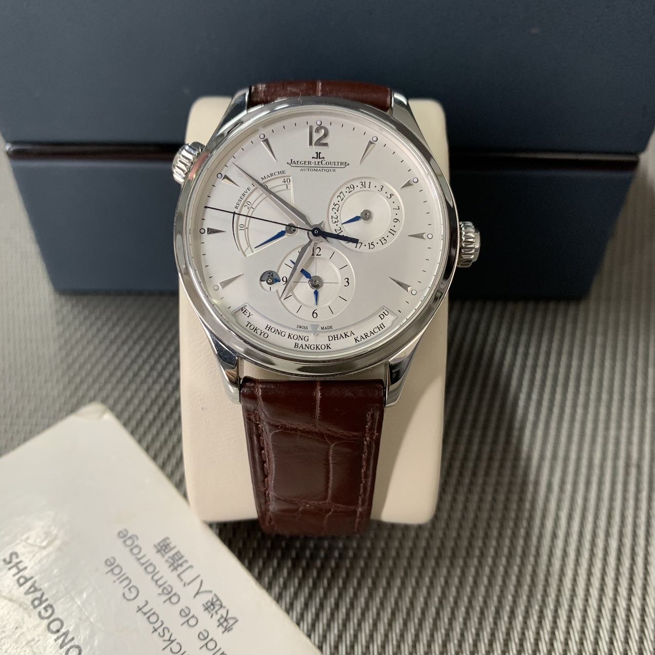 积家地理学家大师系列,公价10.2万,表径39mm,全套在保(2019年购买)极品成色97新,搭载自产939A/1型自动机芯,素质卓越,新款K金自动陀,1000小时精密天文台认证,具备动力储备显示,24小时日夜显示,世界时显示,双时区乃至夏令时等多项功能,性价比极高 强烈推荐款。