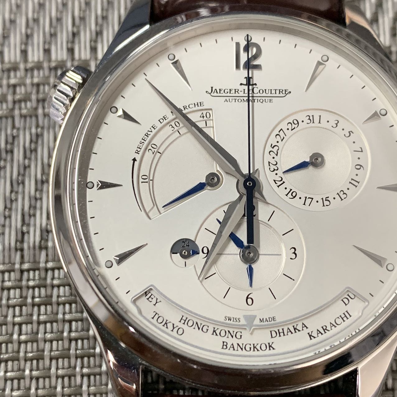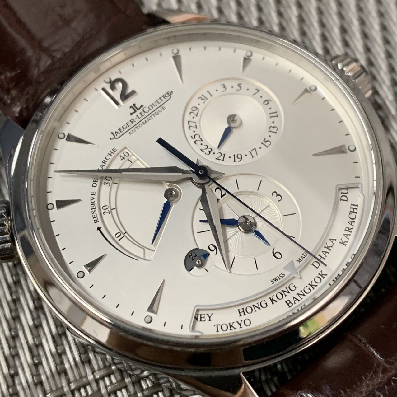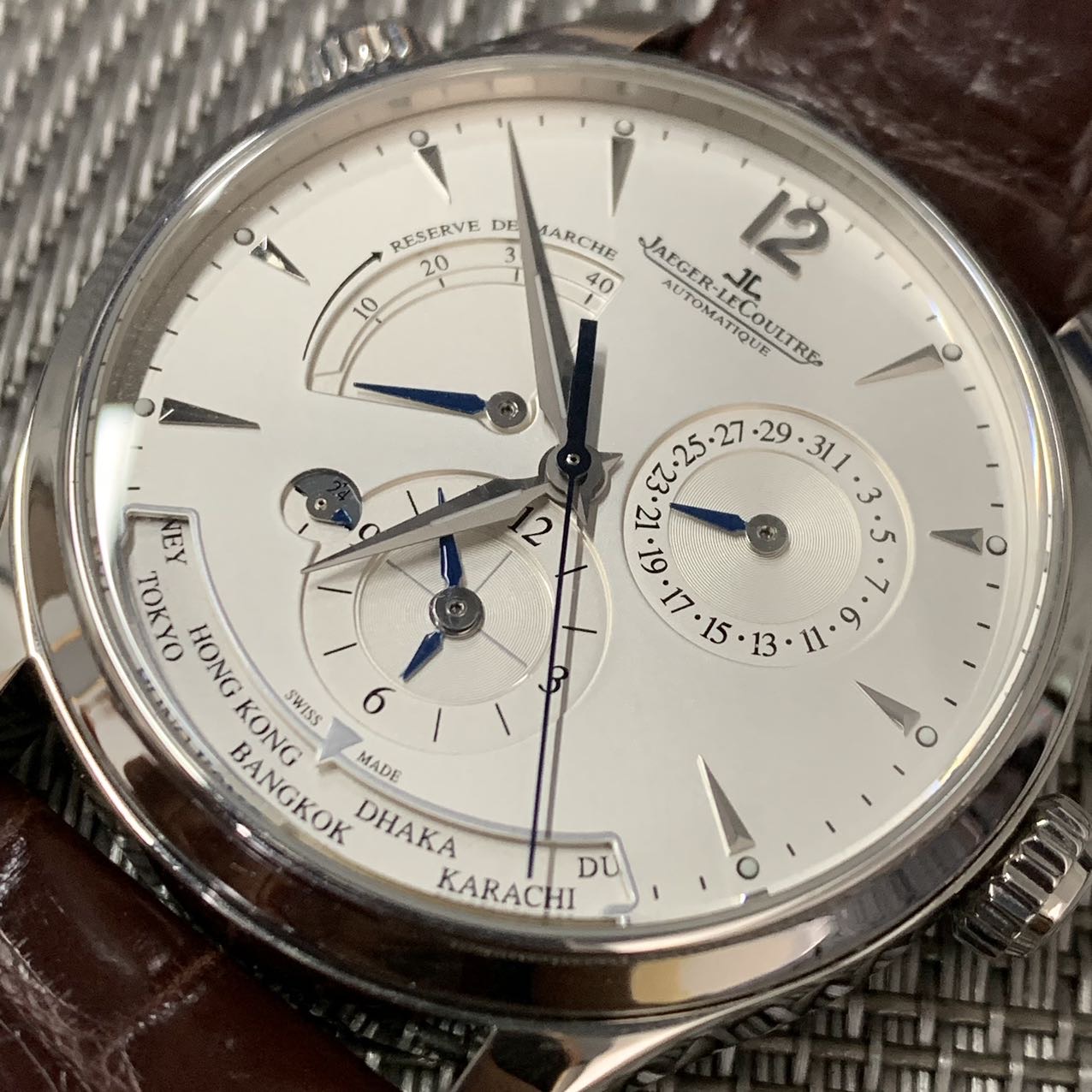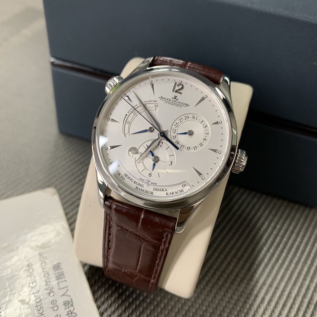 积家地理学家大师系列,公价10.2万,表径39mm,全套在保(2019年购买)极品成色97新,搭载自产939A/1型自动机芯,素质卓越,新款K金自动陀,1000小时精密天文台认证,具备动力储备显示,24小时日夜显示,世界时显示,双时区乃至夏令时等多项功能,性价比极高 强烈推荐款。