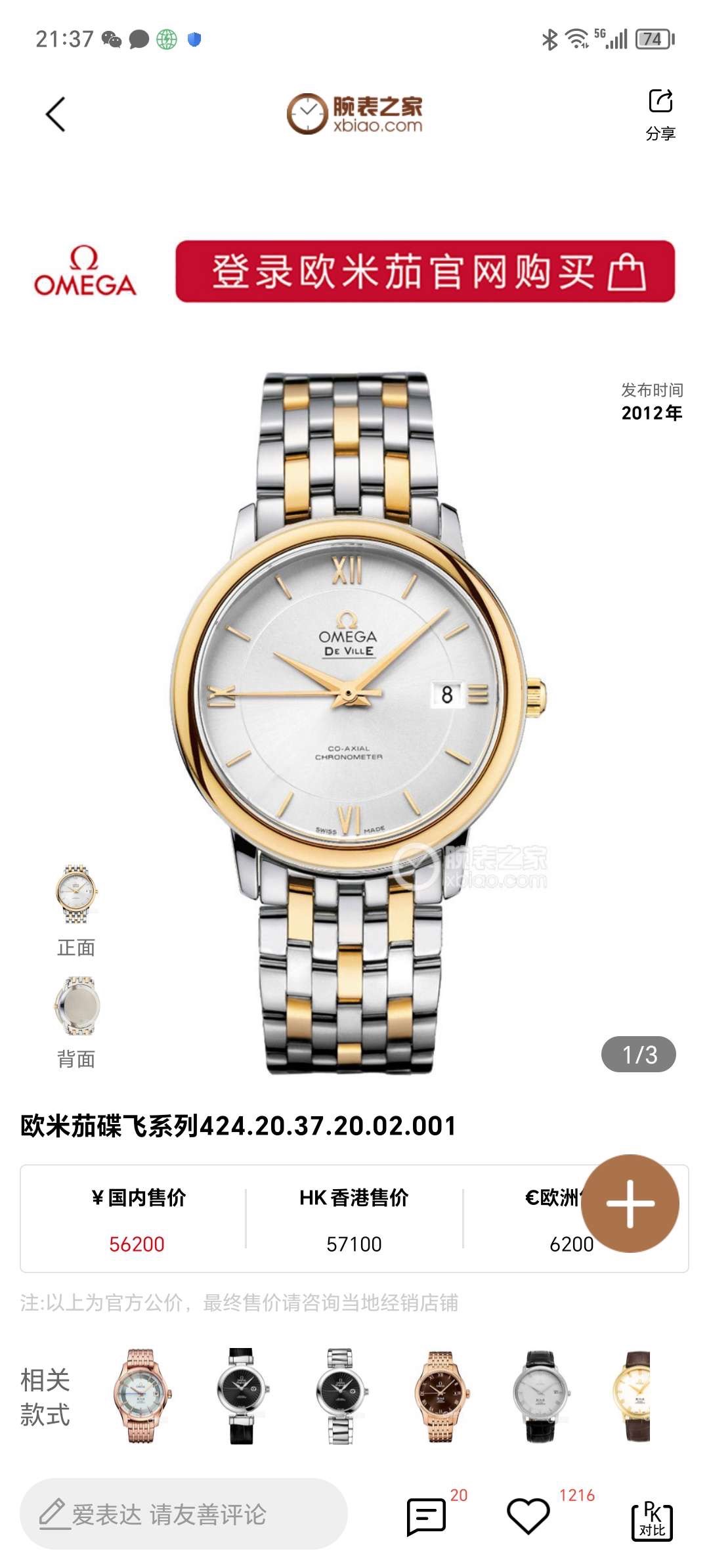 23年全套 欧米茄/Omega 碟飞系列 424.20.37.20.02.001 自动上链 精钢‑黄色18 K金 36.8 专柜价56200~