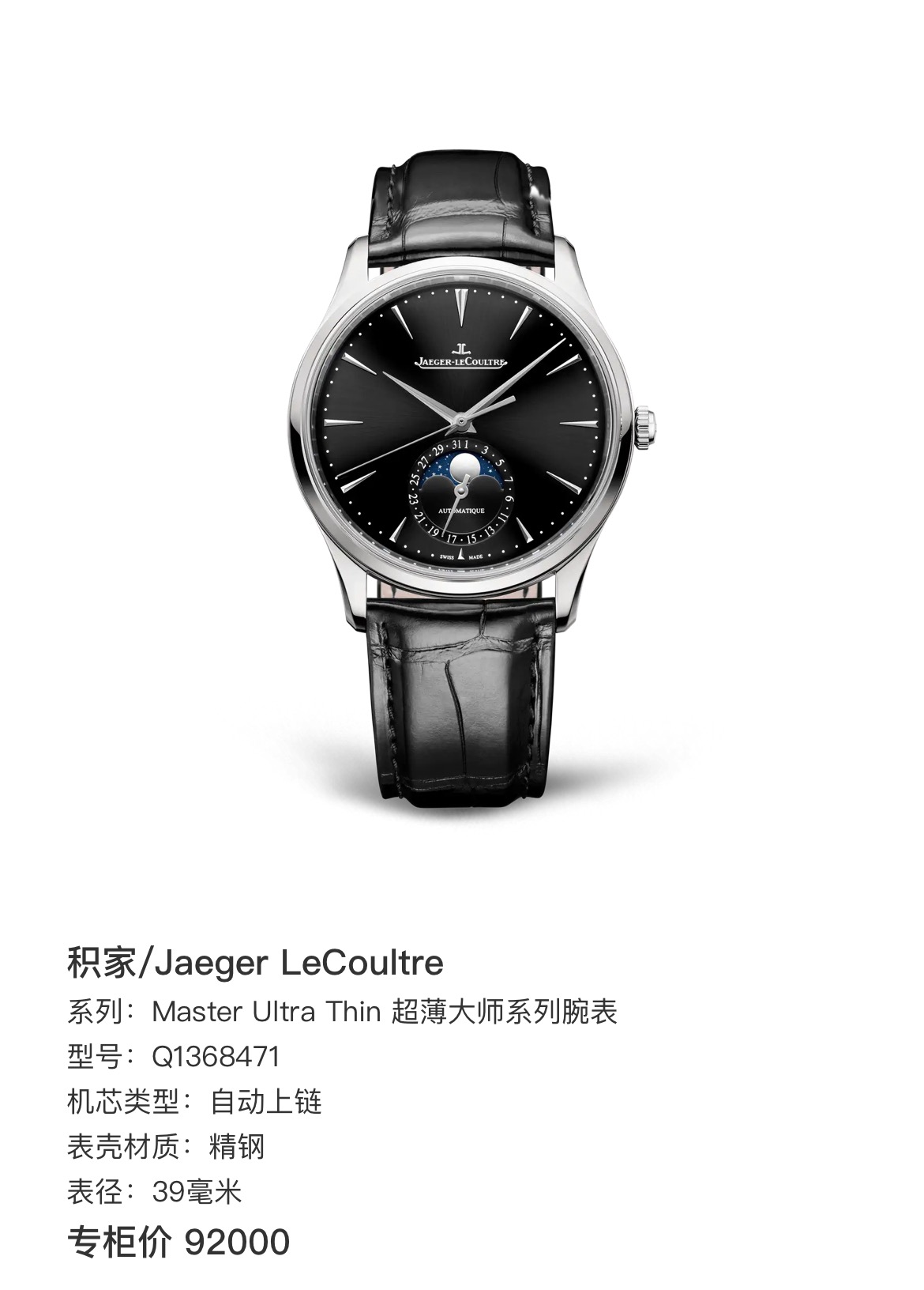 积家/Jaeger LeCoultre Master Ultra Thin 超薄大师系列腕表 Q1368471 自动上链 精钢 39毫米 专柜价 92000 23年11月全新全套未使用全膜~