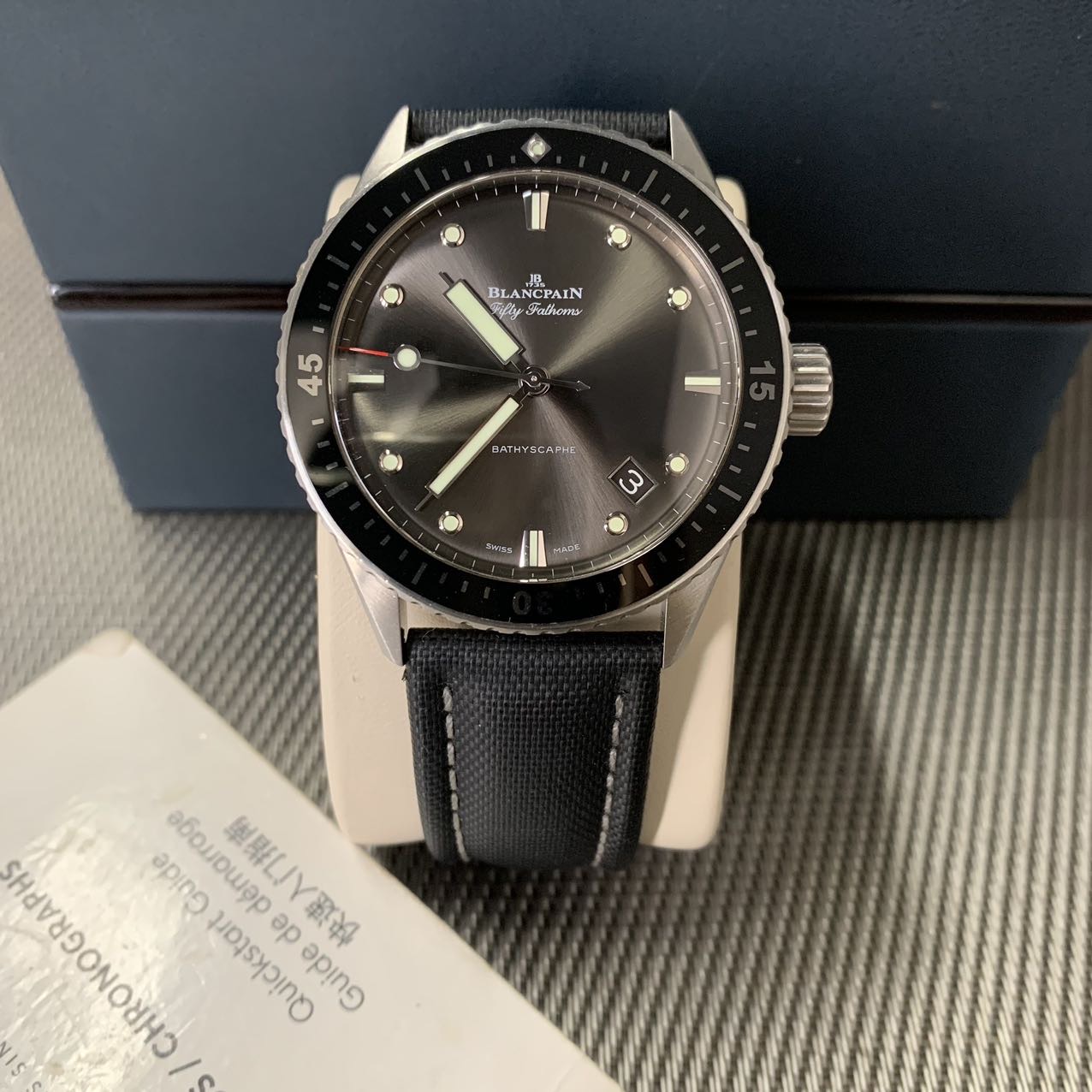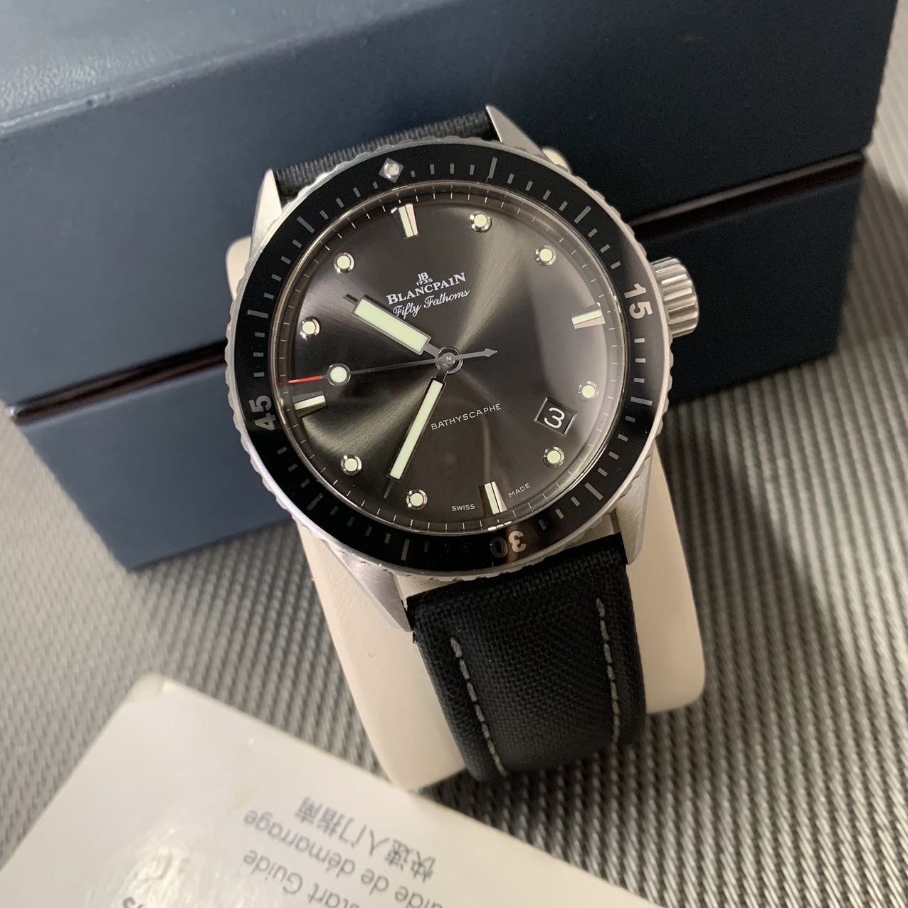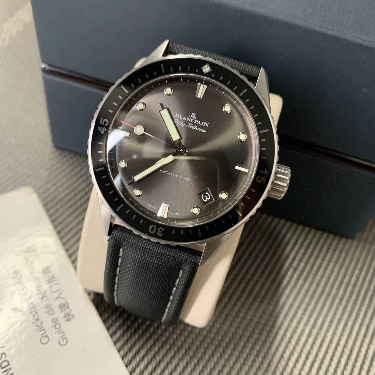宝珀五十噚-5000系列,公价8.2万,表径43mm,全套附件齐全 (2020年购买)极品成色97新,磨砂缎面精钢表壳,单向旋转表圈,航海帆布表带,新款流行灰色表盘,搭载自产1315机芯,热门潜水款。