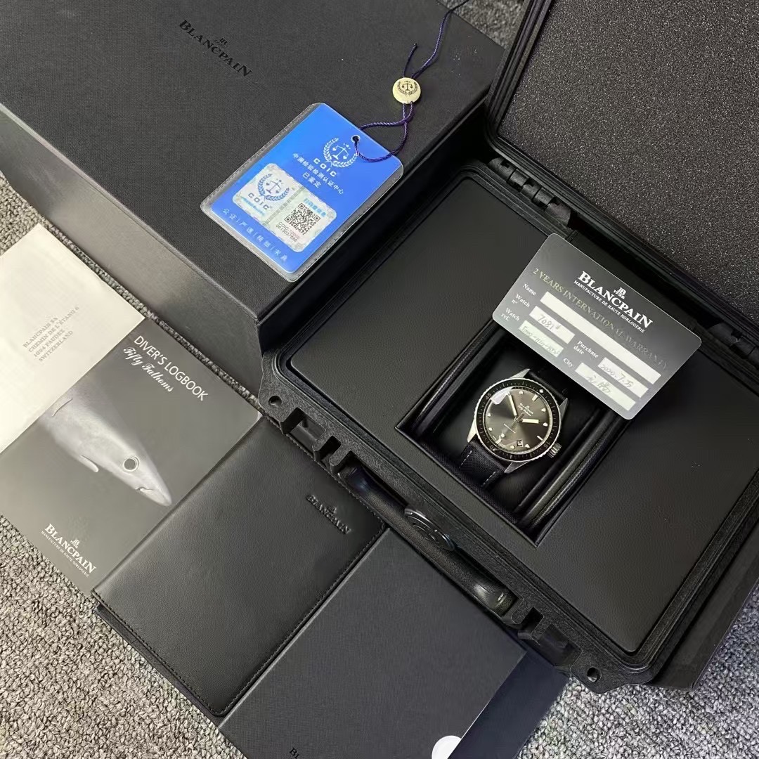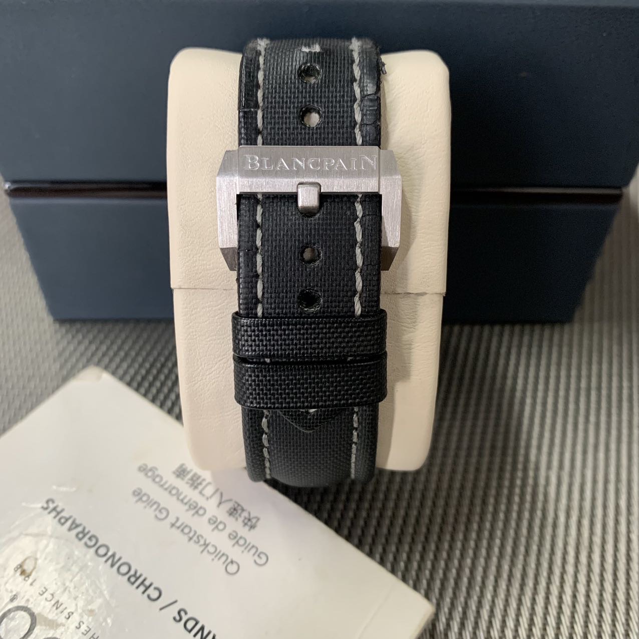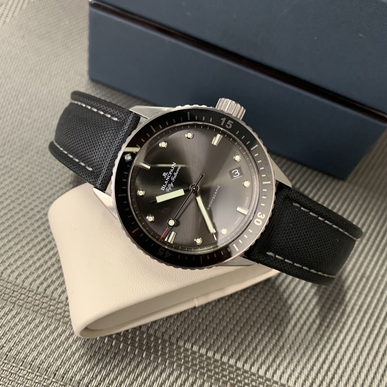 宝珀五十噚-5000系列,公价8.2万,表径43mm,全套附件齐全 (2020年购买)极品成色97新,磨砂缎面精钢表壳,单向旋转表圈,航海帆布表带,新款流行灰色表盘,搭载自产1315机芯,热门潜水款。