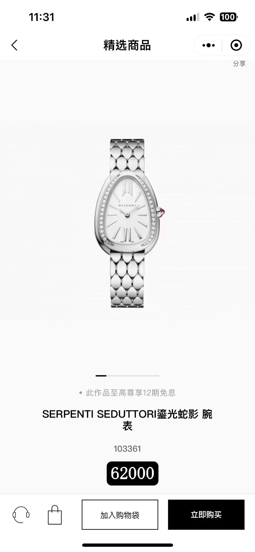 国行当天卡 宝格丽/Bvlgari Serpenti 103361石英机芯 精钢 33mm表径 公价62000