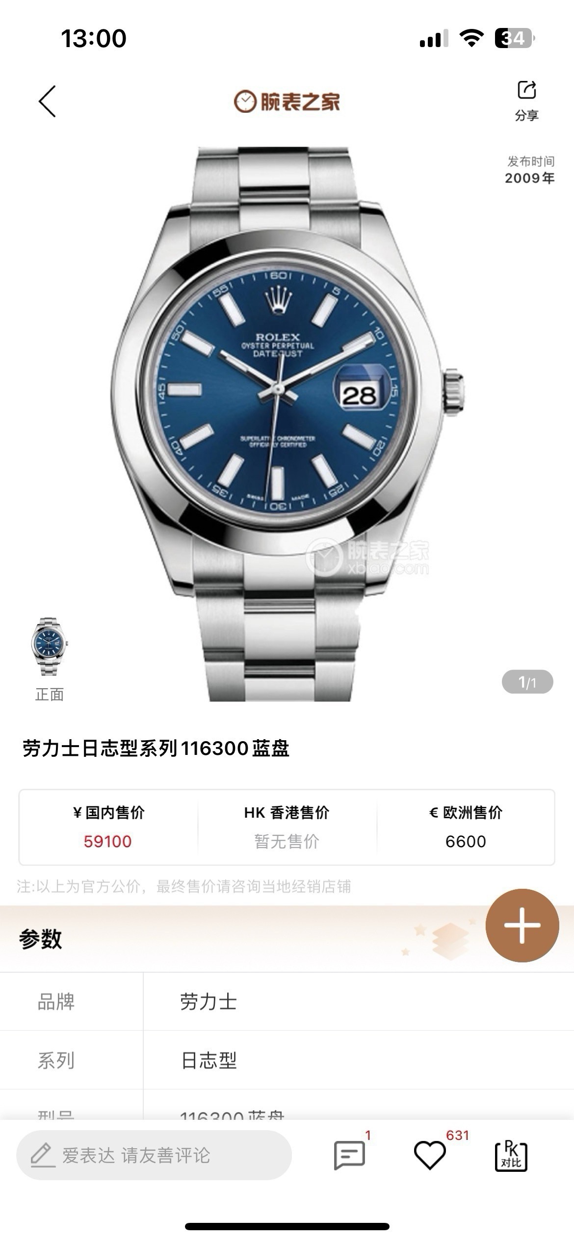 劳力士日志型116300蓝盘 自动机械 男士腕表 搭载3136机芯 不锈钢材质 表径41毫米 蓝色盘面 专柜价59100 全套~