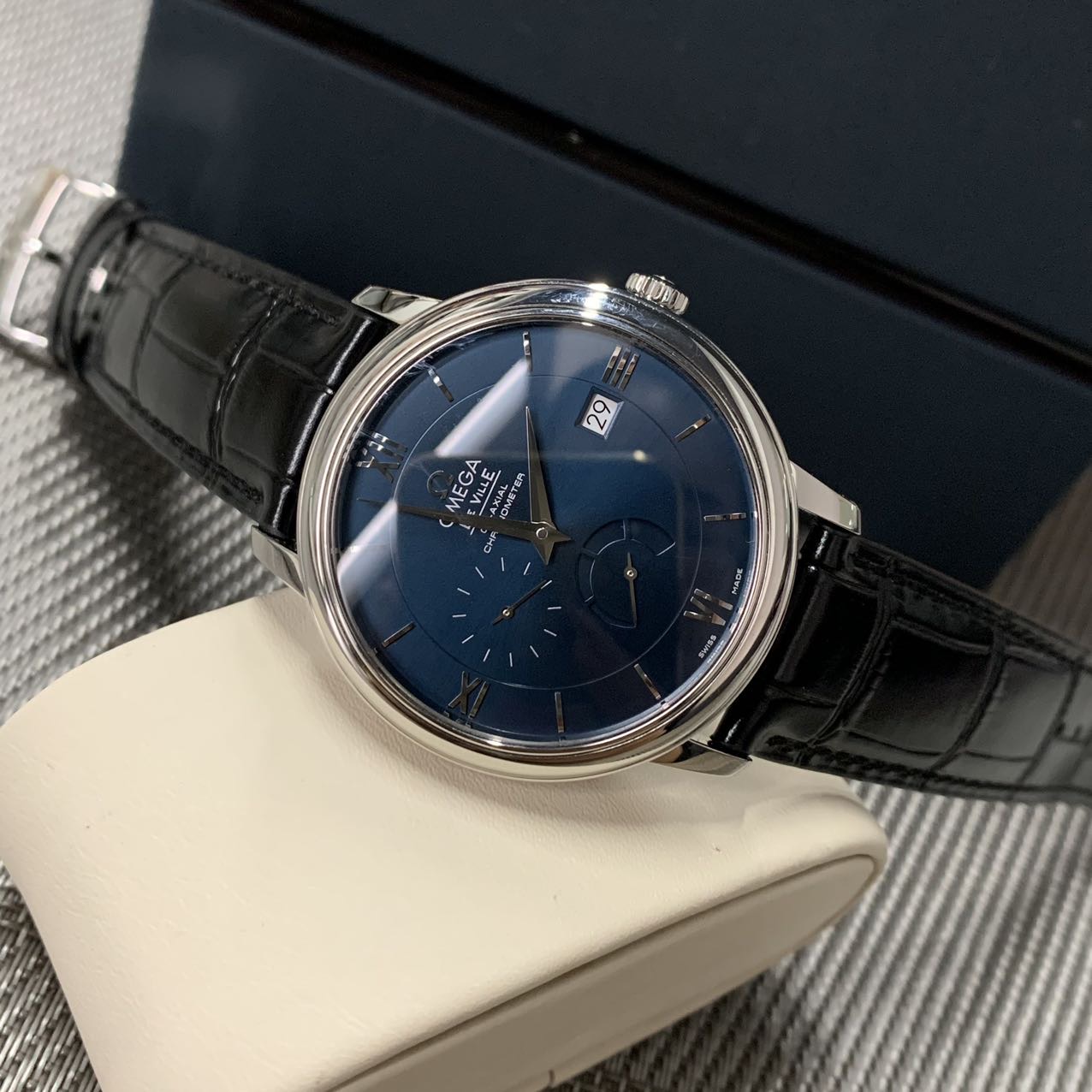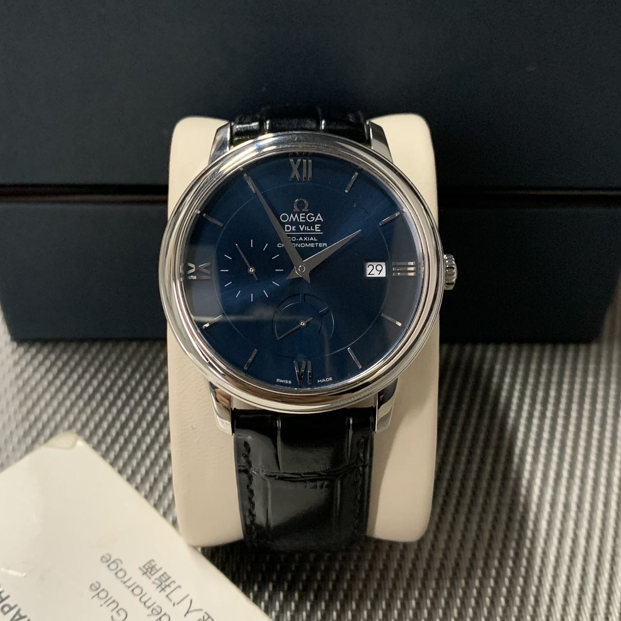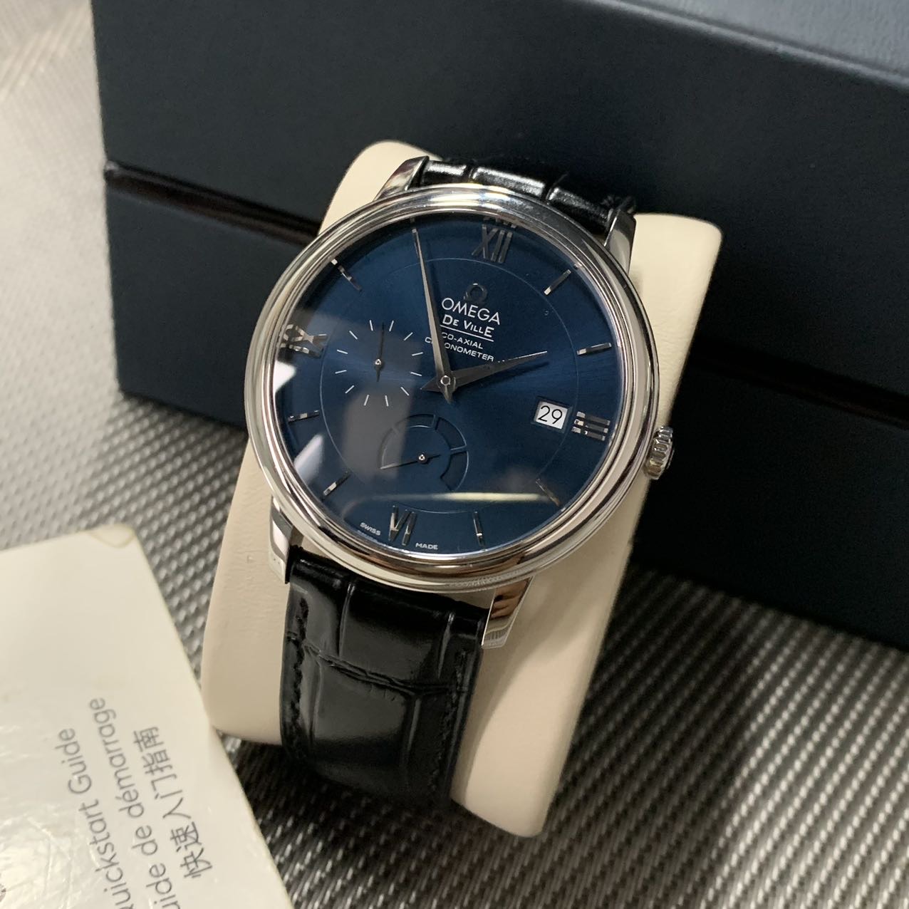 欧米茄碟飞动显款,公价3.7万,表径39.5mm,全套附件齐全 极品成色97新,靓丽蓝面,独立秒针设计 6点位动储显示,上手档次更高。