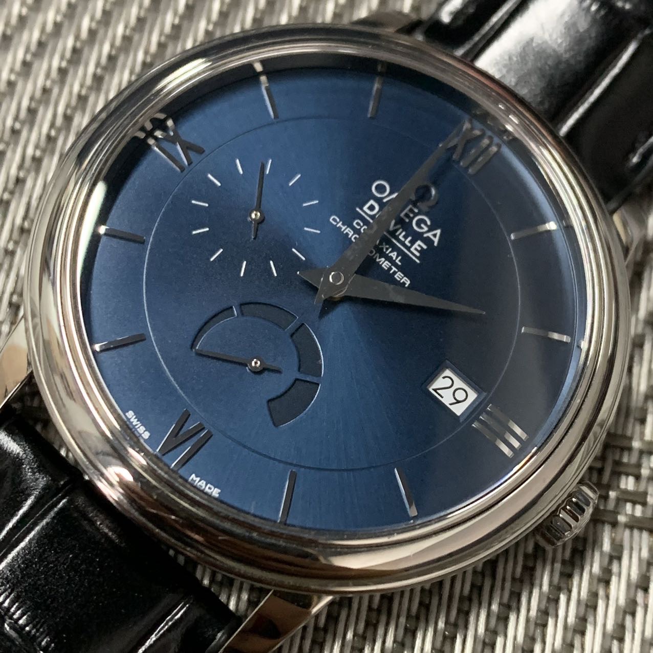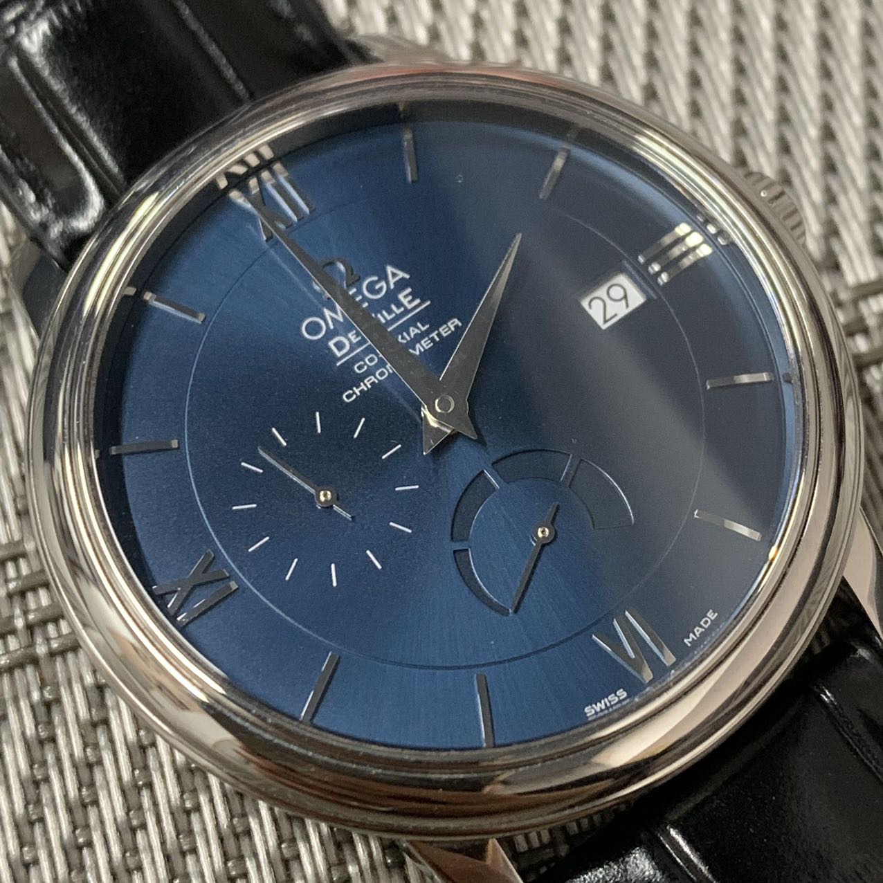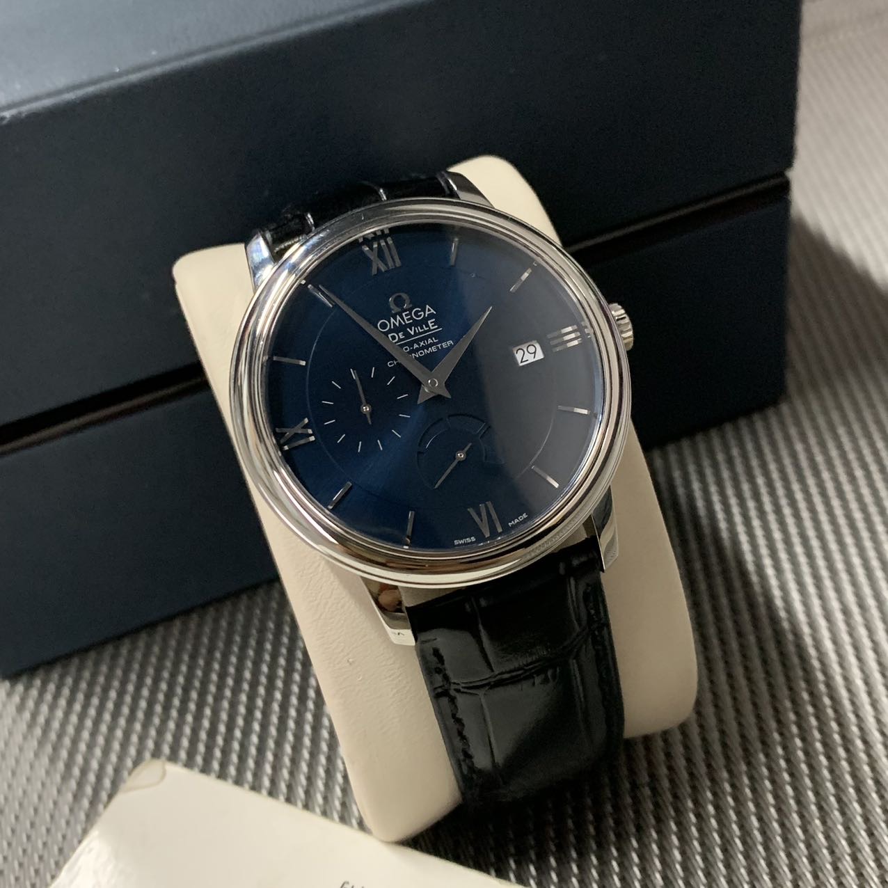欧米茄碟飞动显款,公价3.7万,表径39.5mm,全套附件齐全 极品成色97新,靓丽蓝面,独立秒针设计 6点位动储显示,上手档次更高。