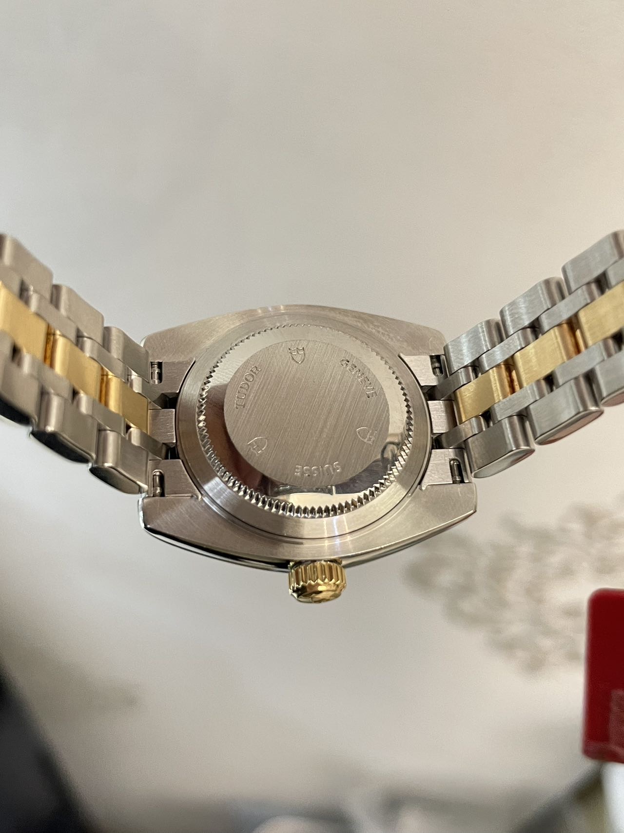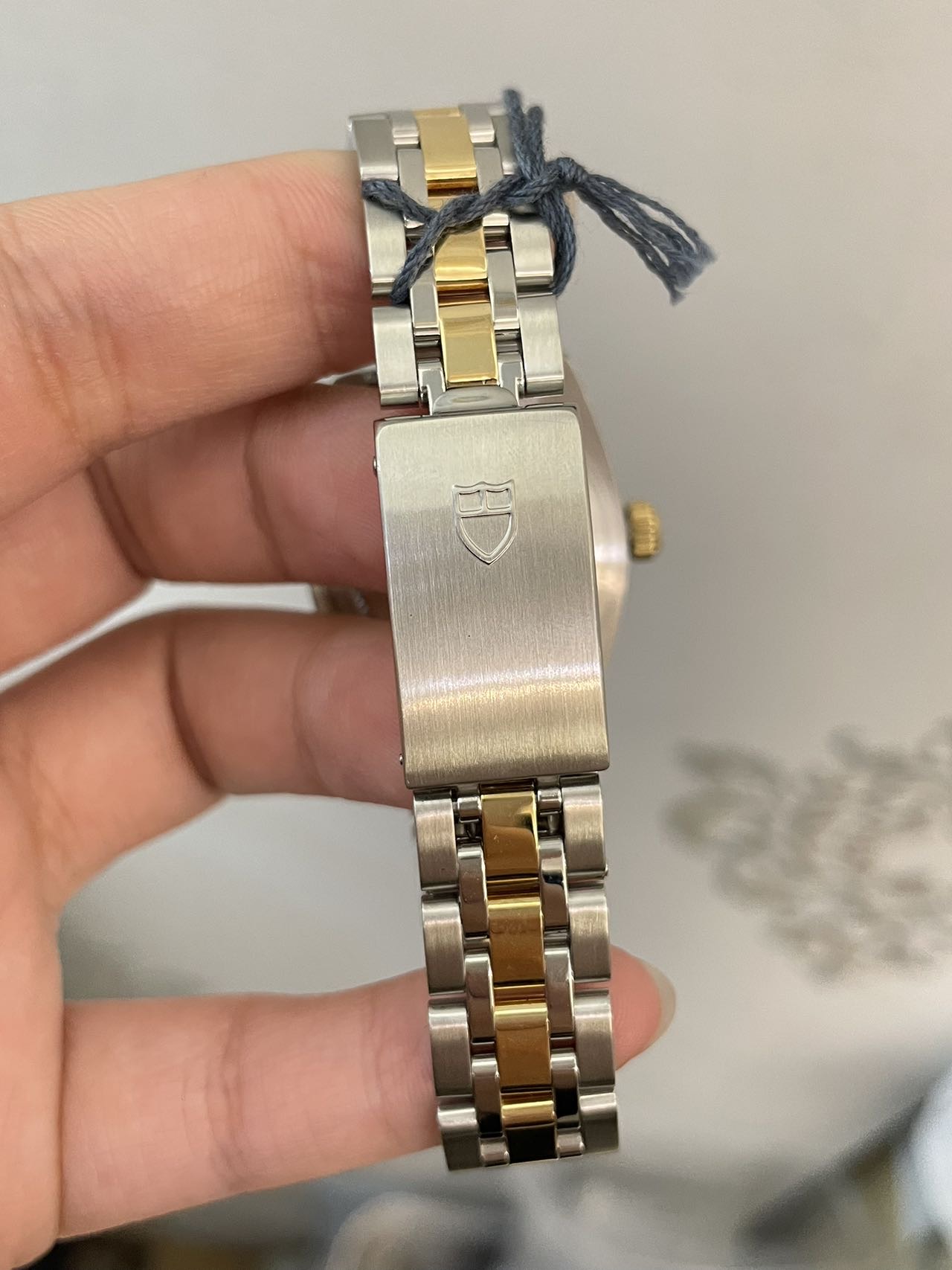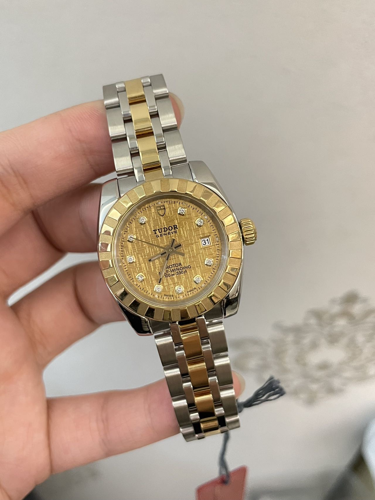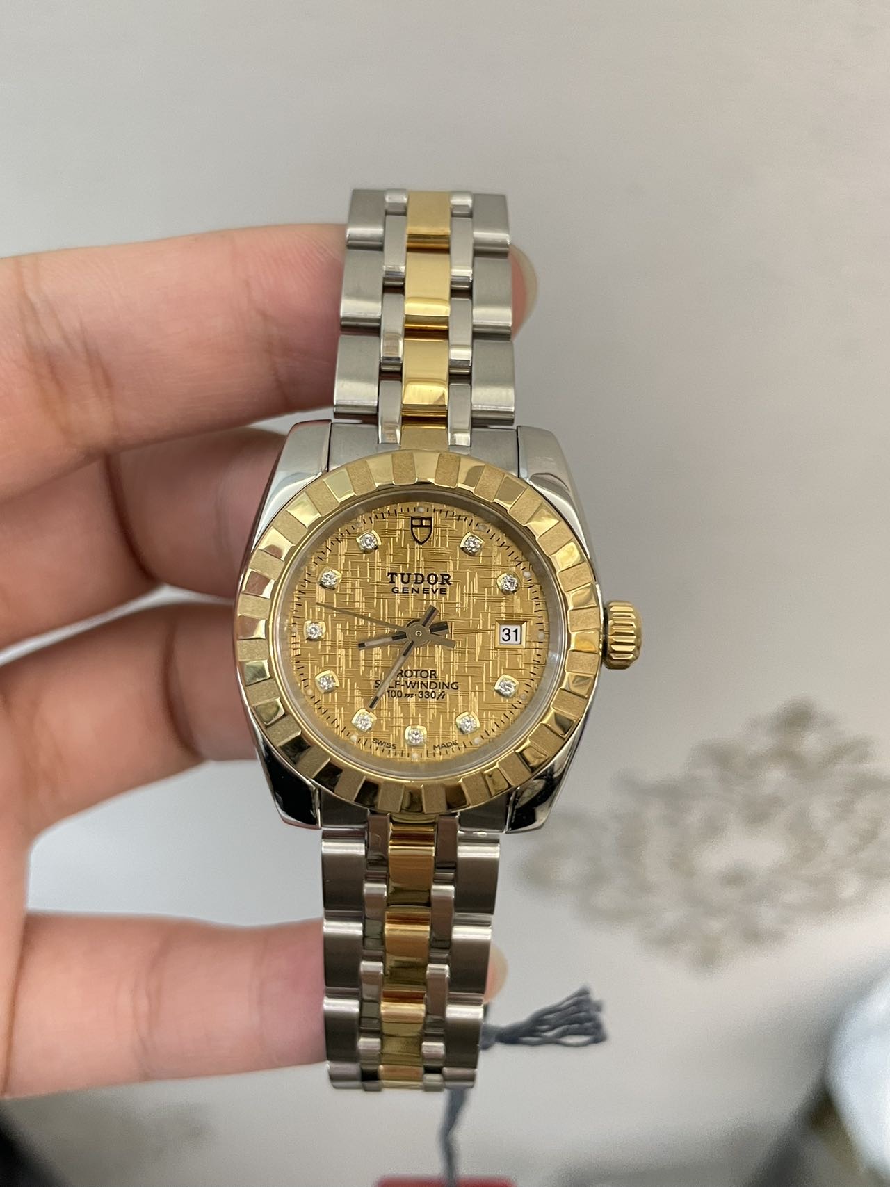 帝舵 经典系列22013 女士腕表 自动机械 间18K黄金材质 表径28mm 金布纹盘面 刻度镶钻 日期显示