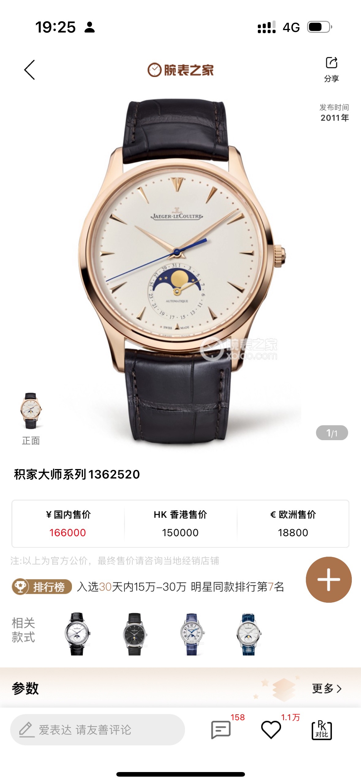积家/Jaeger LeCoultre 大师 Q1362520 自动机械 18k玫瑰金 39MM 专柜价 166000