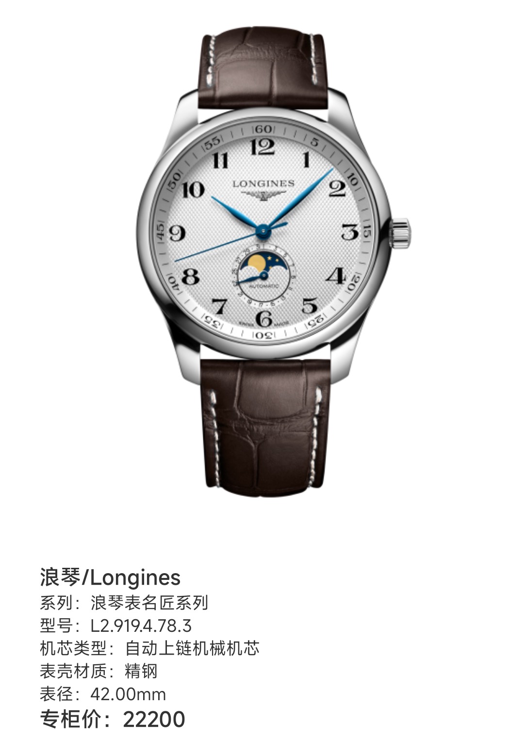 浪琴/Longines 浪琴表名匠系列 L2.919.4.78.3 自动上链机械机芯 精钢 42.00mm 专柜价22200