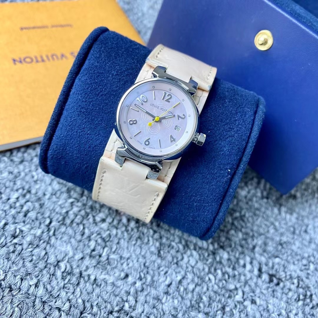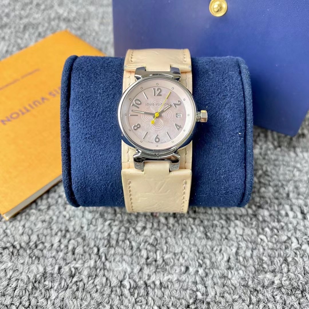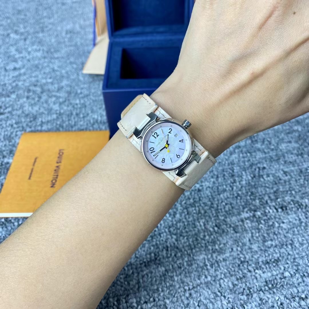 LV—路易威登石英女表,公价2.45万,表径28mm,单表,粉色贝母面表盘,金属阿拉伯刻度,手镯式表带设计,可随心更换。