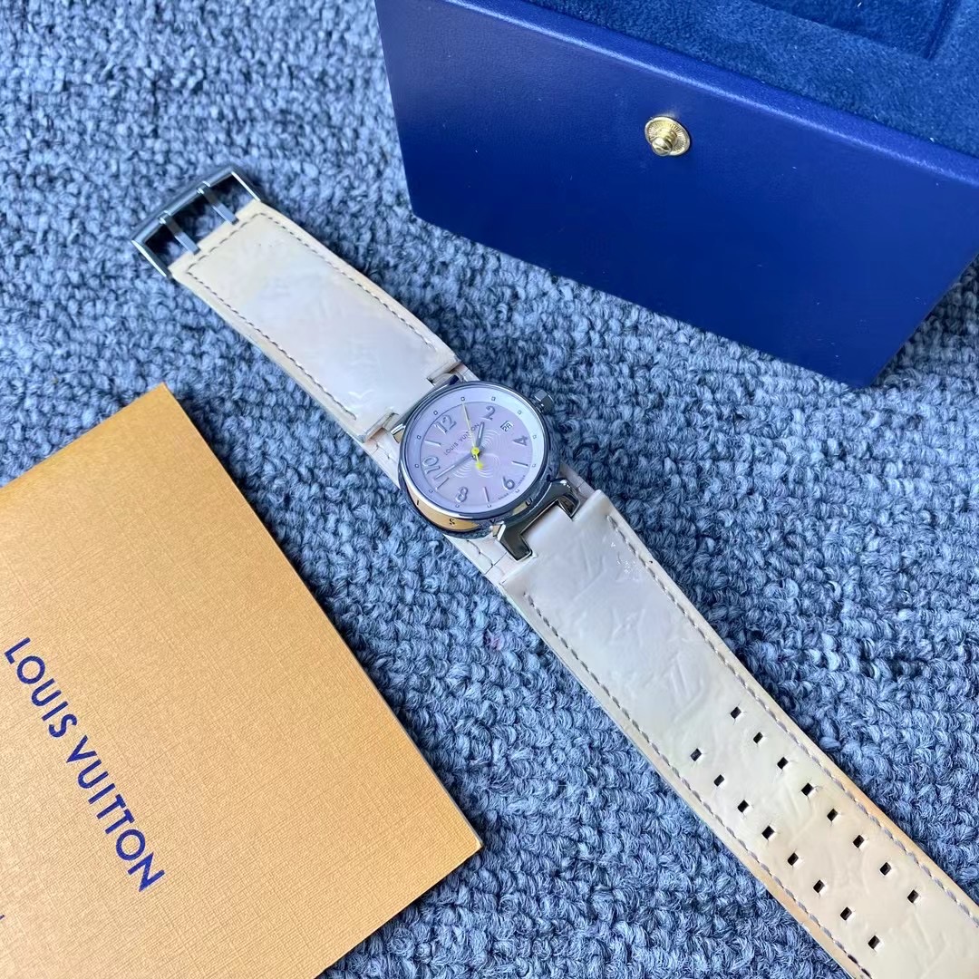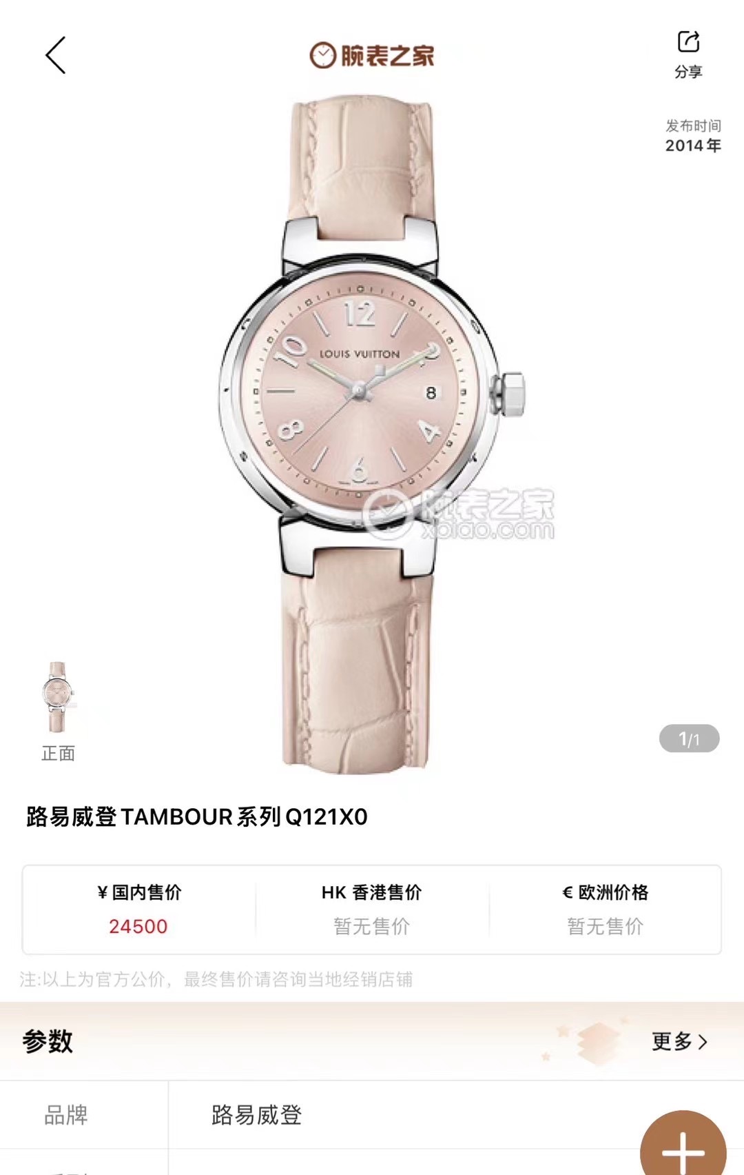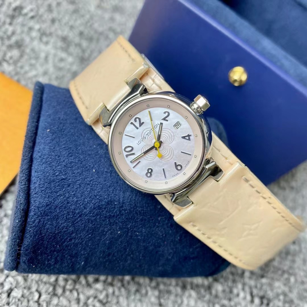 LV—路易威登石英女表,公价2.45万,表径28mm,单表,粉色贝母面表盘,金属阿拉伯刻度,手镯式表带设计,可随心更换。