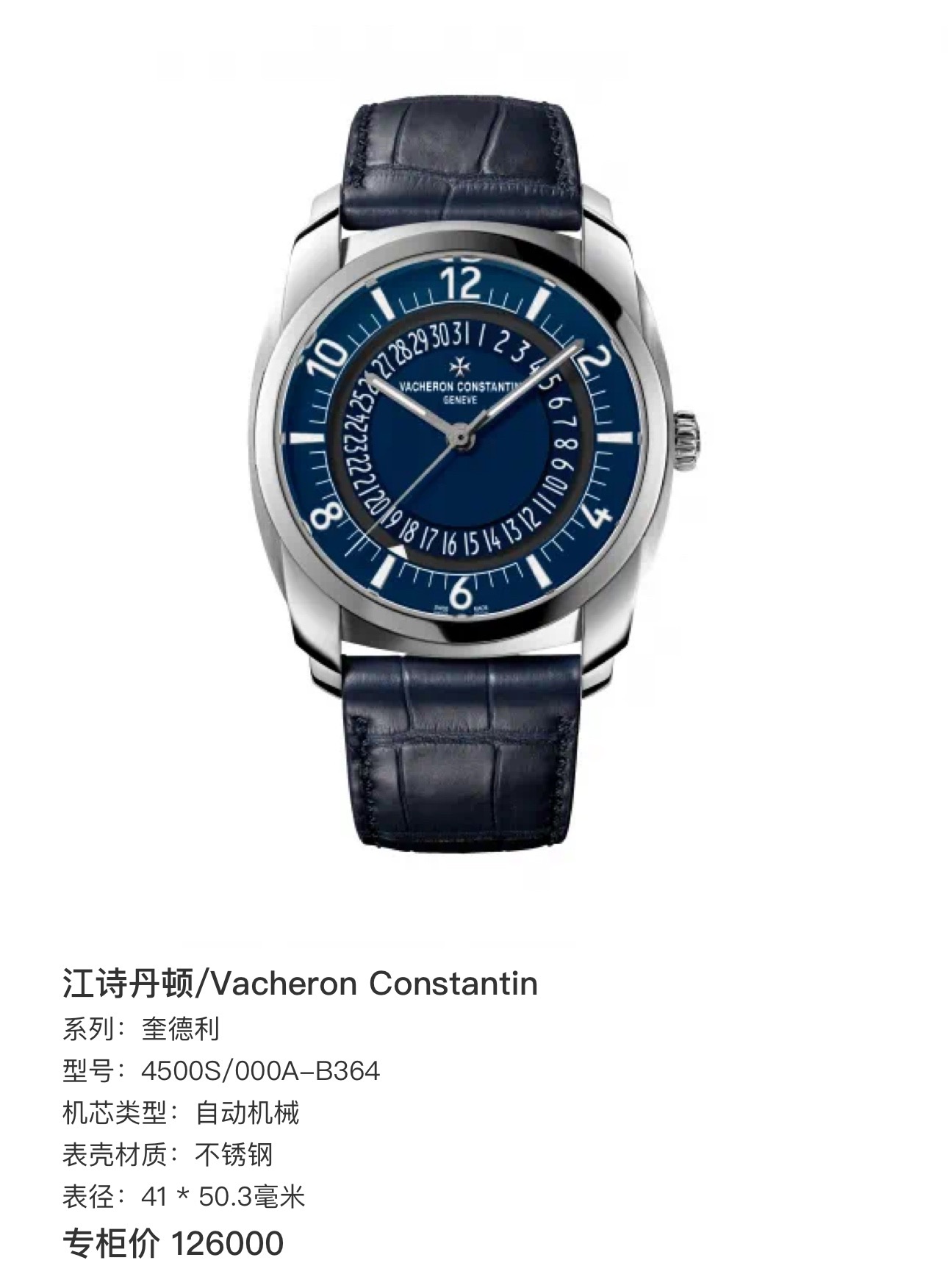 江诗丹顿/Vacheron Constantin 奎德利 4500S/000A-B364 自动机械 不锈钢 41 * 50.3毫米 专柜价 126000~