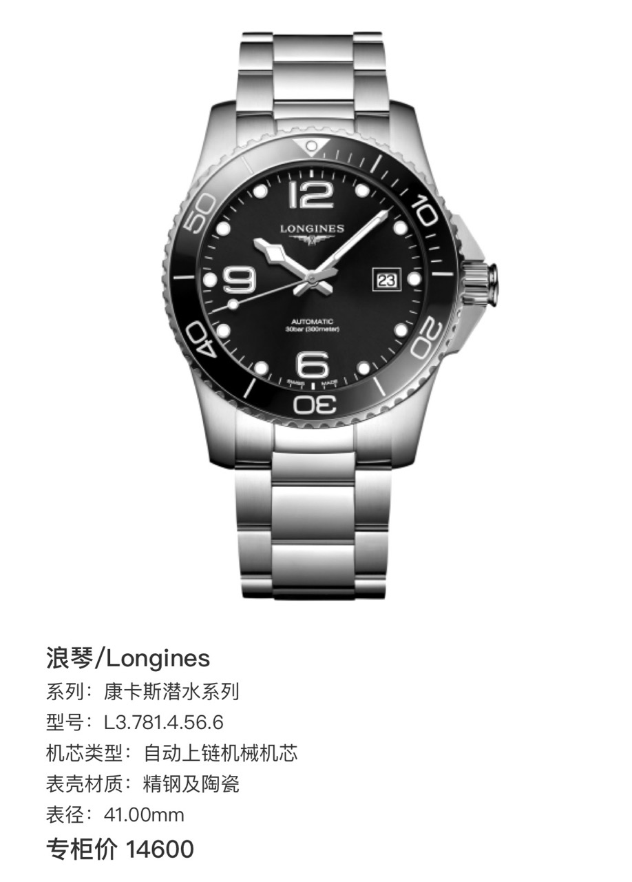 浪琴/Longines 康卡斯潜水系列 L3.781.4.56.6 自动上链机械机芯 精钢及陶瓷 41.00mm 专柜价 14600