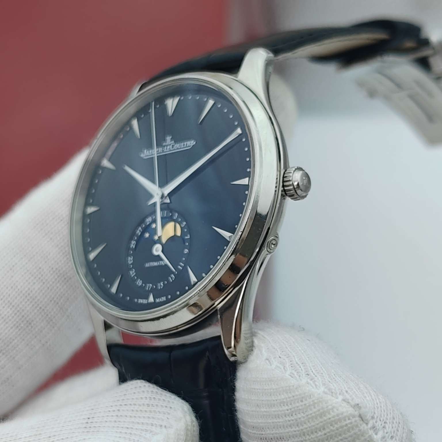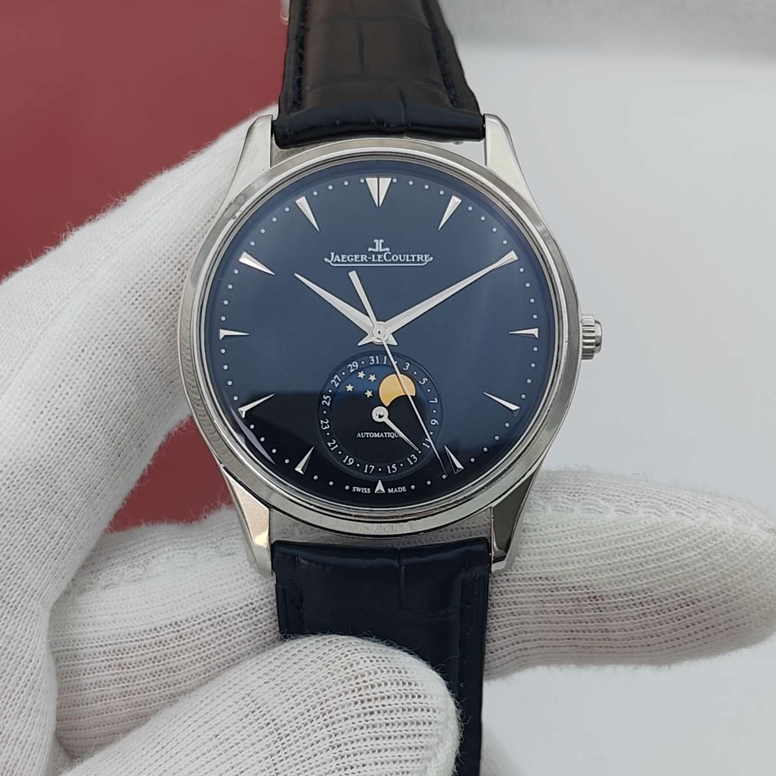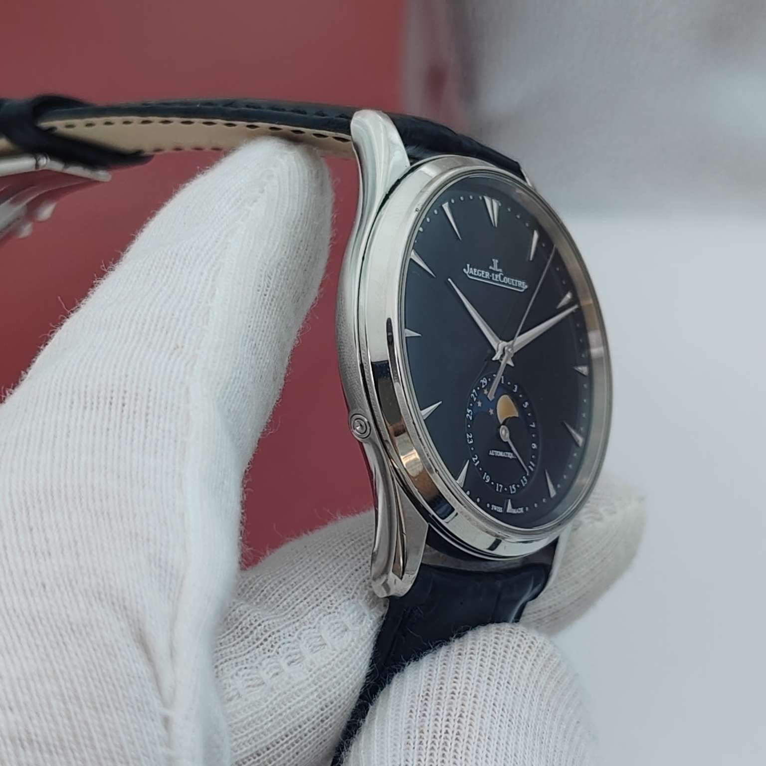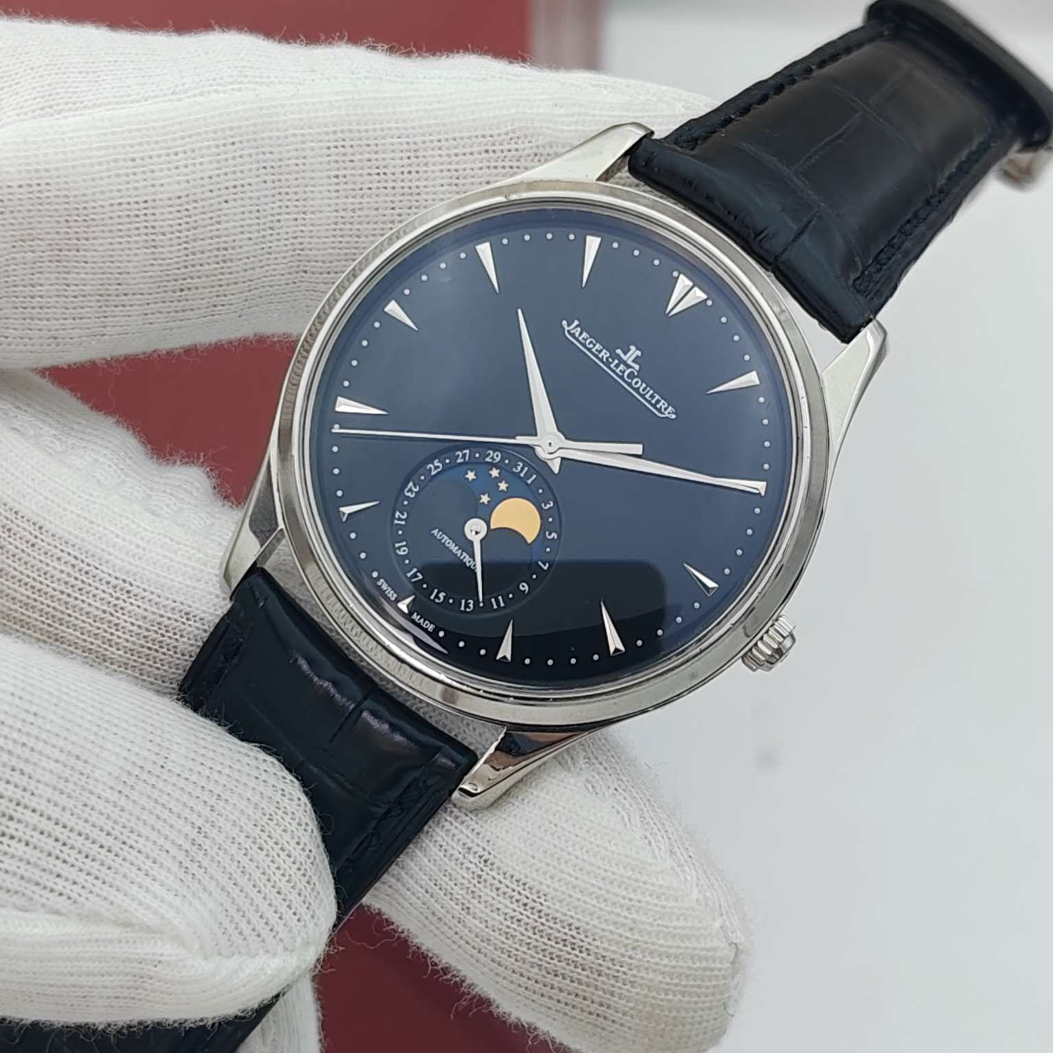 积家大师系列1368470,最美大三针黑面月相款,超薄设计,6点位迷人月相功能,正装典范,保值热款,39mm表径,自动机械机芯,新款k金陀片,折叠扣,专柜售价80000,