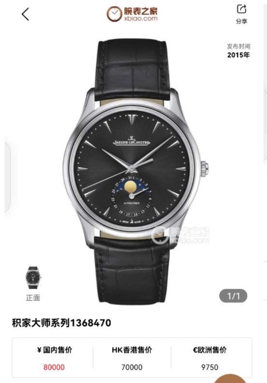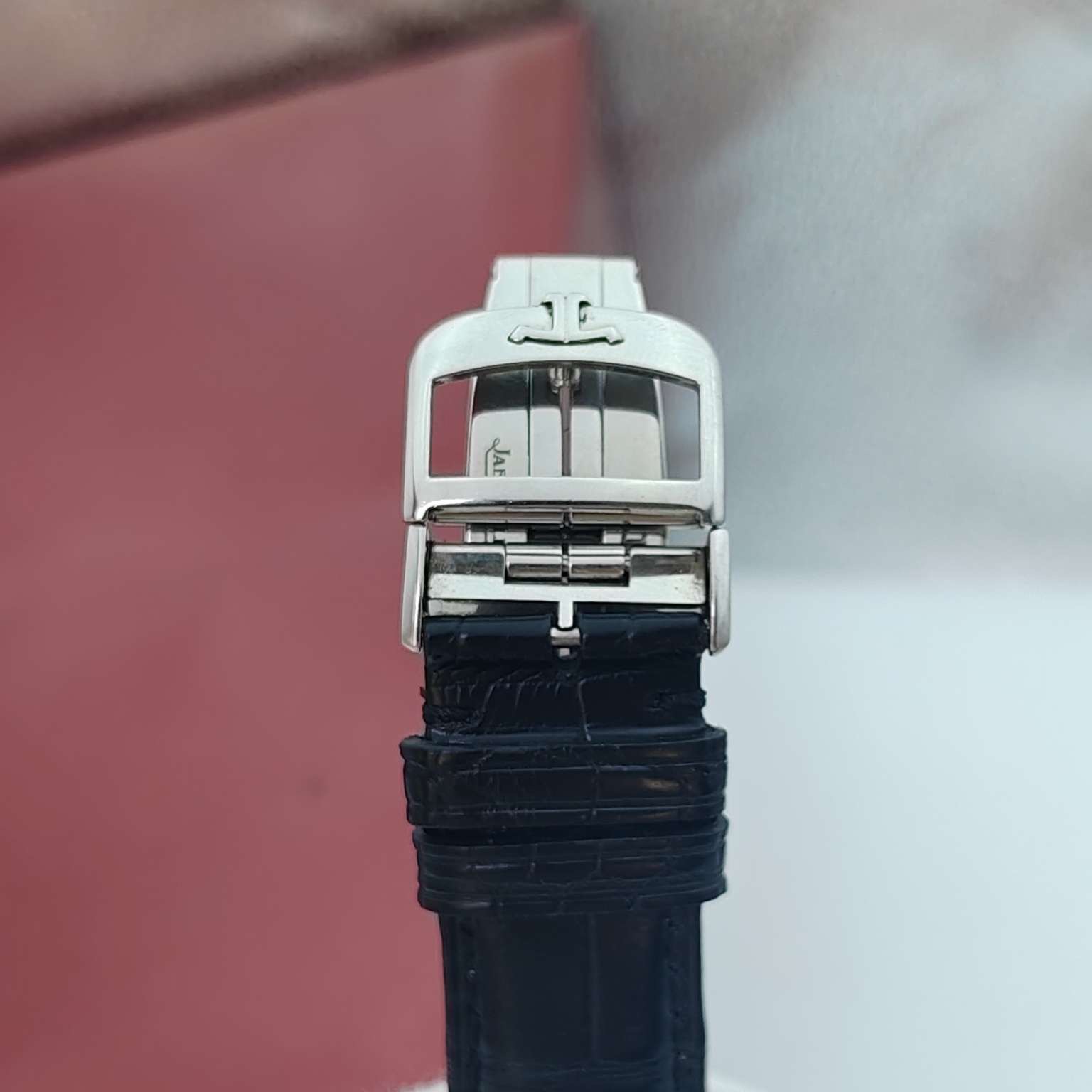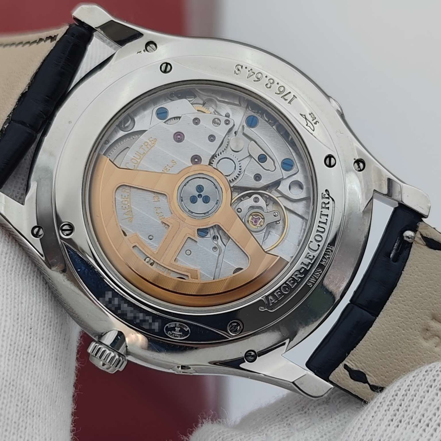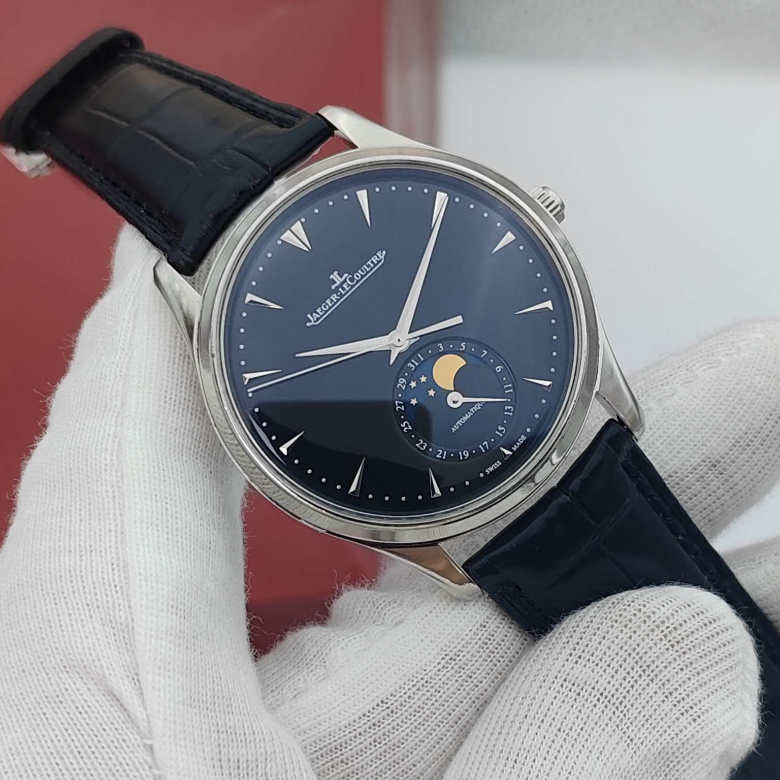 积家大师系列1368470,最美大三针黑面月相款,超薄设计,6点位迷人月相功能,正装典范,保值热款,39mm表径,自动机械机芯,新款k金陀片,折叠扣,专柜售价80000,