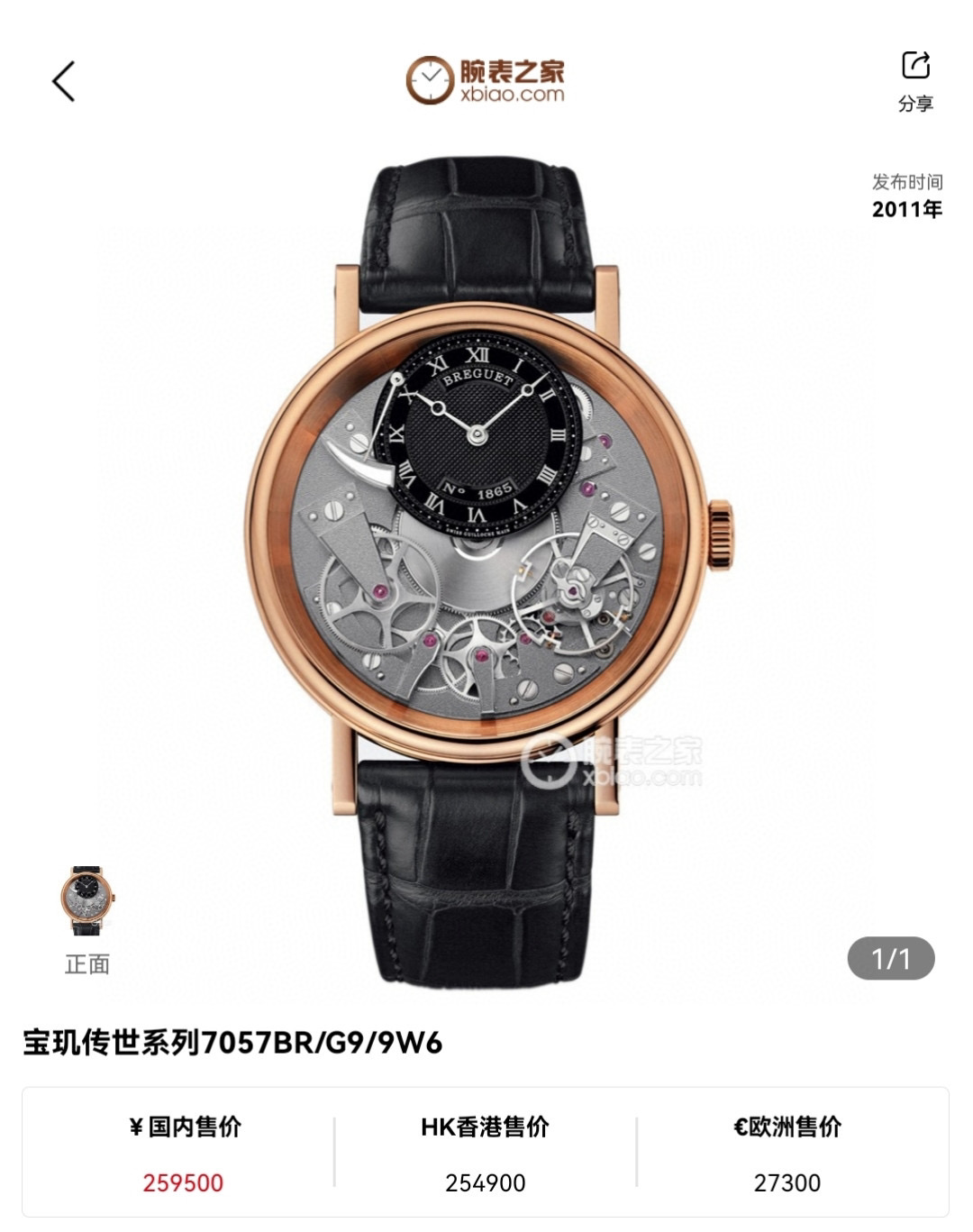 宝玑传世系列7057BR/G9/9W6,18年二手全套,