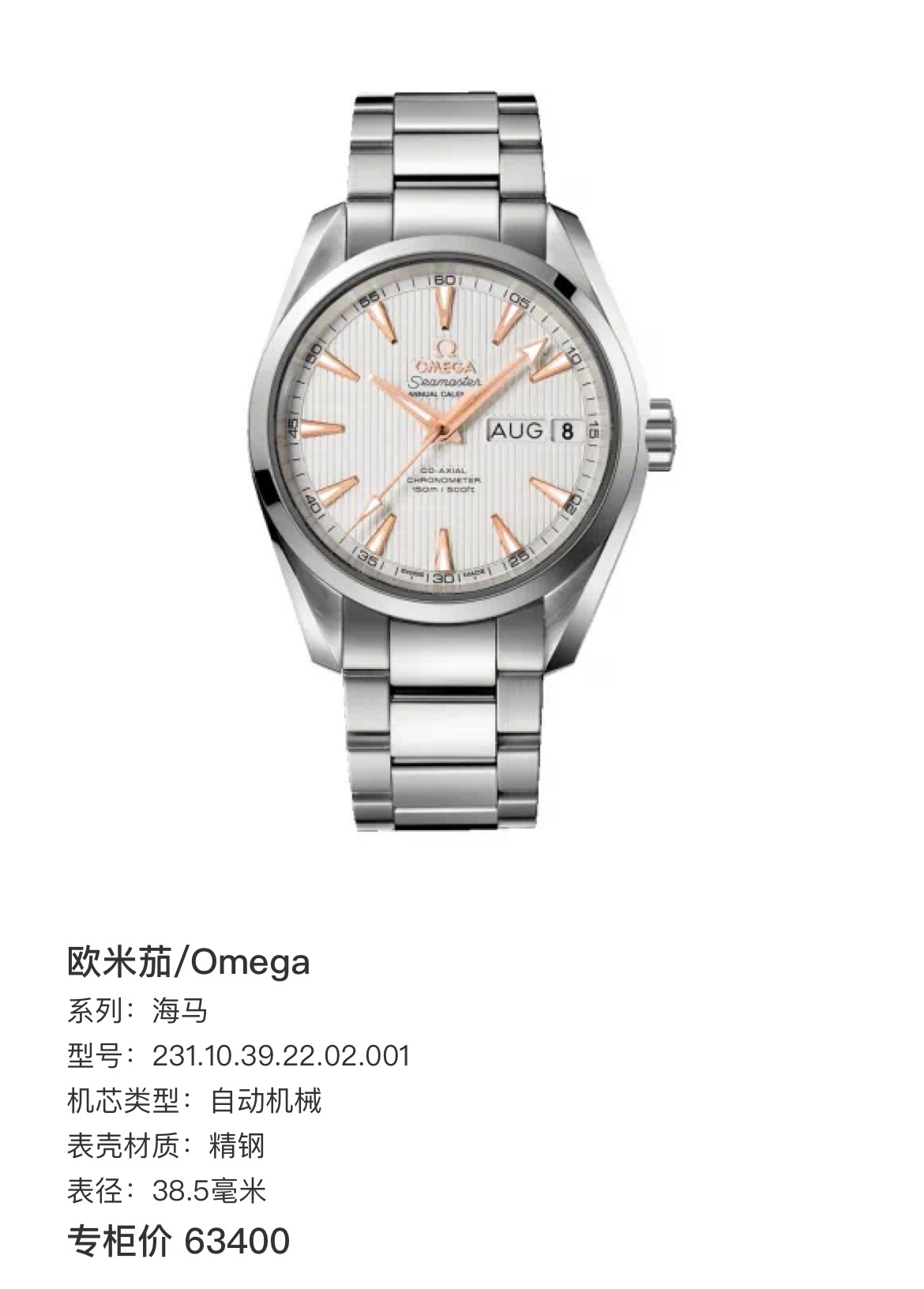 欧米茄/Omega 海马 231.10.39.22.02.001 自动机械 精钢 38.5毫米 专柜价63400。