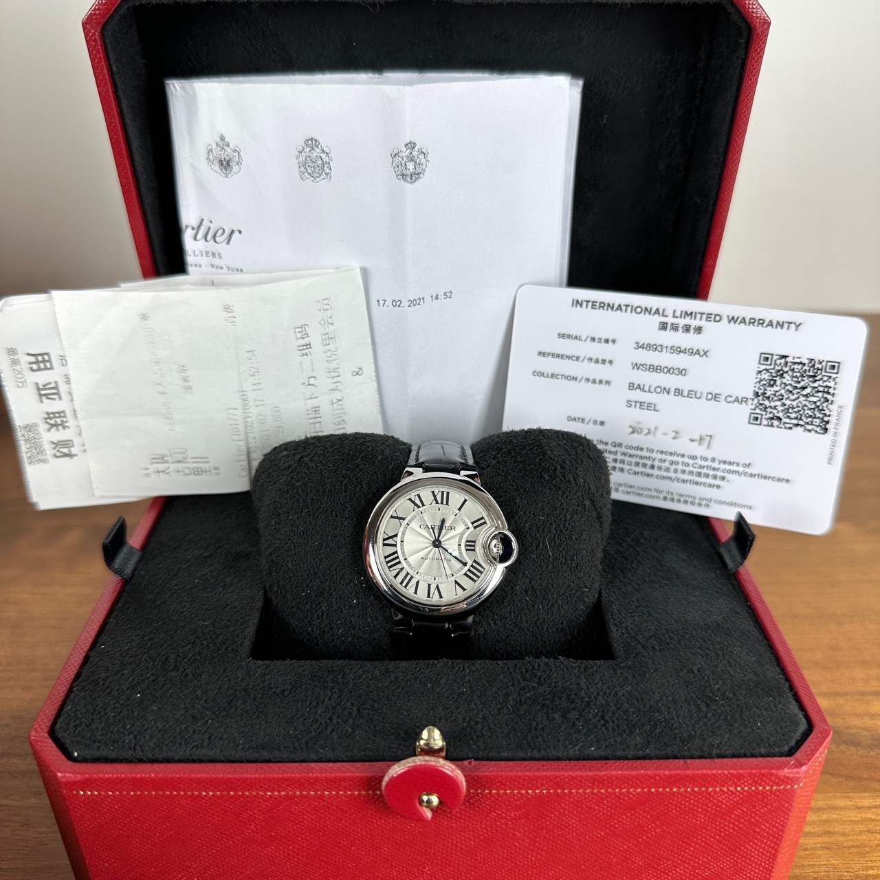 卡地亚蓝气球系列WSBB0030女士自动机械腕表,33表径,经典蓝气球,女神必备款。21年大全套,新款折叠扣,已经延长保修到2029年,整体成色95新。国内公价44500