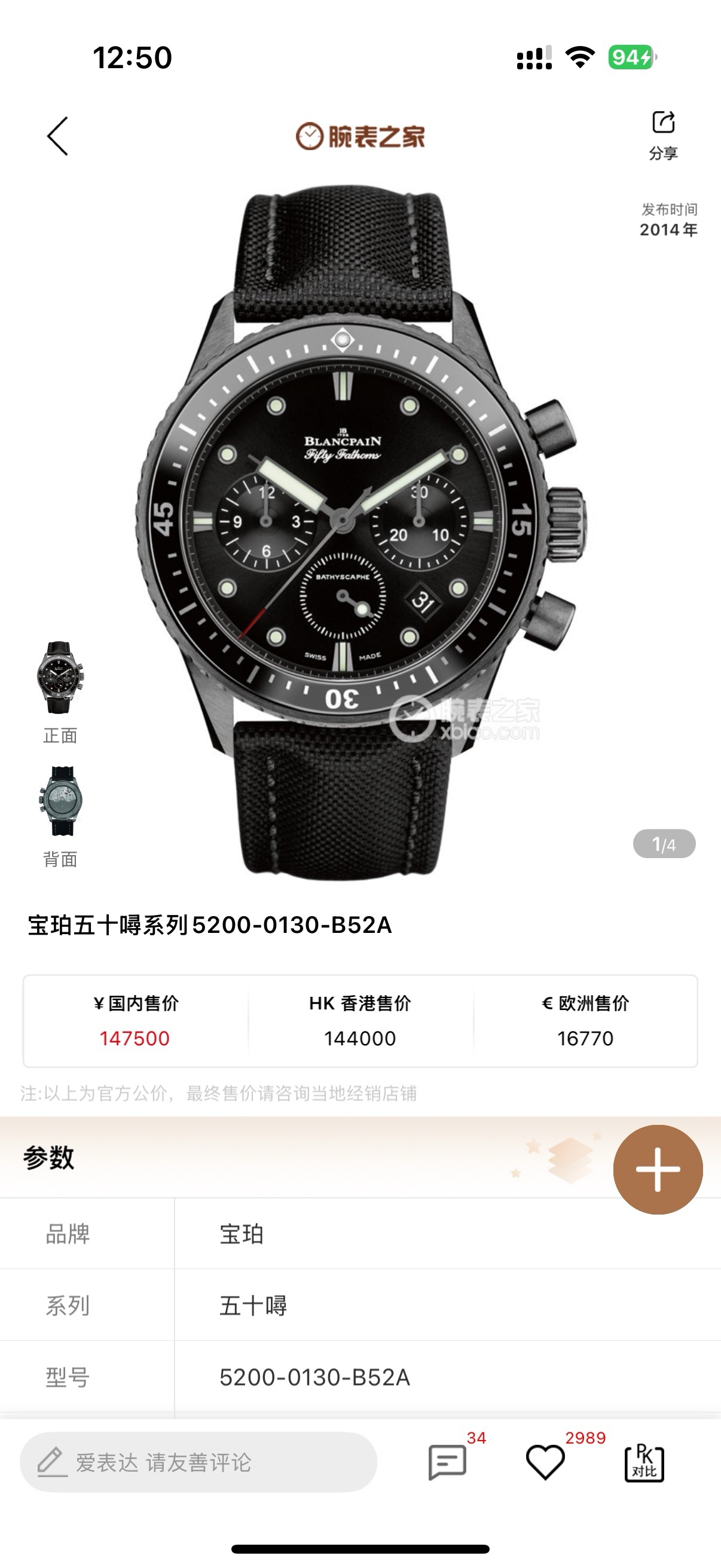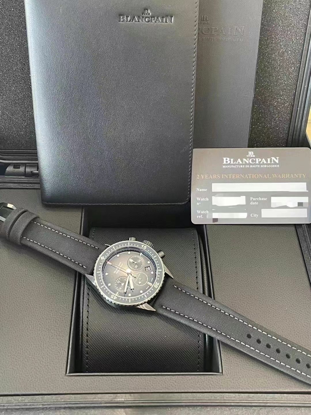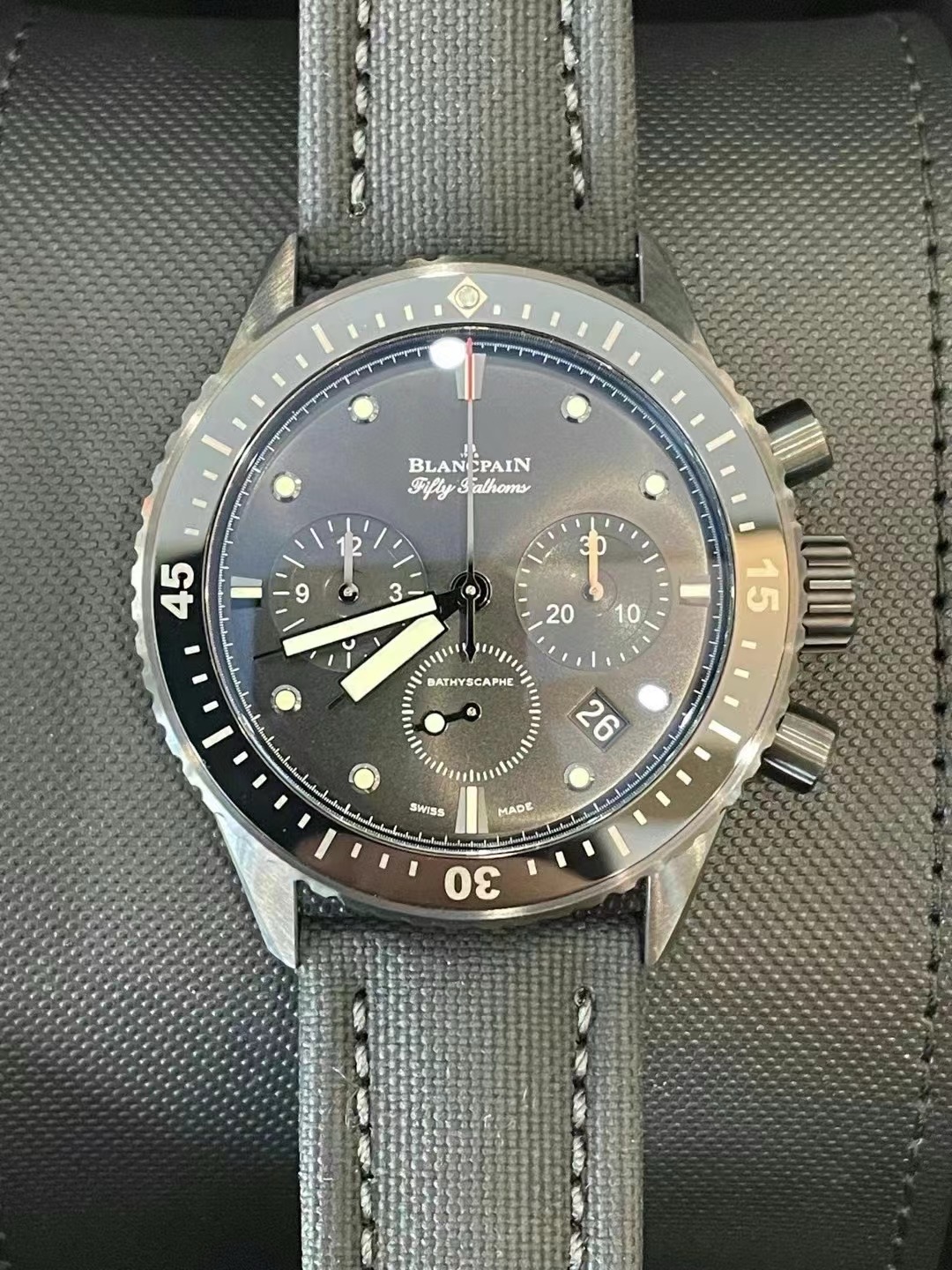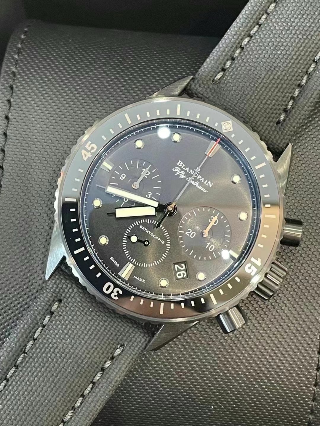 宝珀五十噚5200-0130-B52A男表机械腕表,磨砂黑陶瓷计时款,表径43.6mm,日期显示、计时功能,海航帆布表带,专柜133500,