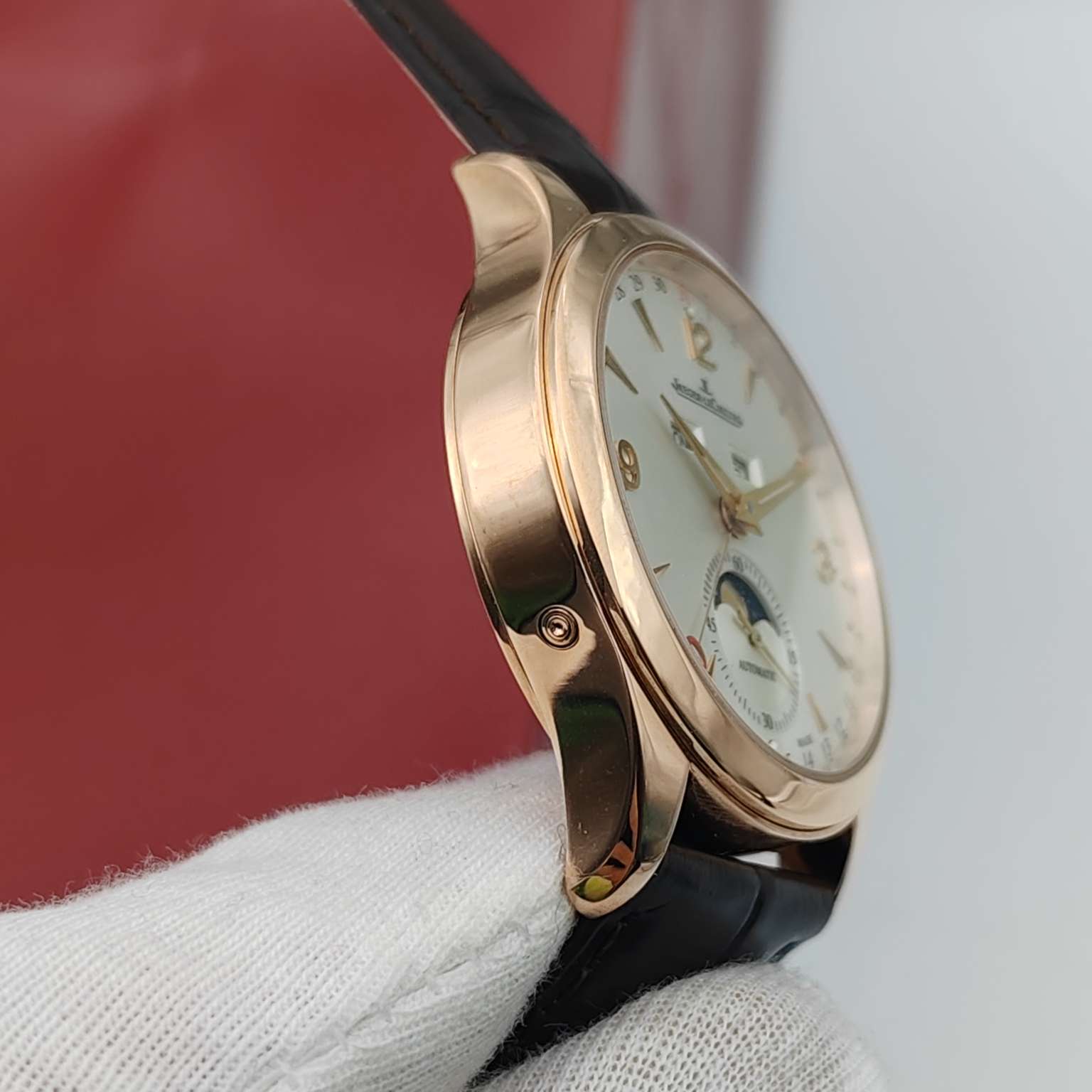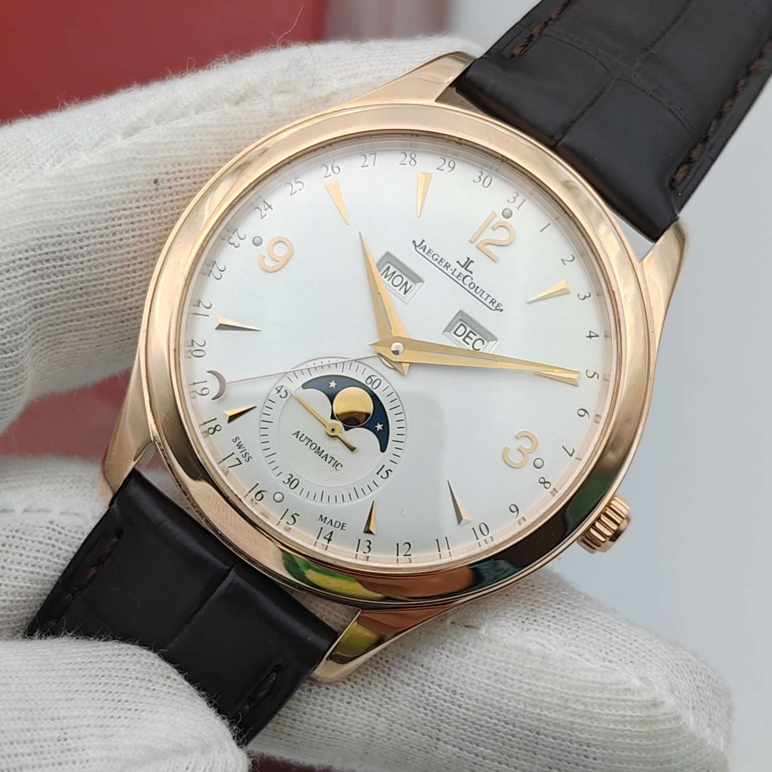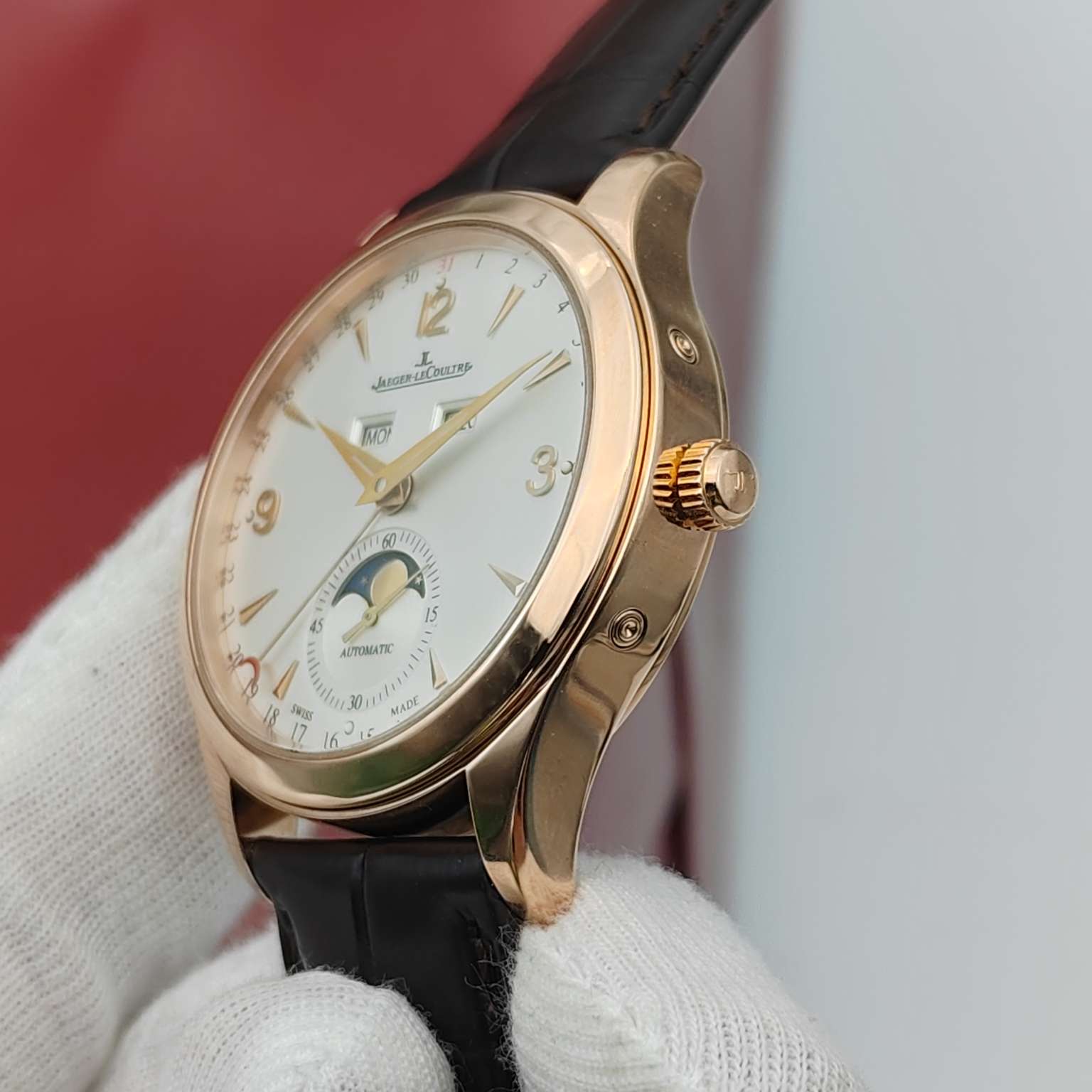 积家大师系列1552520男士机械腕表,18K玫瑰金材质,39mm表径,全年历,日期、星期、月份,月相功能,自动机械透底,经典热门款,专柜售价170000