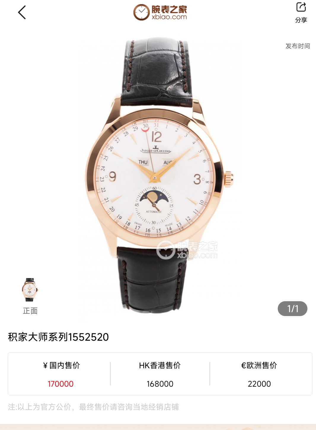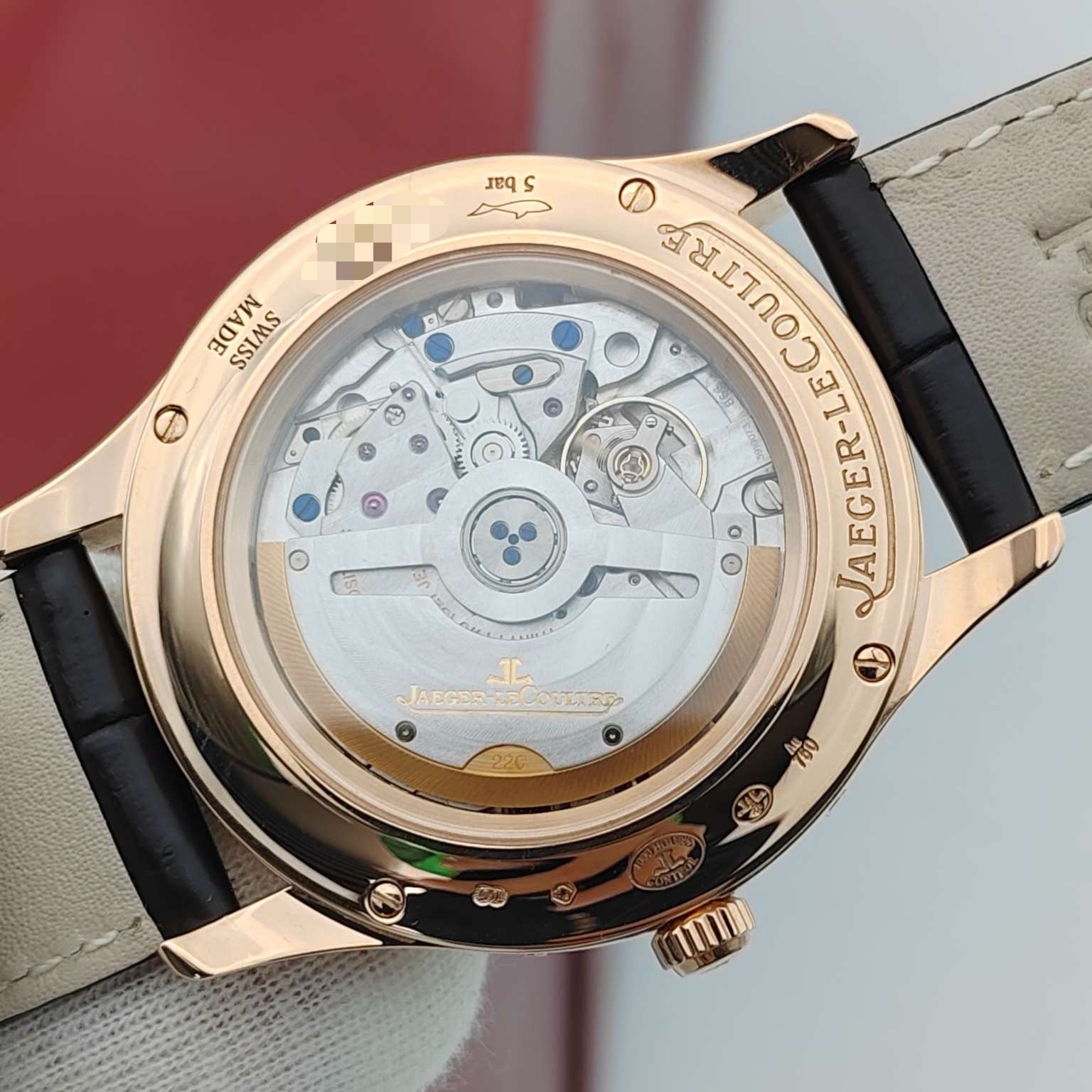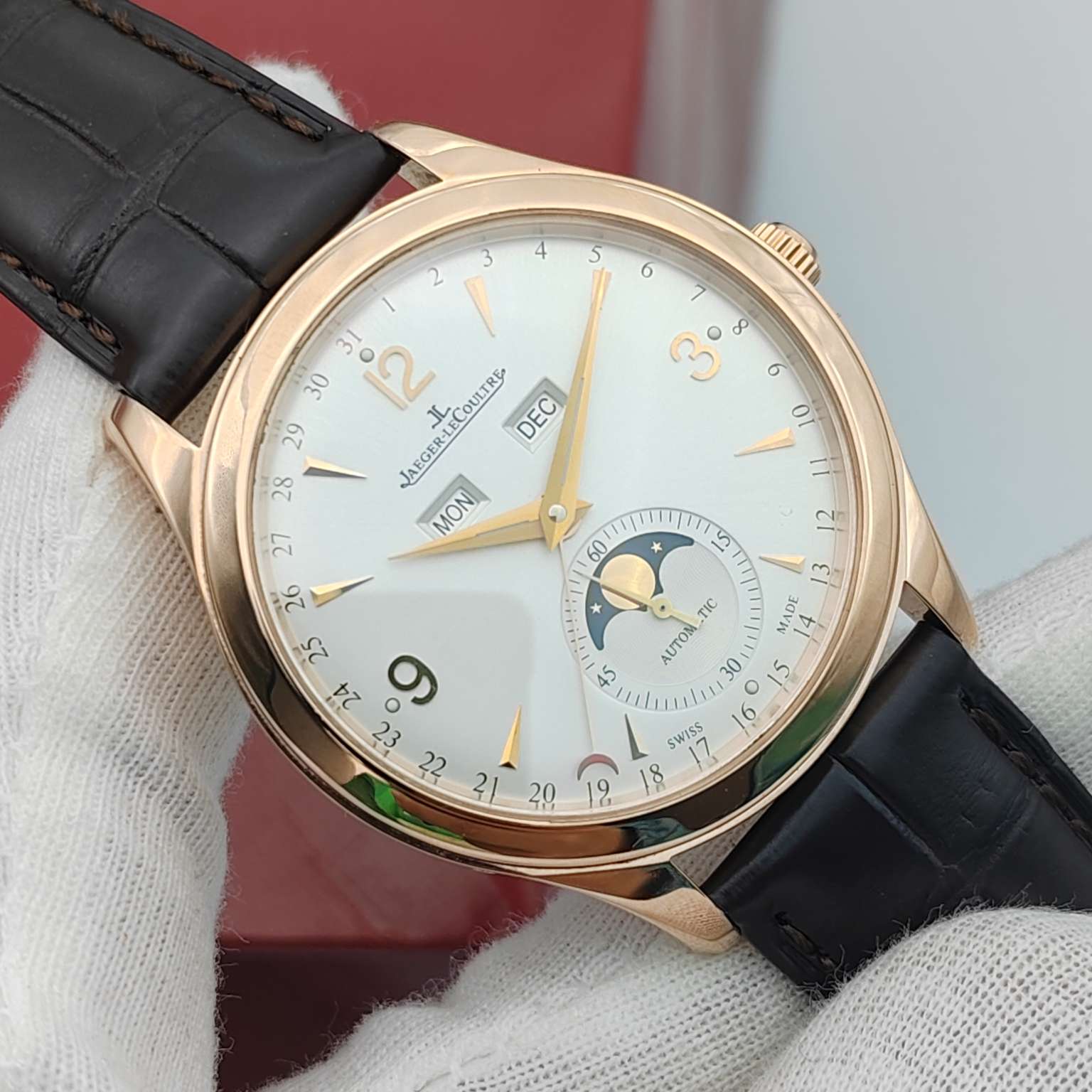 积家大师系列1552520男士机械腕表,18K玫瑰金材质,39mm表径,全年历,日期、星期、月份,月相功能,自动机械透底,经典热门款,专柜售价170000