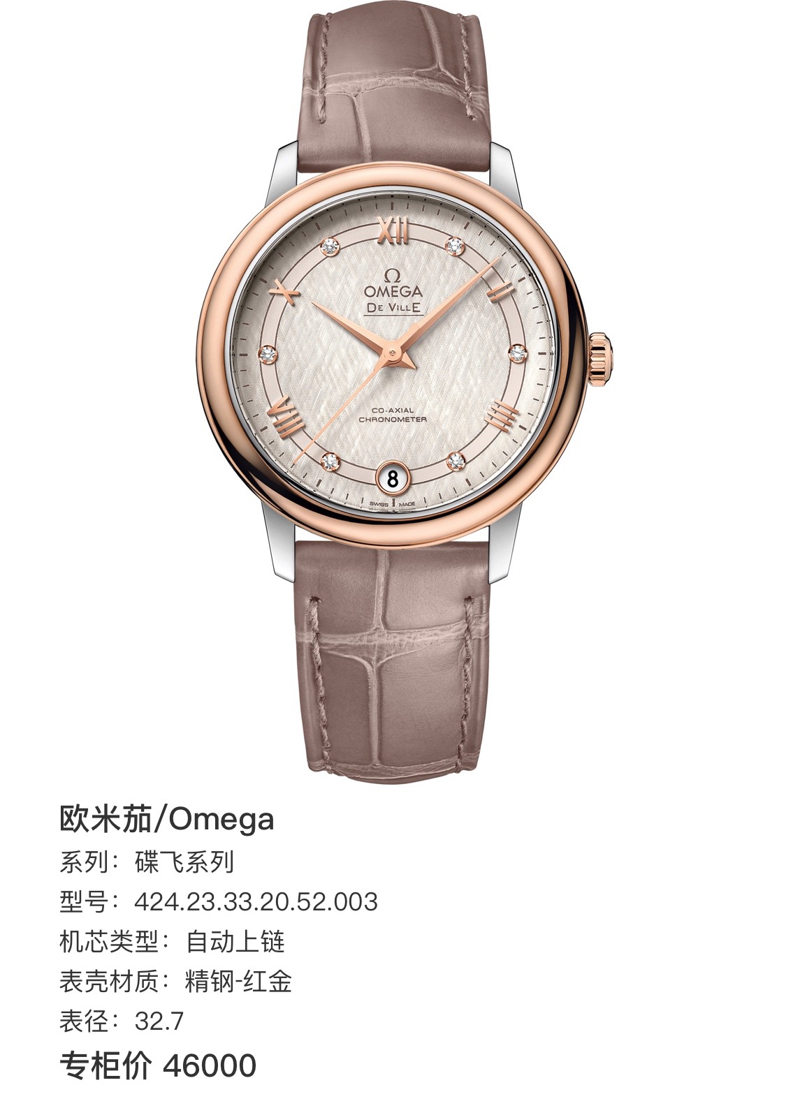 欧米茄/Omega 碟飞系列 424.23.33.20.52.003 自动上链 精钢‑红金 32.7 附件:全套 专柜价46000