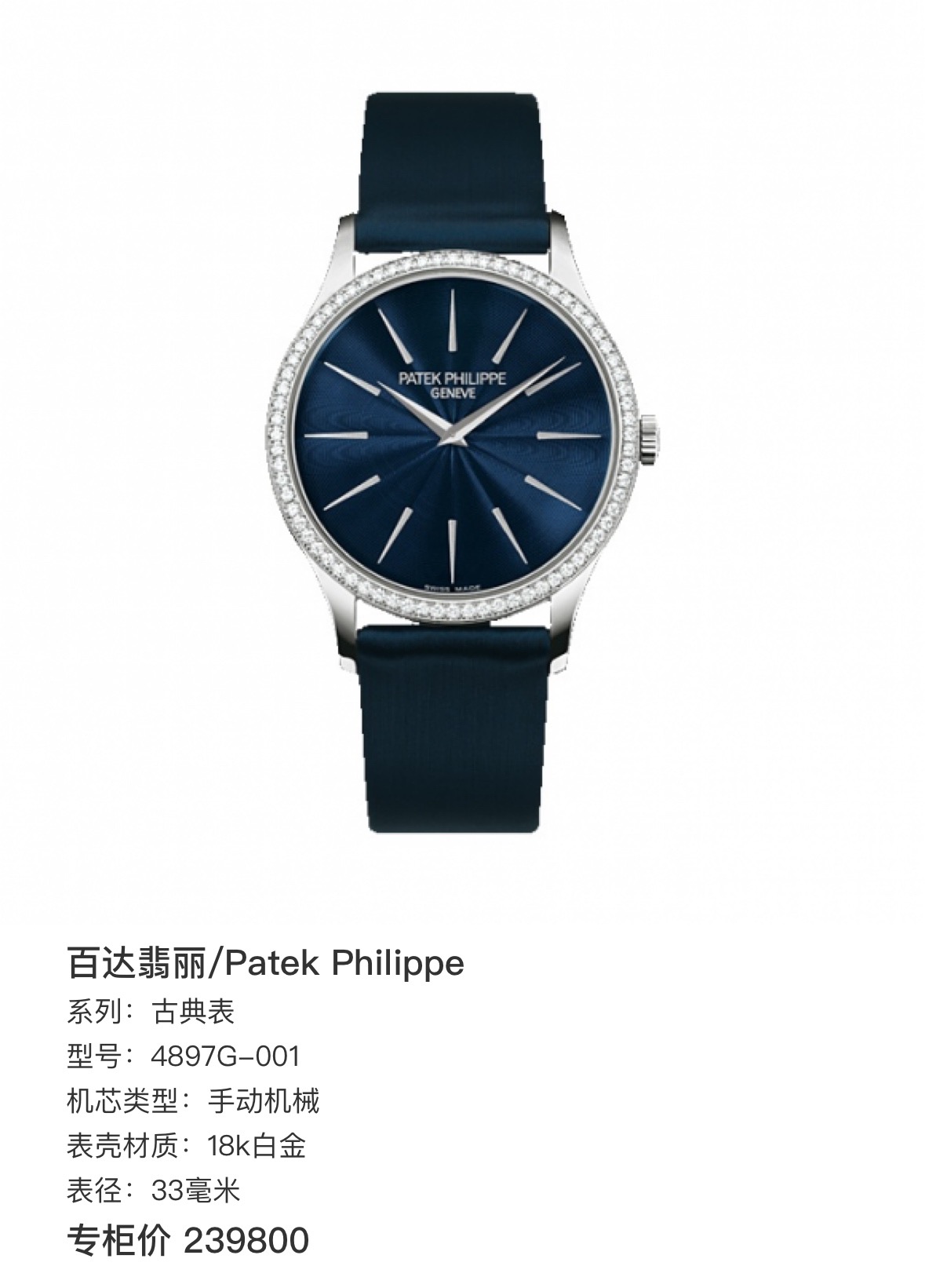 百达翡丽/Patek Philippe 古典表 4897G-001 手动机械 18k白金 33毫米 ~