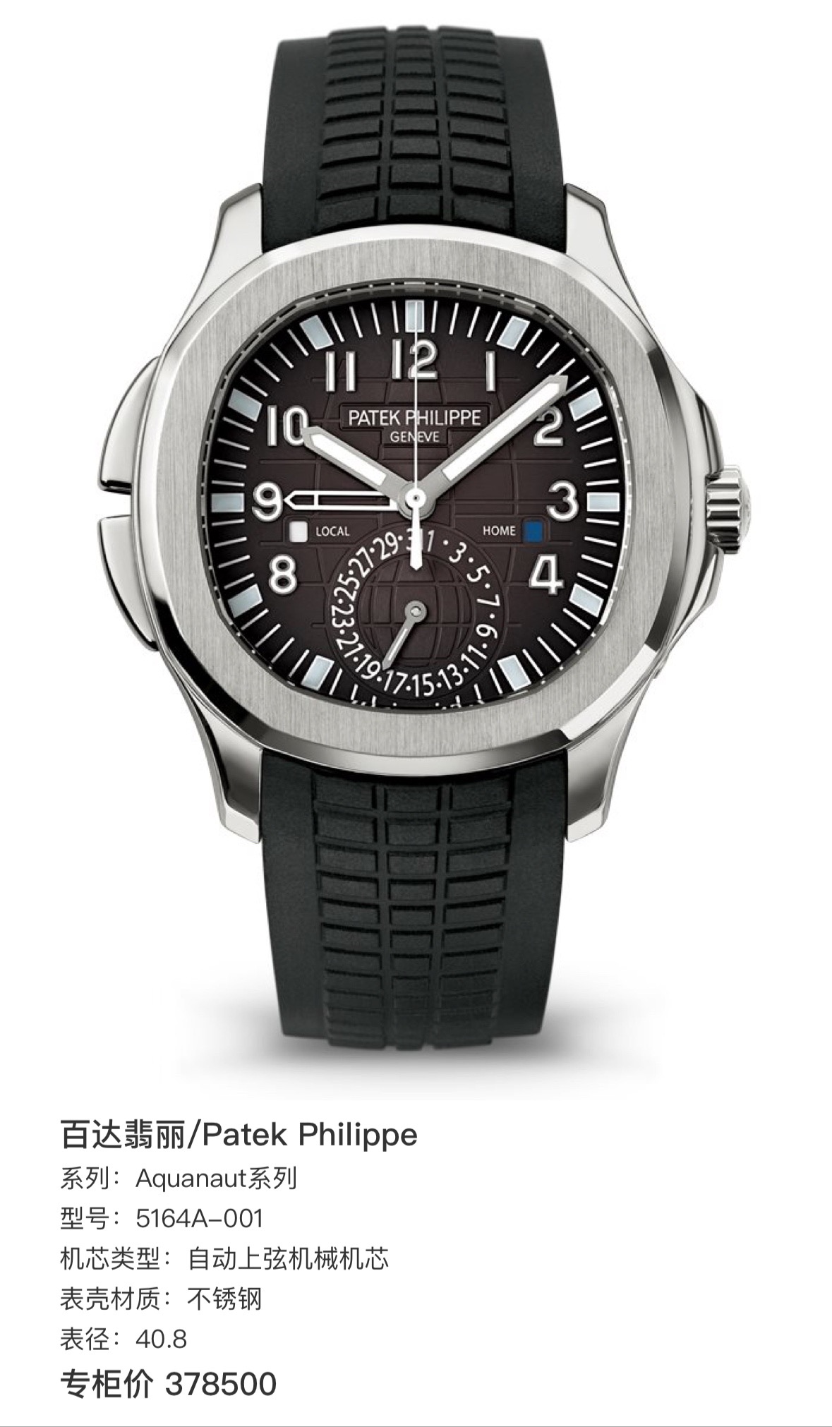 百达翡丽/Patek Philippe Aquanaut系列 5164A-001 自动上弦机械机芯 不锈钢 40.8 专柜价378500