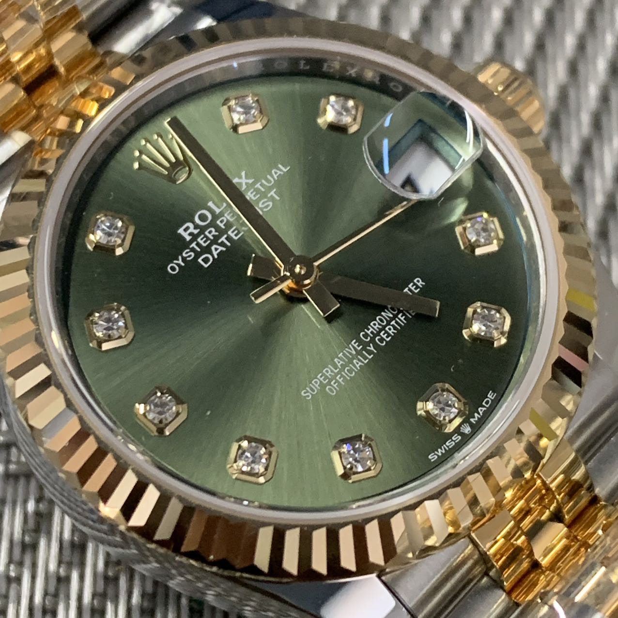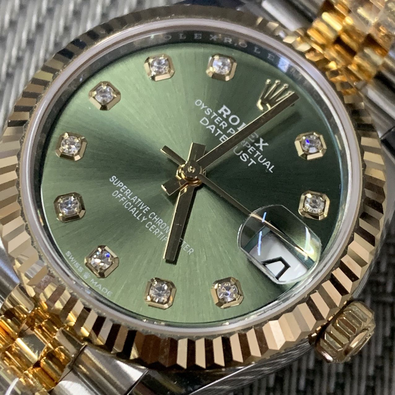 劳力士女装日志278273,公价118700元,表径31mm,全新未使用品,18K黄金相间 高辨识度绿面 大包钻刻度,经典狗牙圈 五连珠表带。