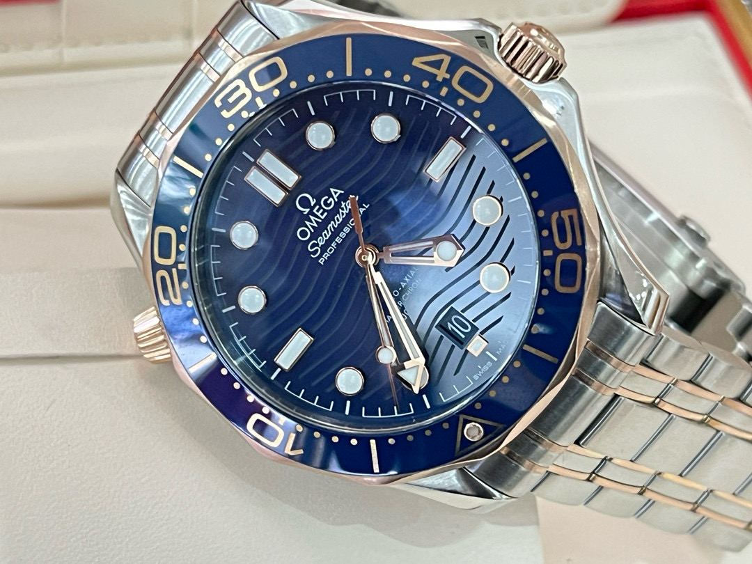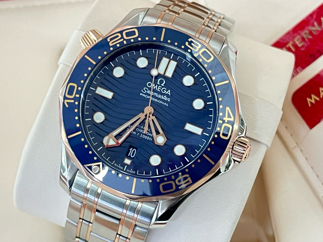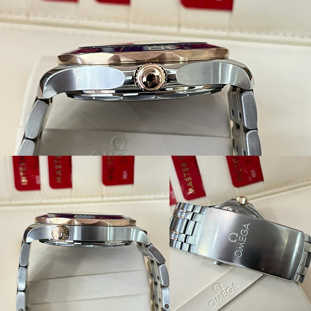 欧米茄海马 新款陶瓷圈 蓝圈面 18k间玫瑰金 AT8800同轴机芯 。原装间金钢带款 (送条定制胶带)2024年7月份极品全套购入。 表径42mm 品相完美 成色极品 热门运动表款 潜水300米。工价102600。现极品大全套好价