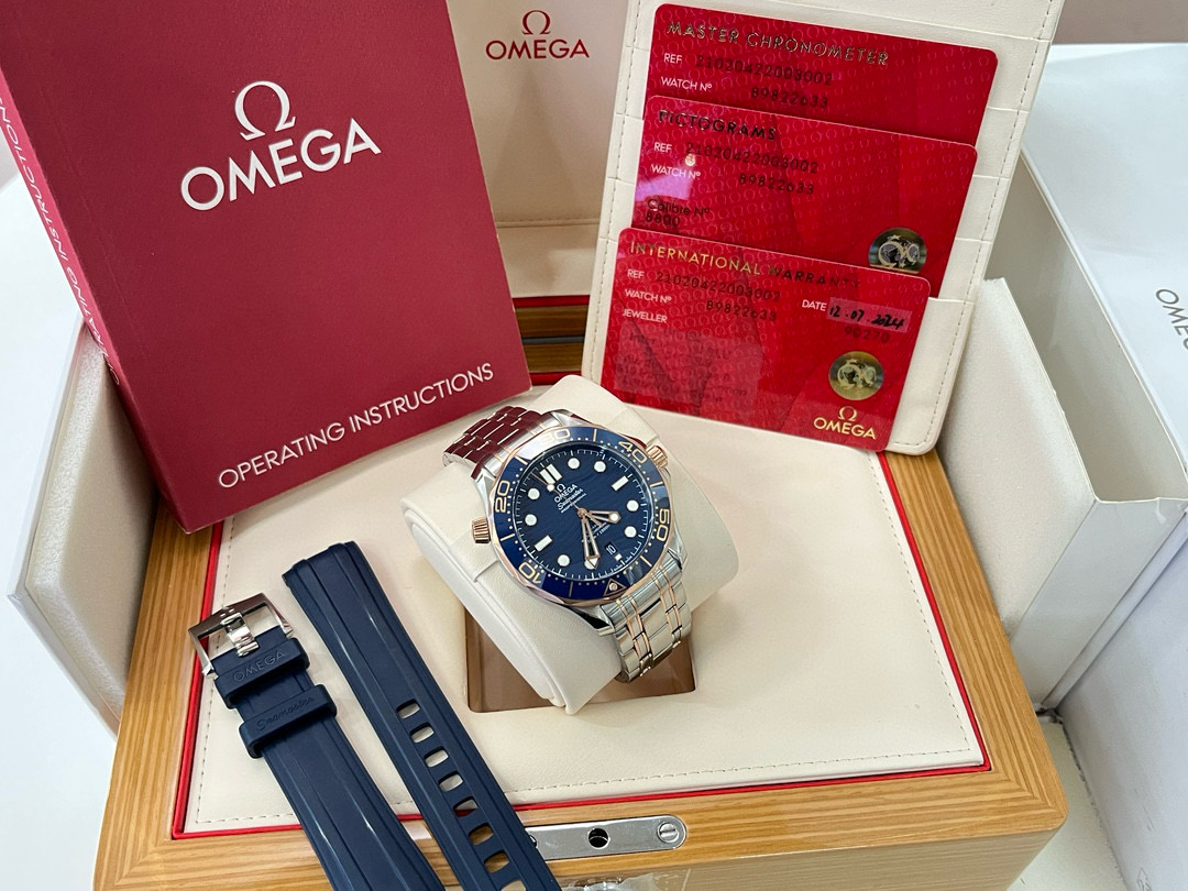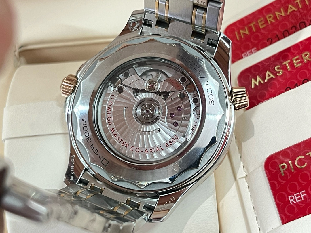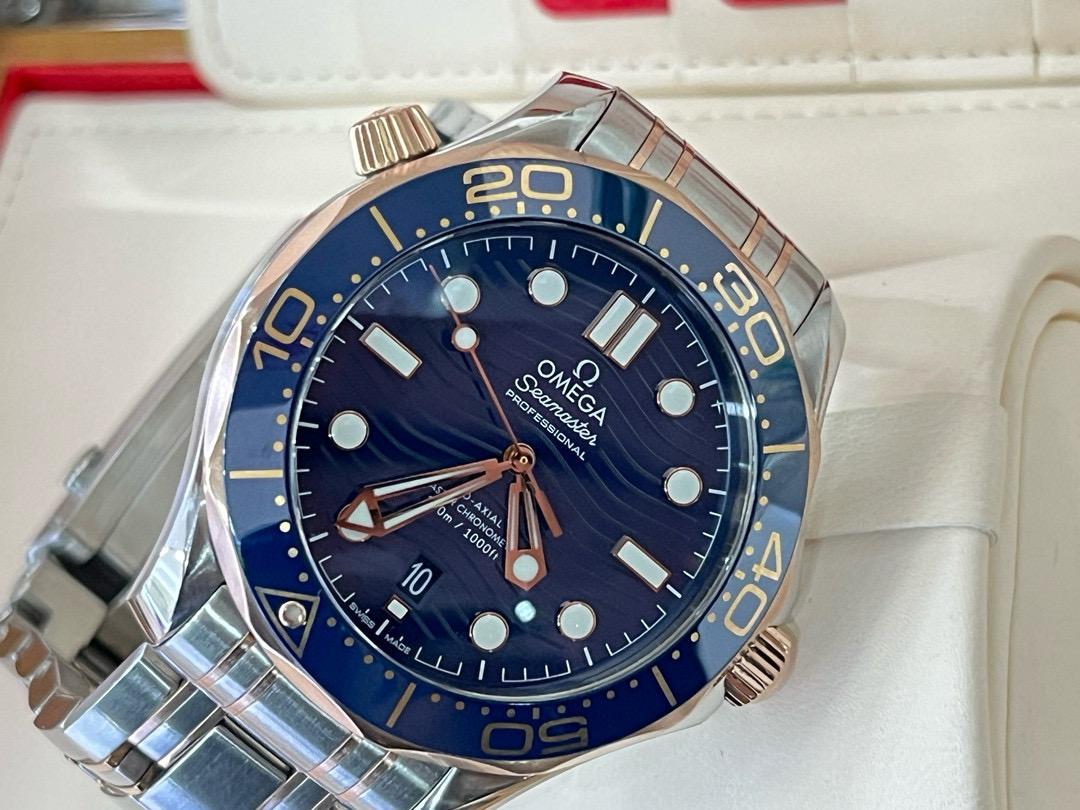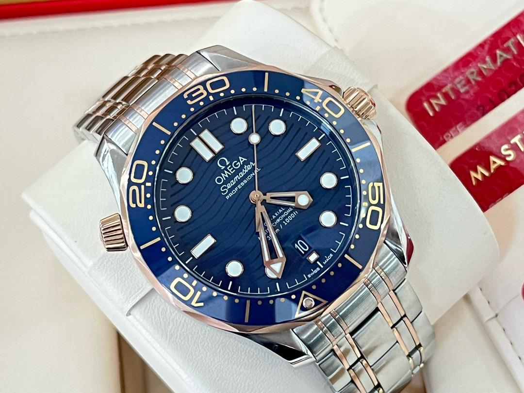 欧米茄海马 新款陶瓷圈 蓝圈面 18k间玫瑰金 AT8800同轴机芯 。原装间金钢带款 (送条定制胶带)2024年7月份极品全套购入。 表径42mm 品相完美 成色极品 热门运动表款 潜水300米。工价102600。现极品大全套好价
