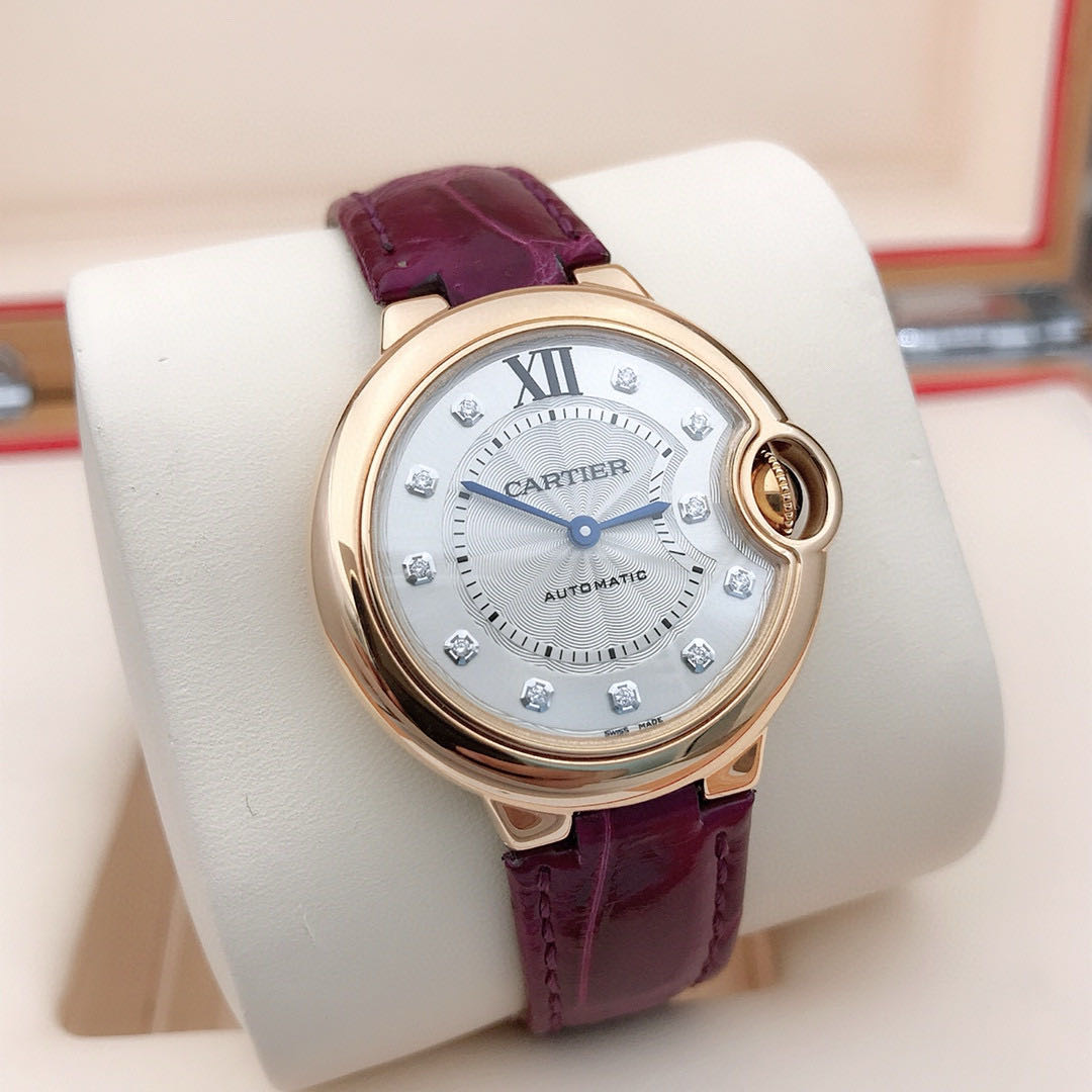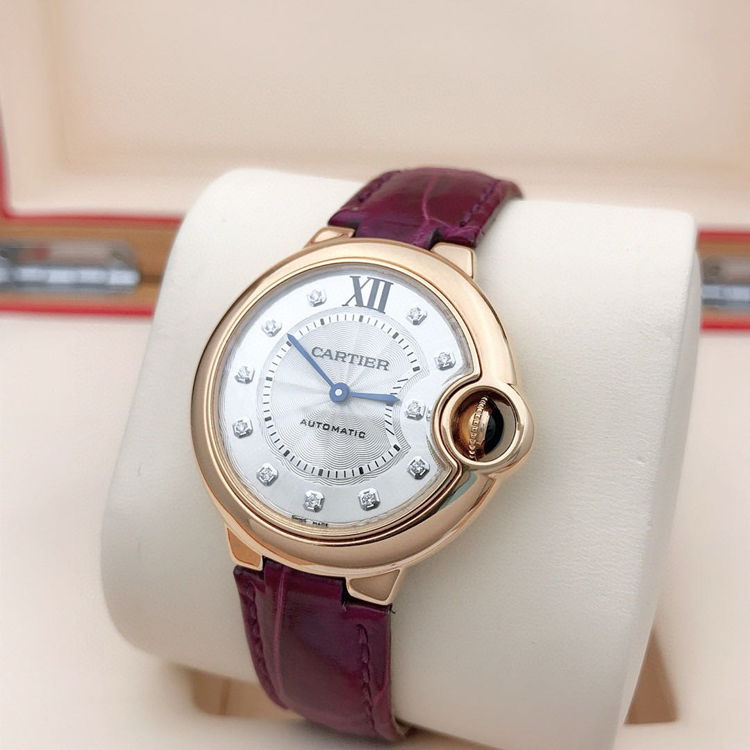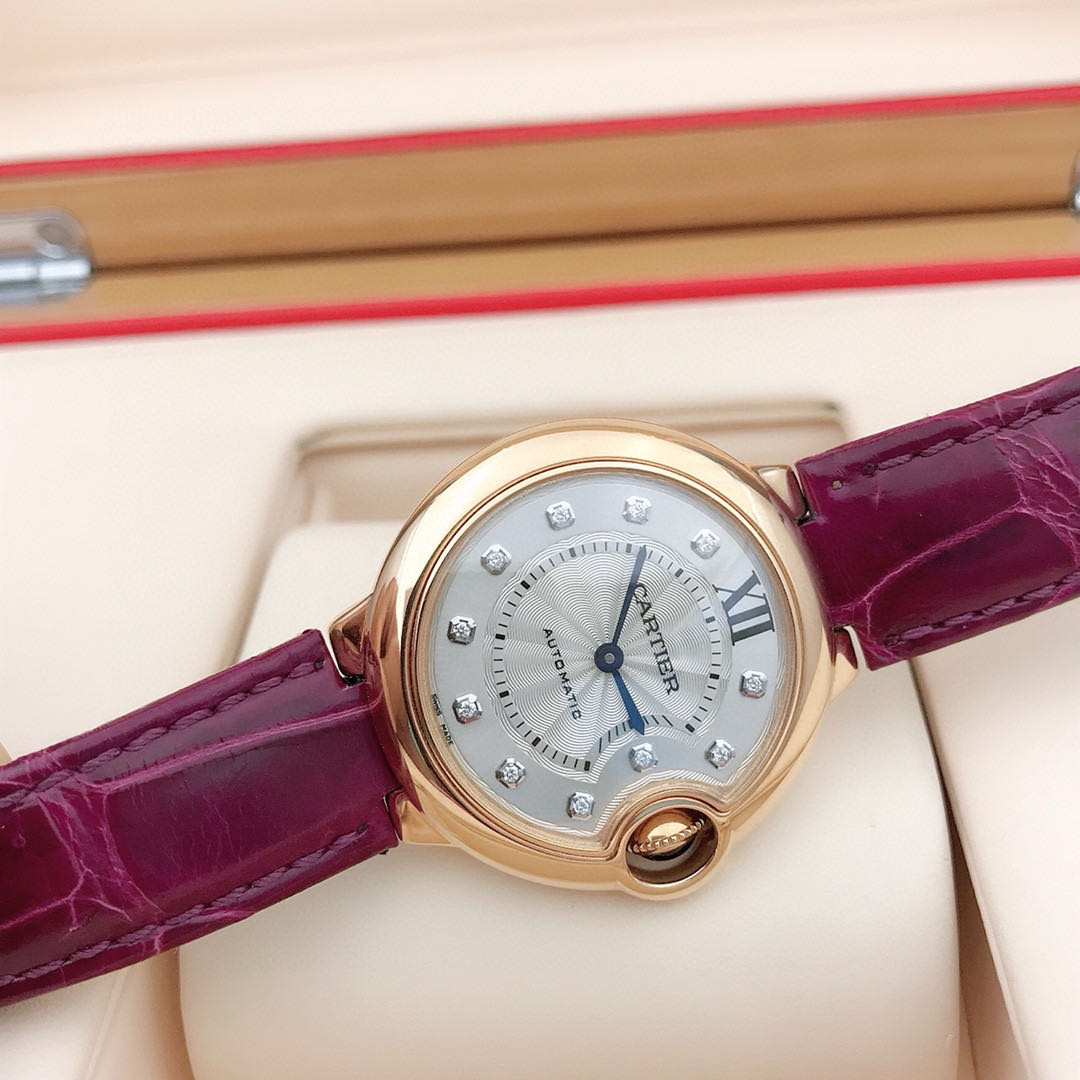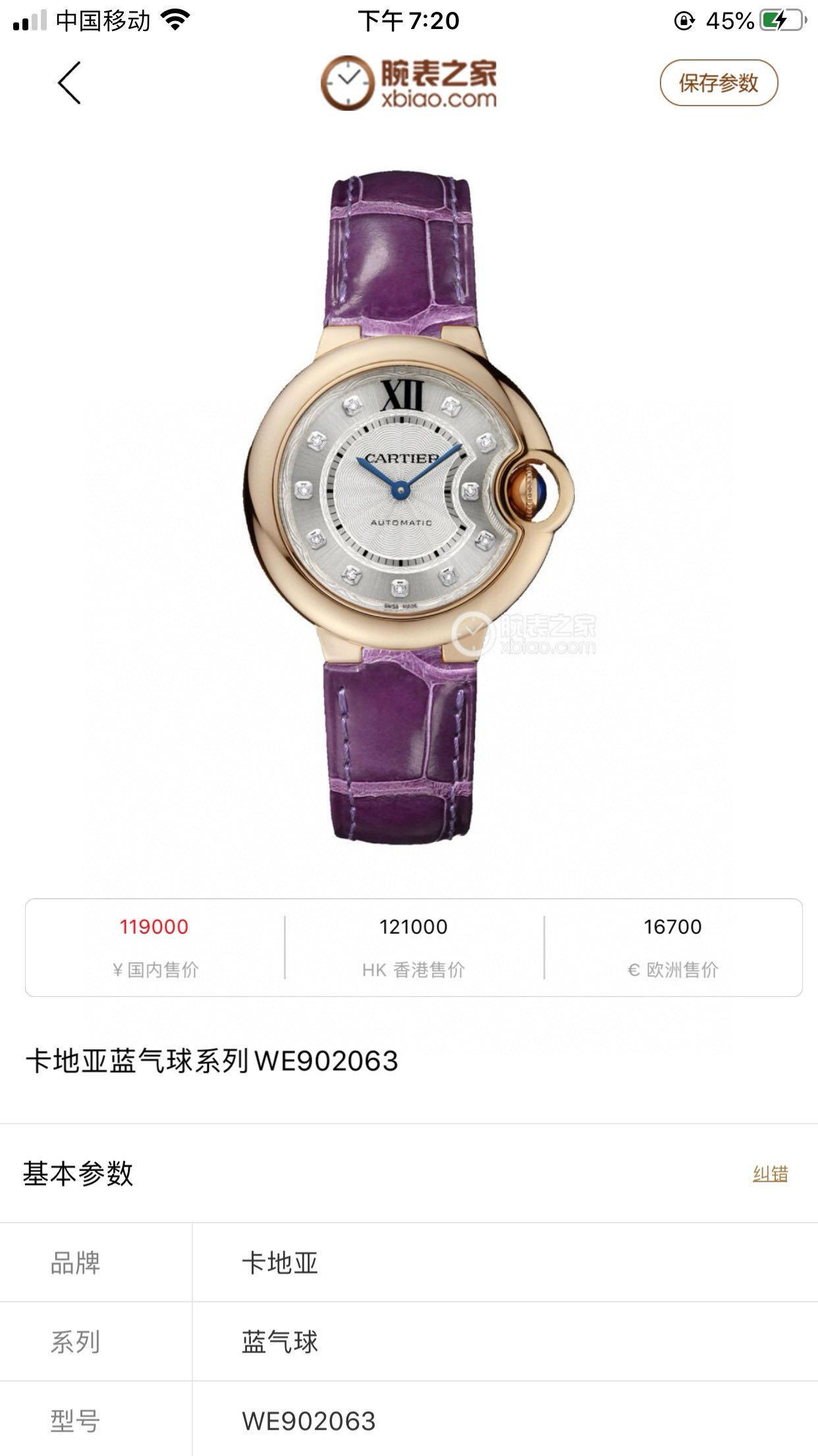 卡地亚女表蓝气球系列WE902063,18K玫瑰金材质,刻度镶钻,33mm表径,自动机械,专柜售价119000。