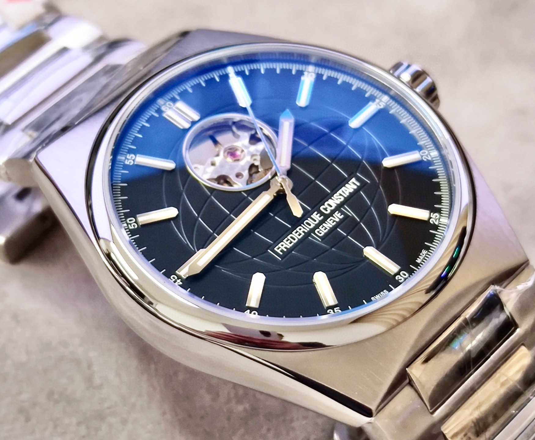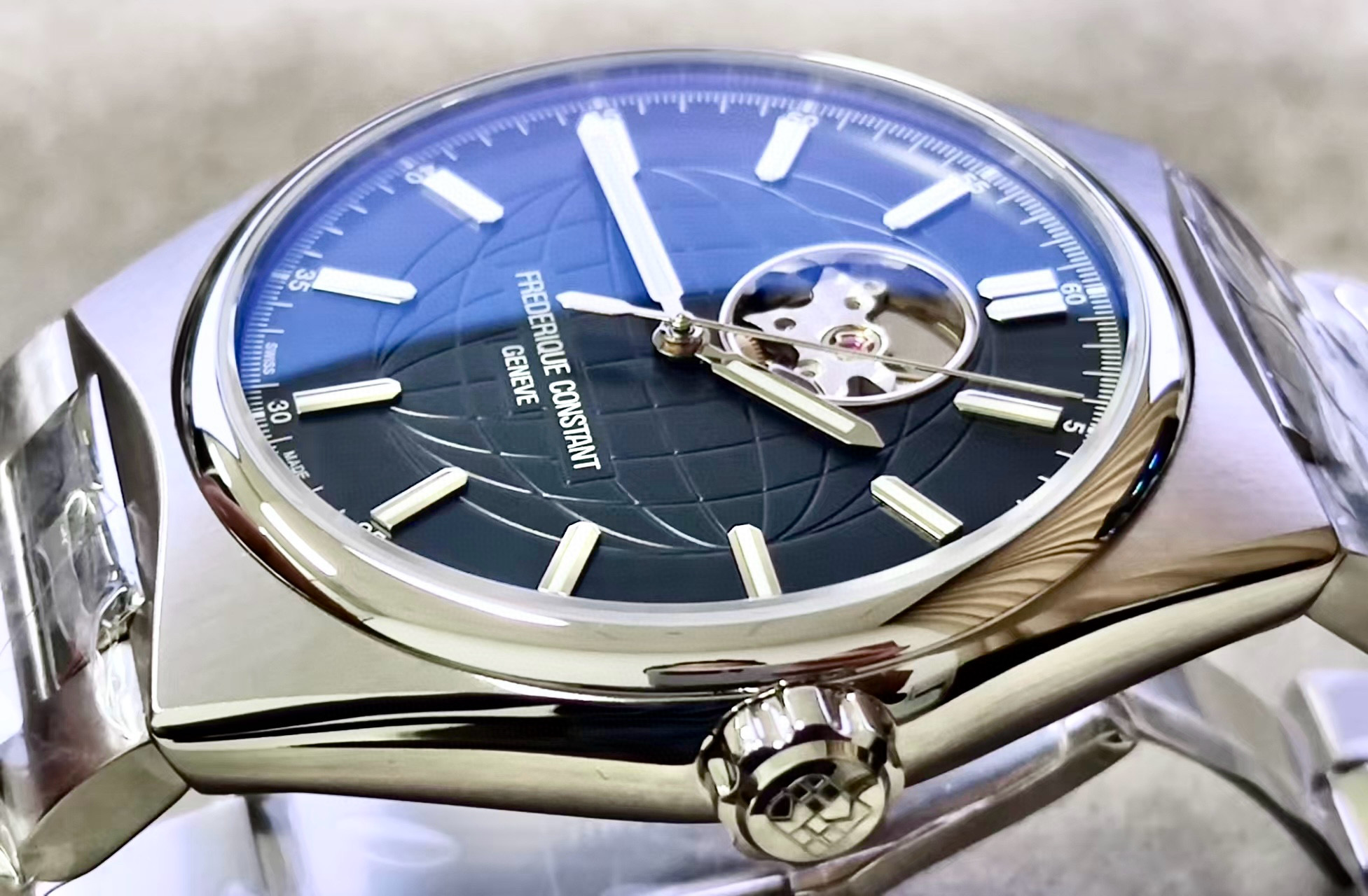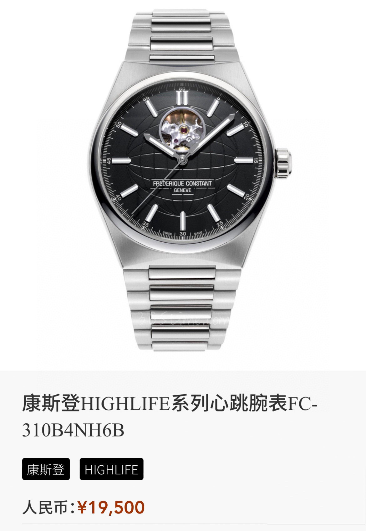 正品全新全套 康斯登 Highlife系列,男士自动机械表,41mm表径,50米防水,防刮蓝宝石镜面。高级黑色地球暗纹表盘,搭配超级夜光刻度和指针,夜晚效果非常靓丽。12点位置镂空窗口别具匠心,可以直观的欣赏到自动机械机芯的机械之美。