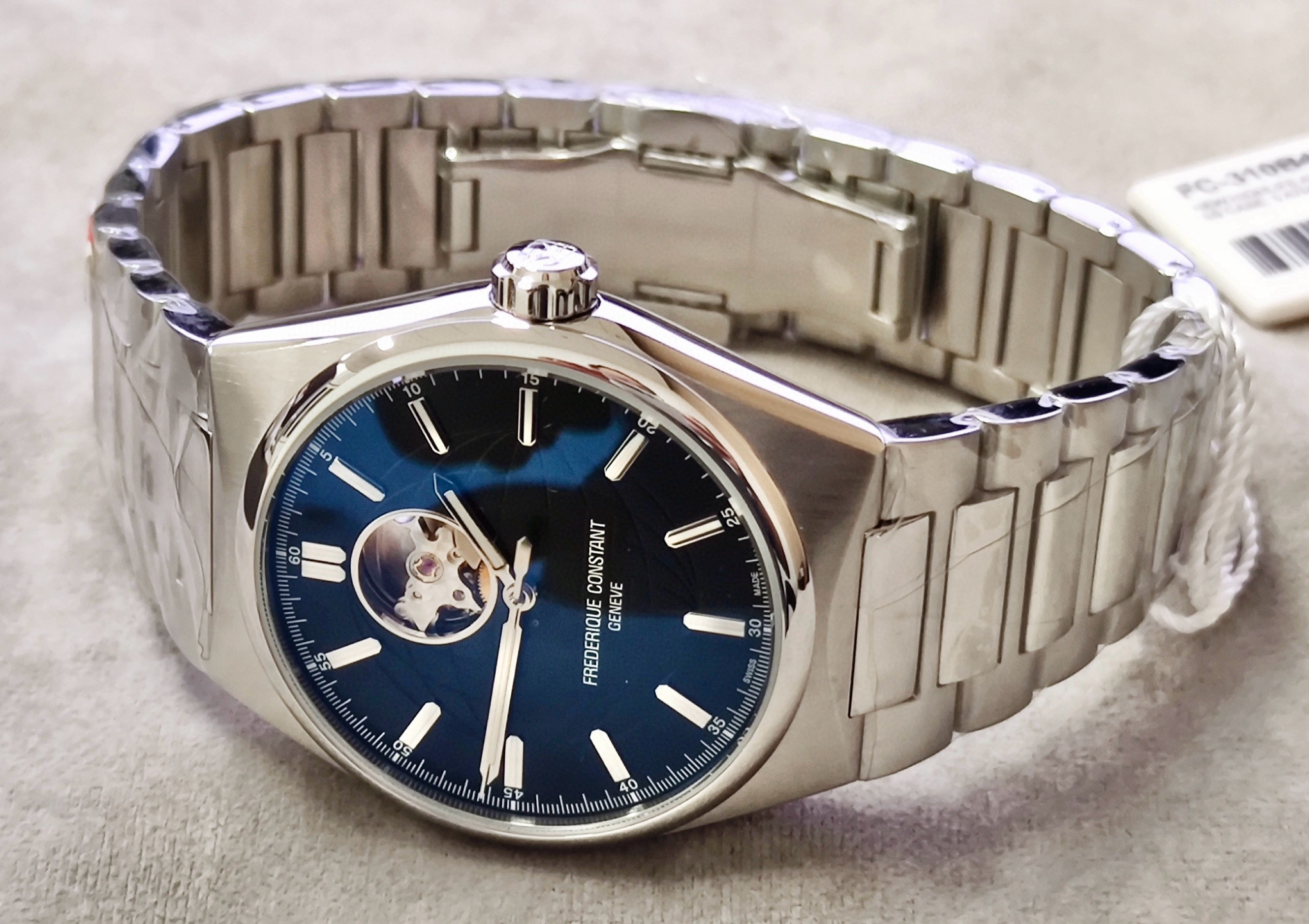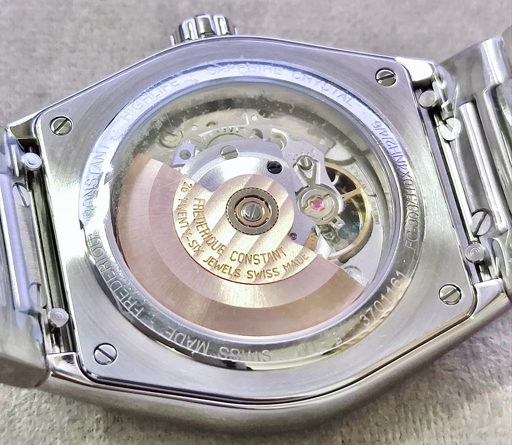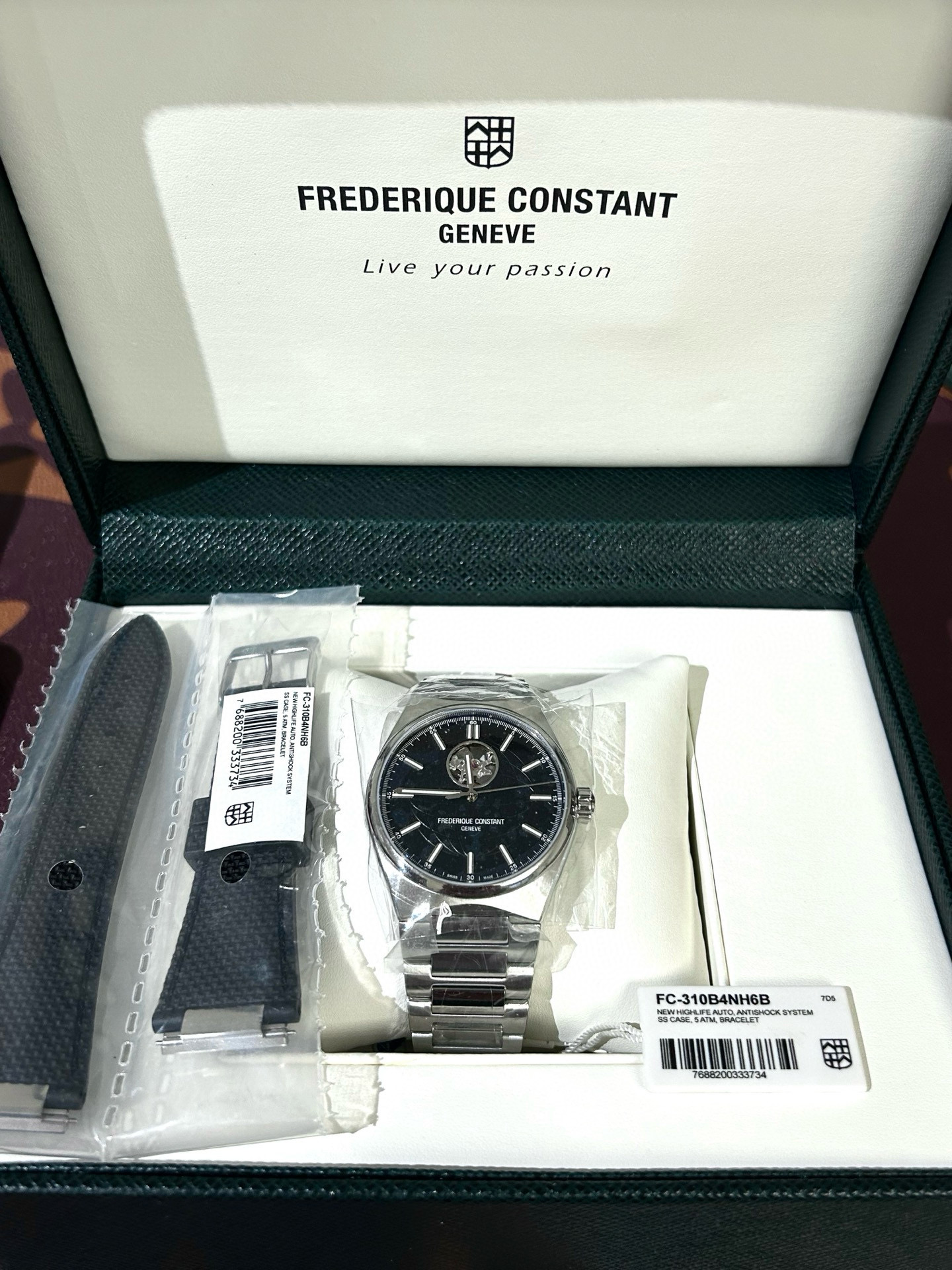 正品全新全套 康斯登 Highlife系列,男士自动机械表,41mm表径,50米防水,防刮蓝宝石镜面。高级黑色地球暗纹表盘,搭配超级夜光刻度和指针,夜晚效果非常靓丽。12点位置镂空窗口别具匠心,可以直观的欣赏到自动机械机芯的机械之美。