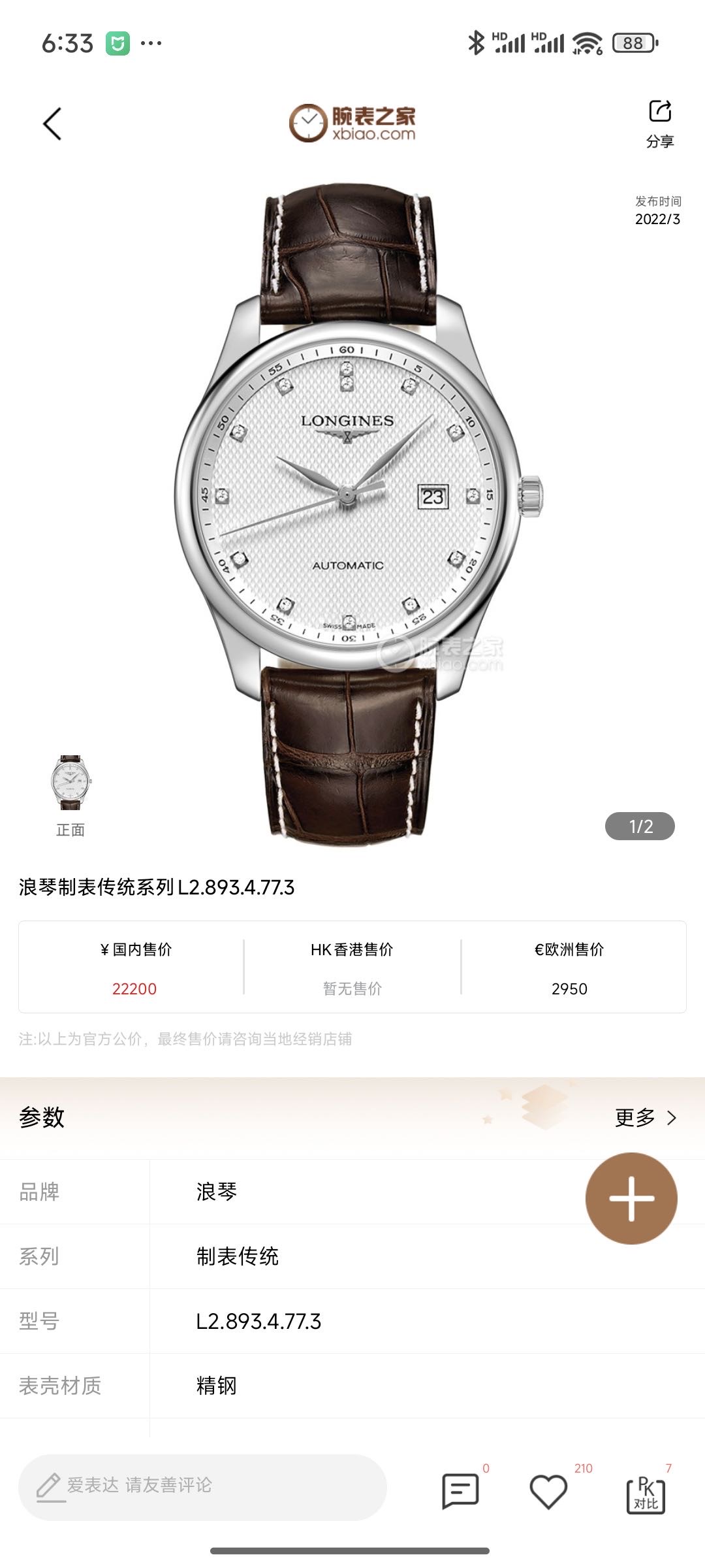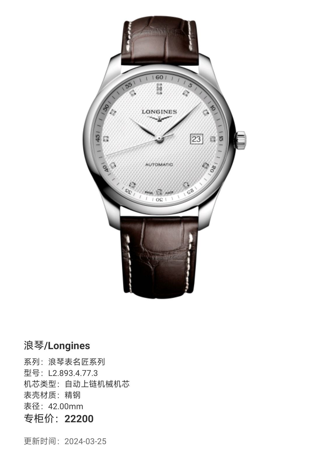 浪琴/Longines 浪琴表名匠系列 L2.893.4.77.3 自动上链机械机芯 精钢 42.00mm 专柜价22200