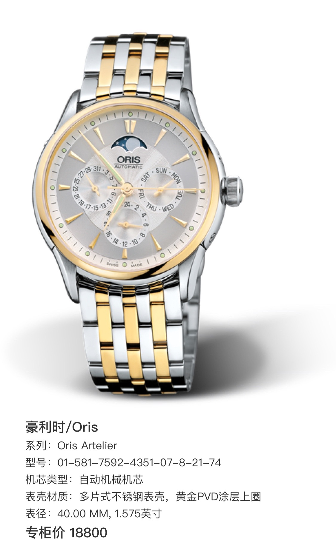 豪利时/Oris Oris Artelier 01-581-7592-4351-07-8-21-74 自动机械机芯 多片式不锈钢表壳,黄金PVD涂层上圈 40.00 MM, 1.575英寸 附件:17全套 专柜价18800