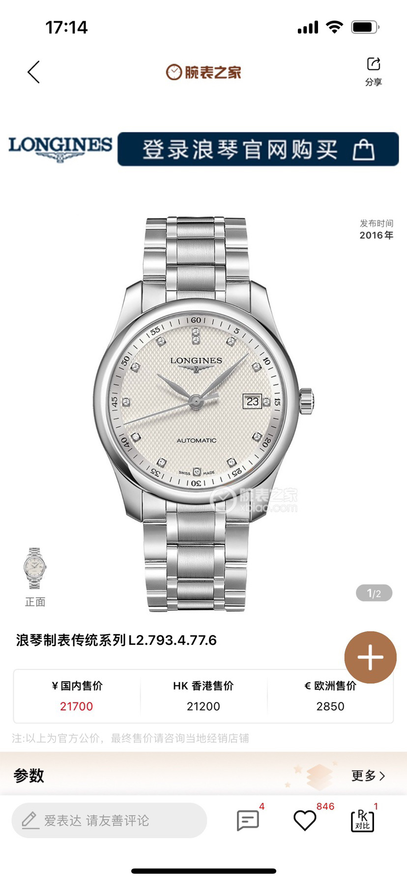 浪琴/Longines 浪琴表名匠系列 L2.793.4.77.6自动机械男士腕表,精钢材质,40.00mm表径 ,麦粒纹钻刻,三点钟日历显示,公价21700,现好价