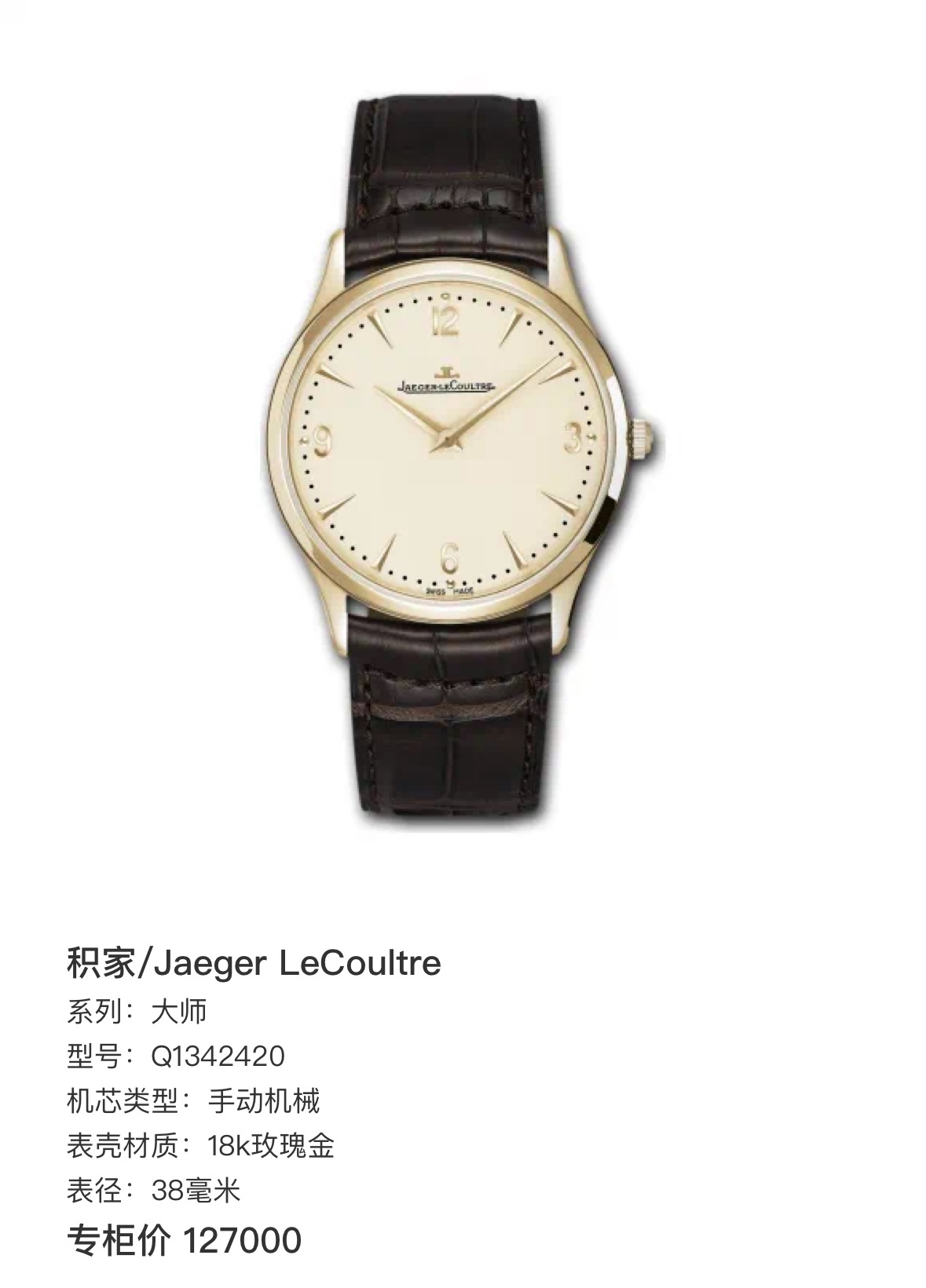 新到!积家/Jaeger LeCoultre 大师 Q1342420 手动机械 18k玫瑰金 38毫米 专柜价 127000,单表,折叠扣,现货好价~