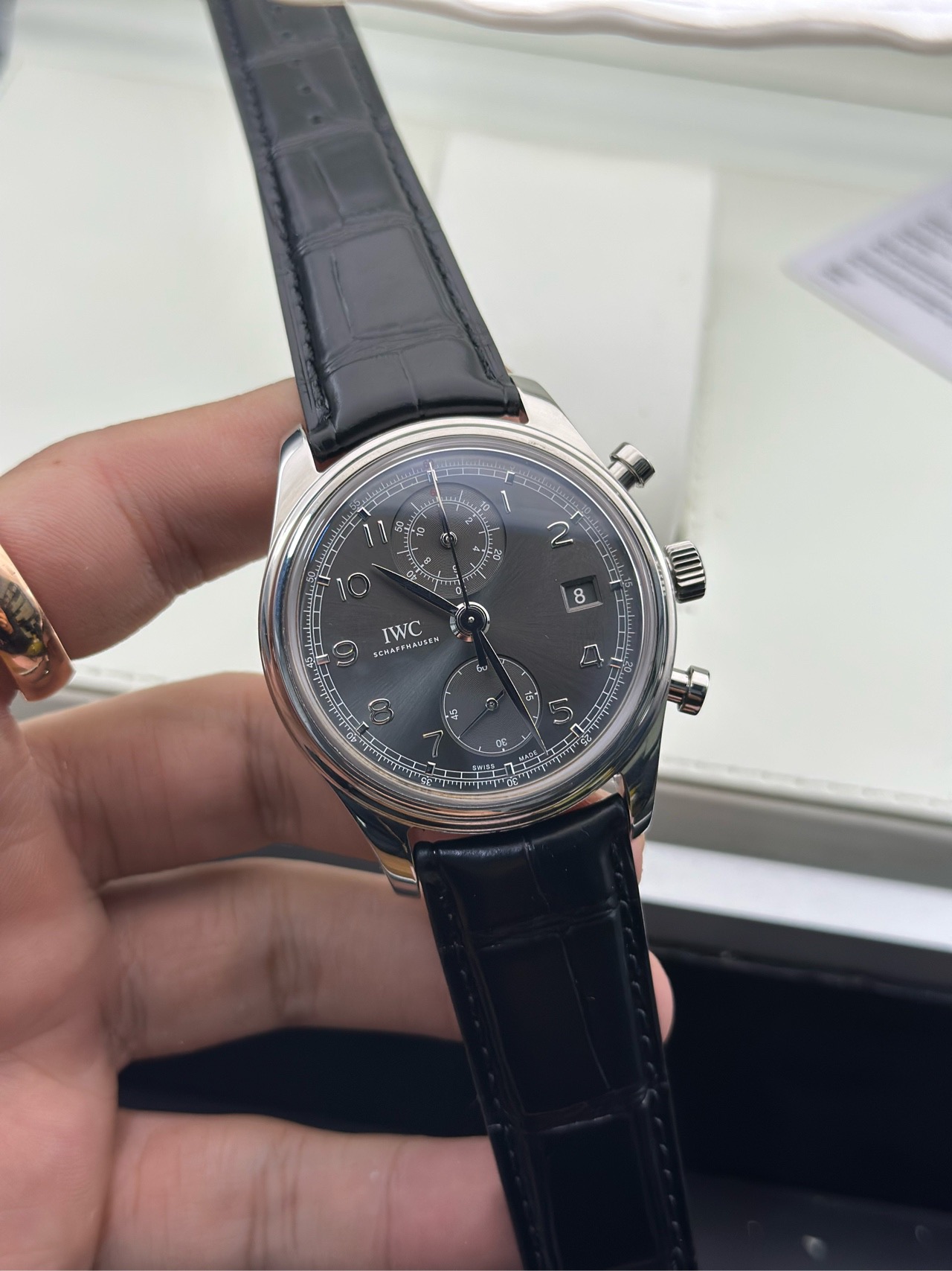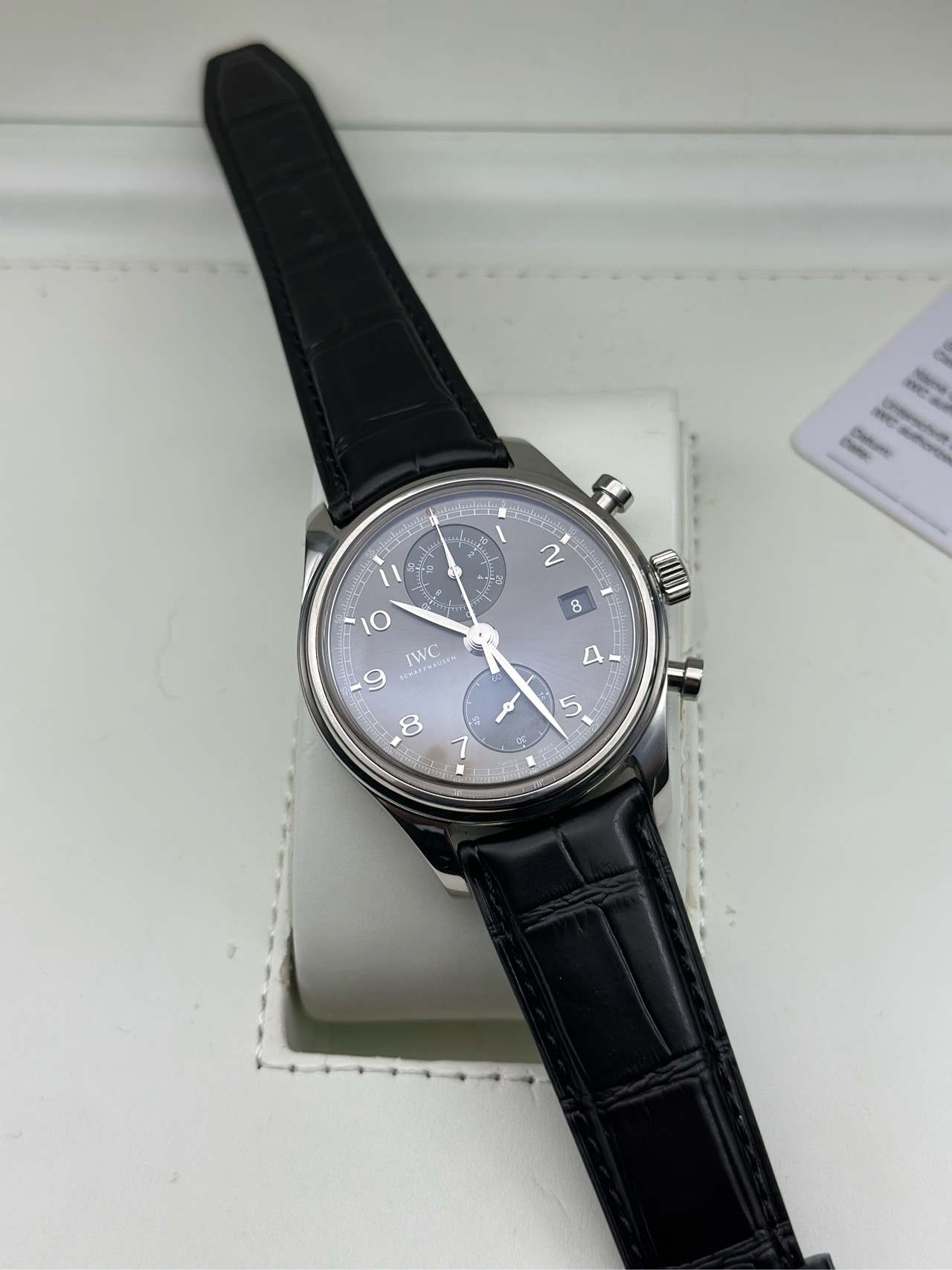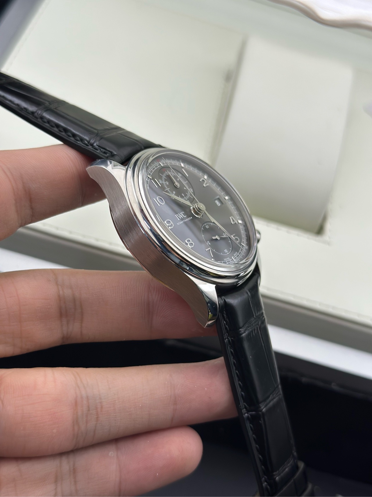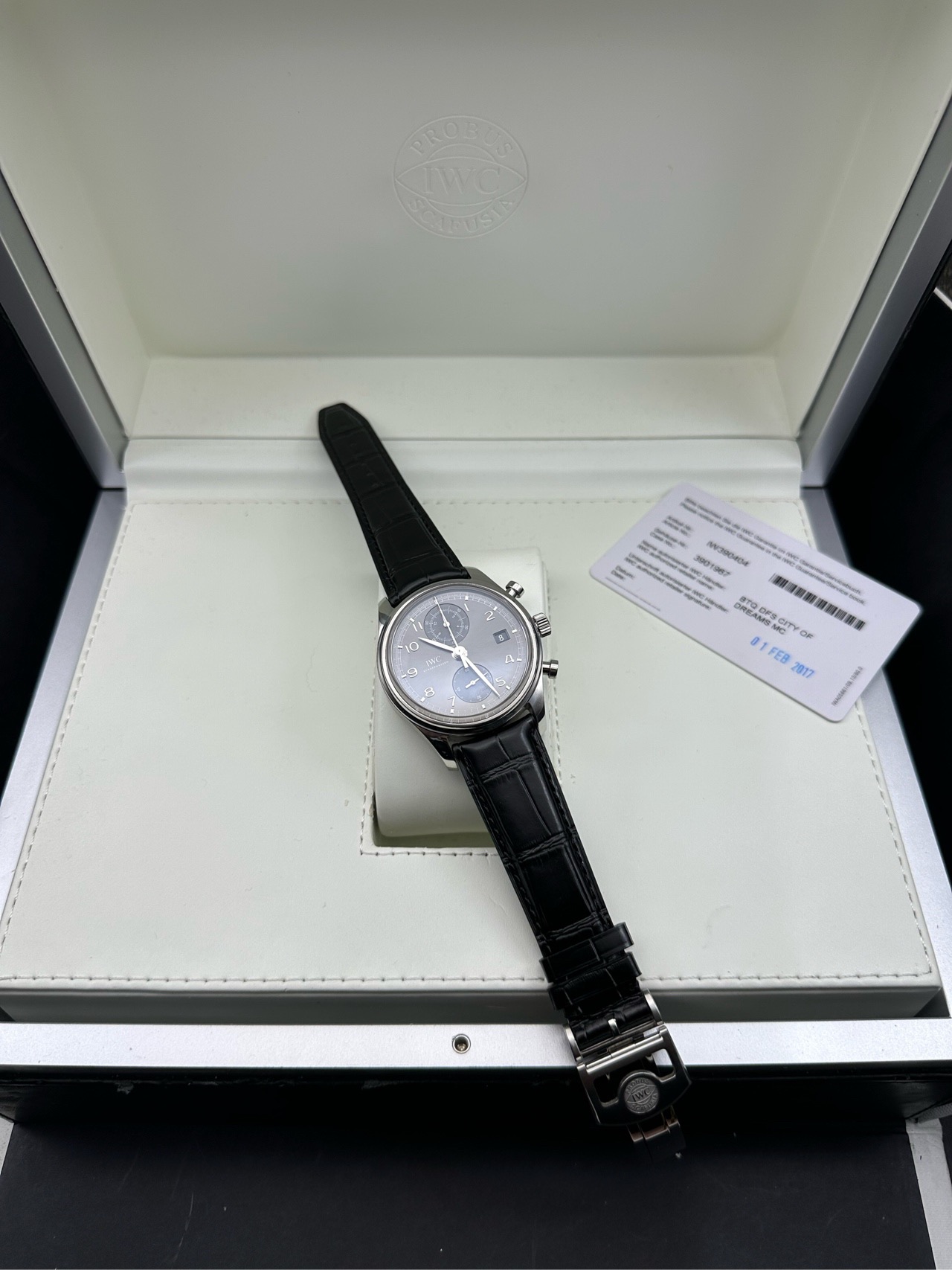 万国 葡萄牙系列 型号:IW390404 男士自动机械表,精钢材质 42mm 深灰色放射面,日期显示计时飞返逆跳功能 新款折叠扣,背透啄木鸟机芯,68小时动力储备 完美成色2017年全套 专柜价88000,现货特价