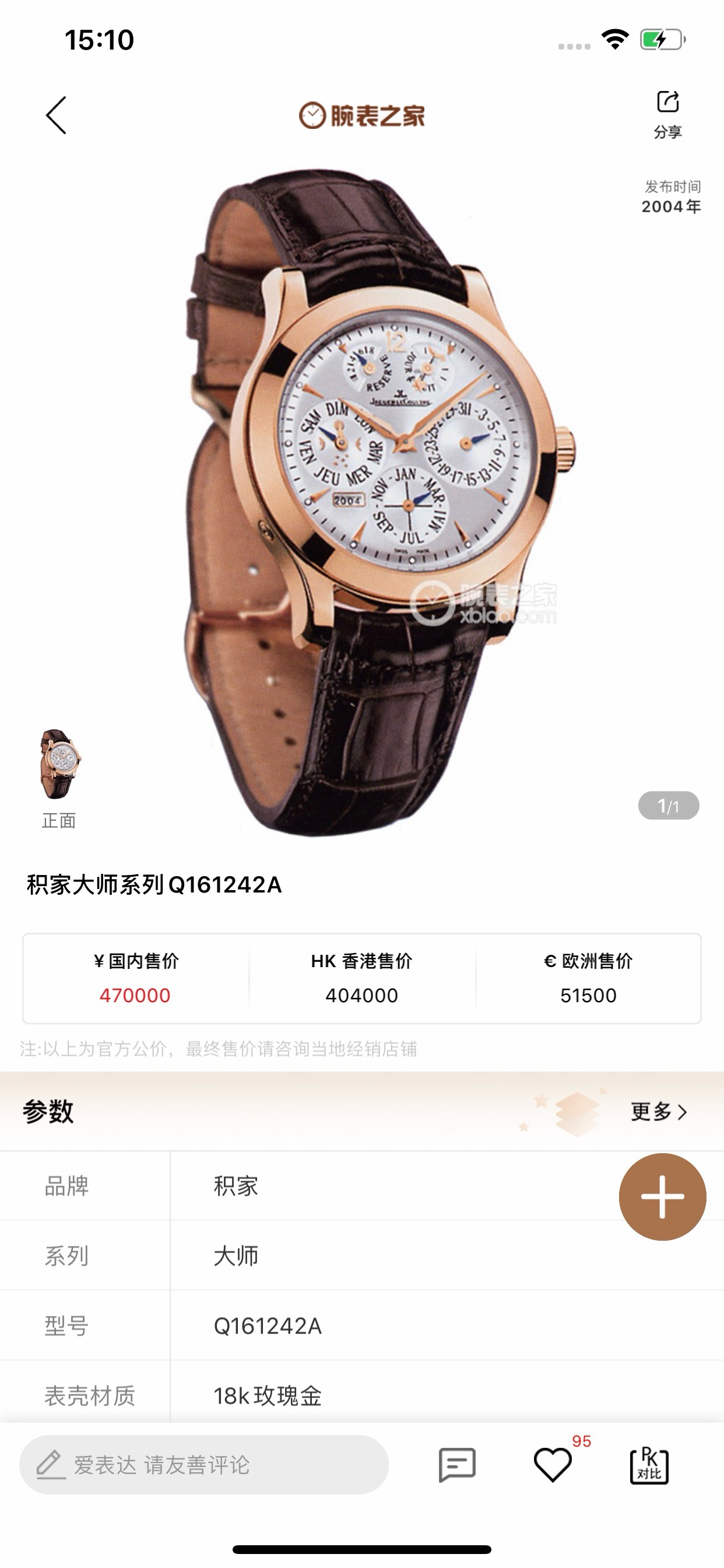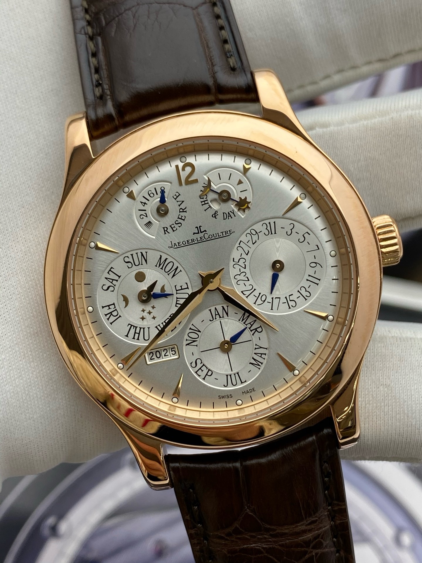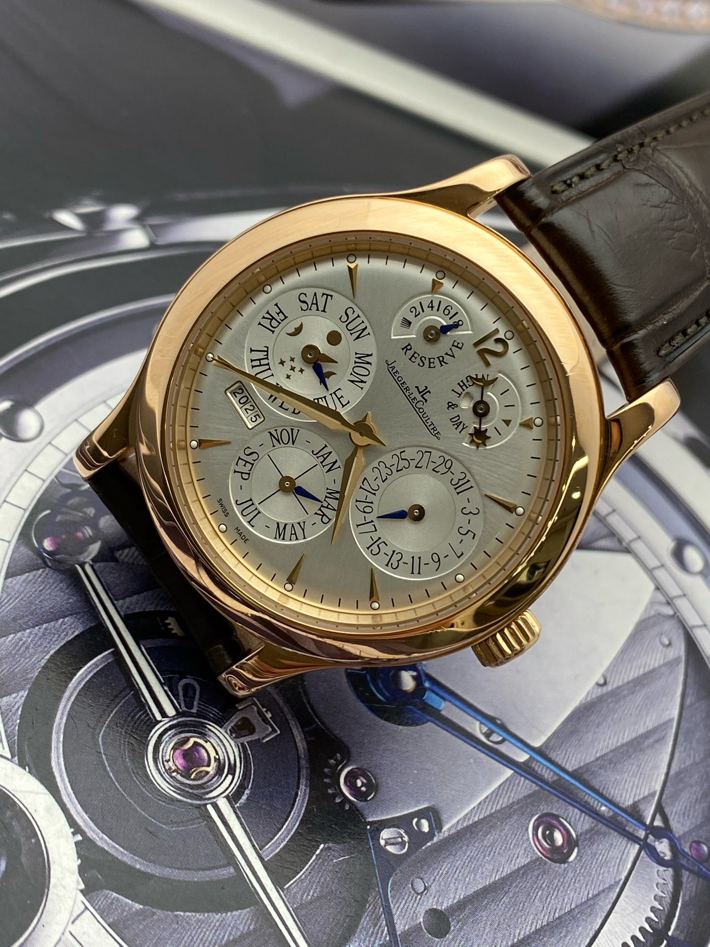 积家大师系列Q161242A、单表、41.5盘、手动机械、日期、星期、月份、年历、月相、万年历、动力储存显示、折叠扣、专柜售价470000