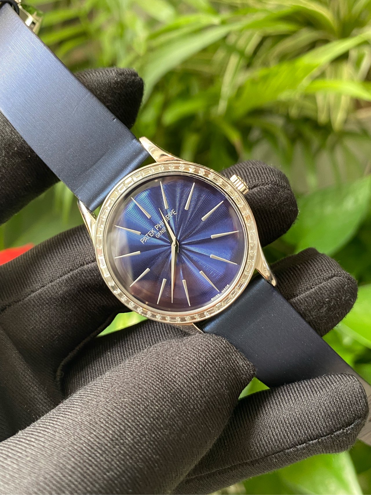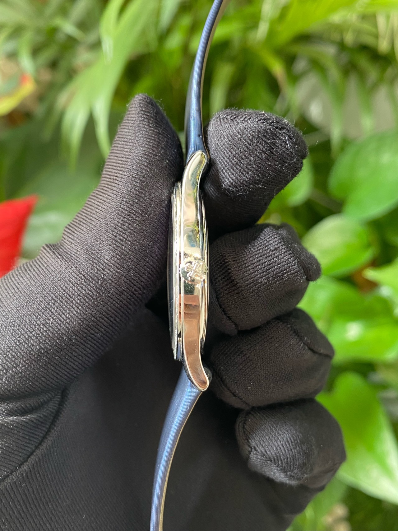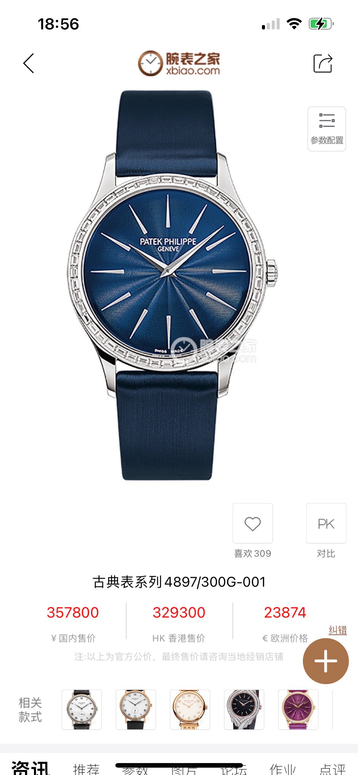 百达翡丽古典系列4897/300G-001手动机械女表,白金表壳,方T钻,放射性蓝色表盘,33mm完美表径,