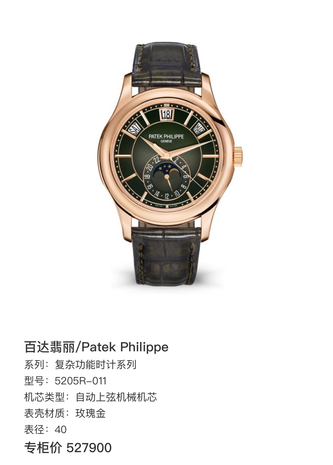 百达翡丽/Patek Philippe 复杂功能时计系列 5205R-011 自动上弦机械机芯 玫瑰金 40 专柜价527900