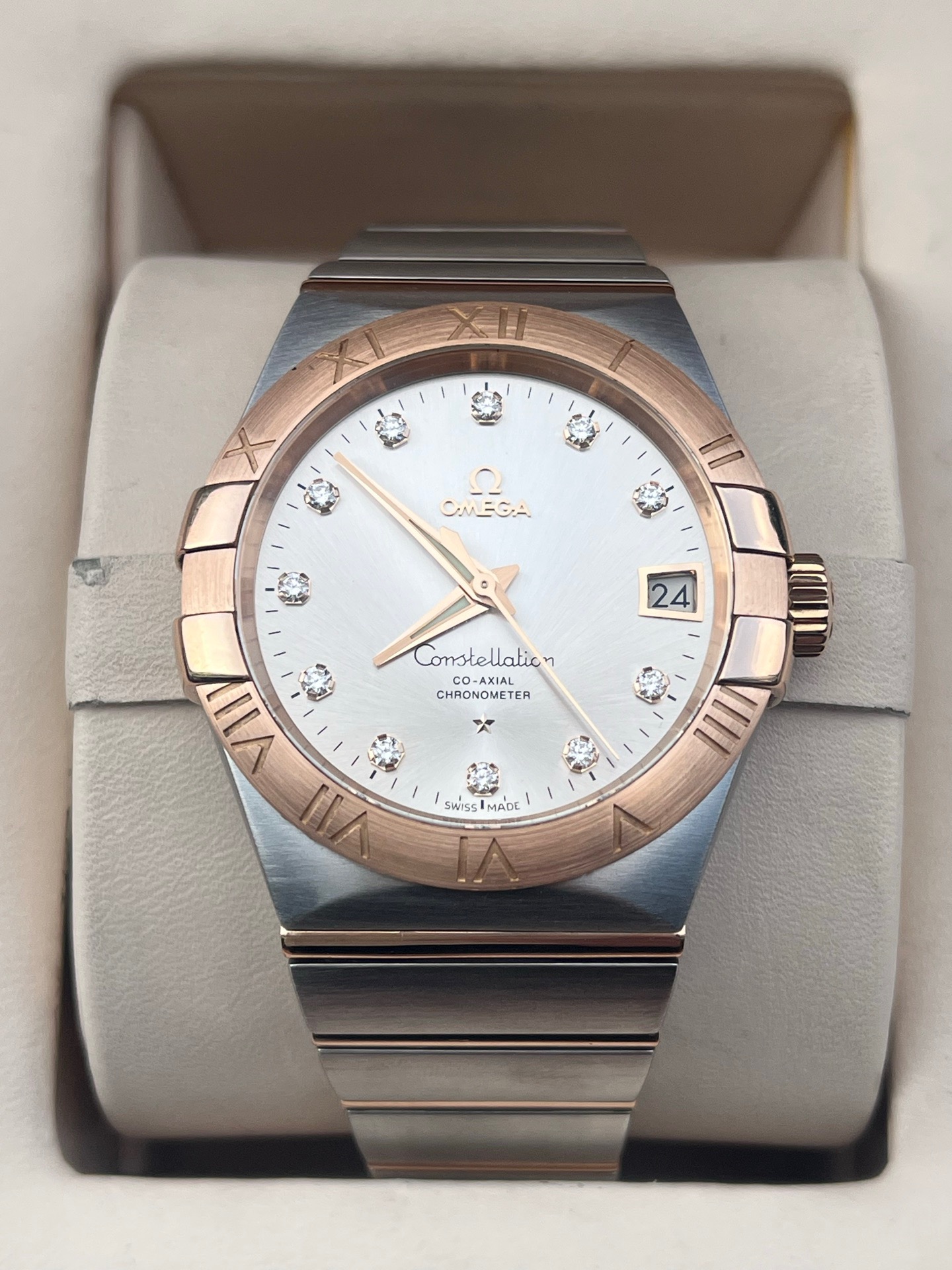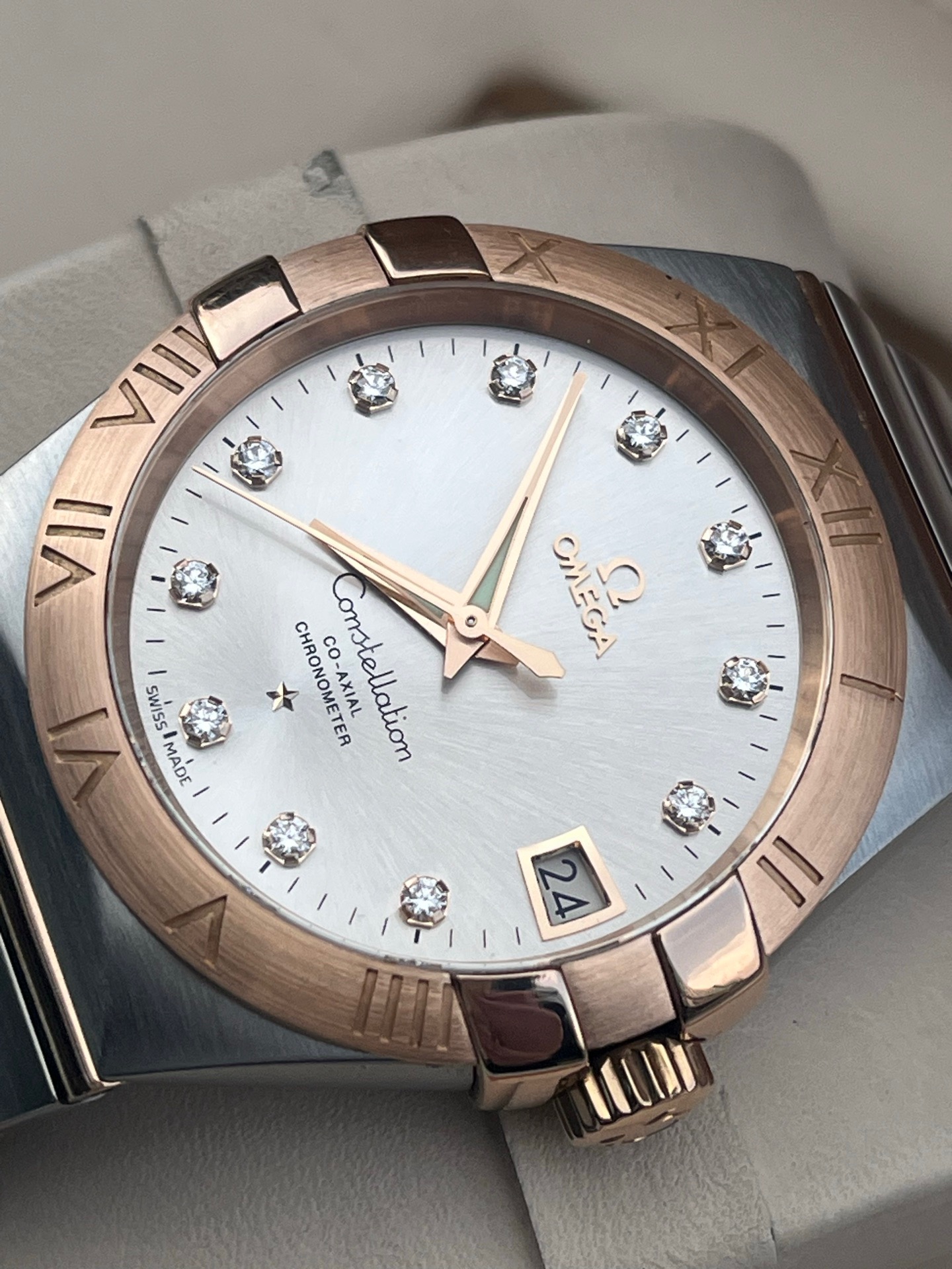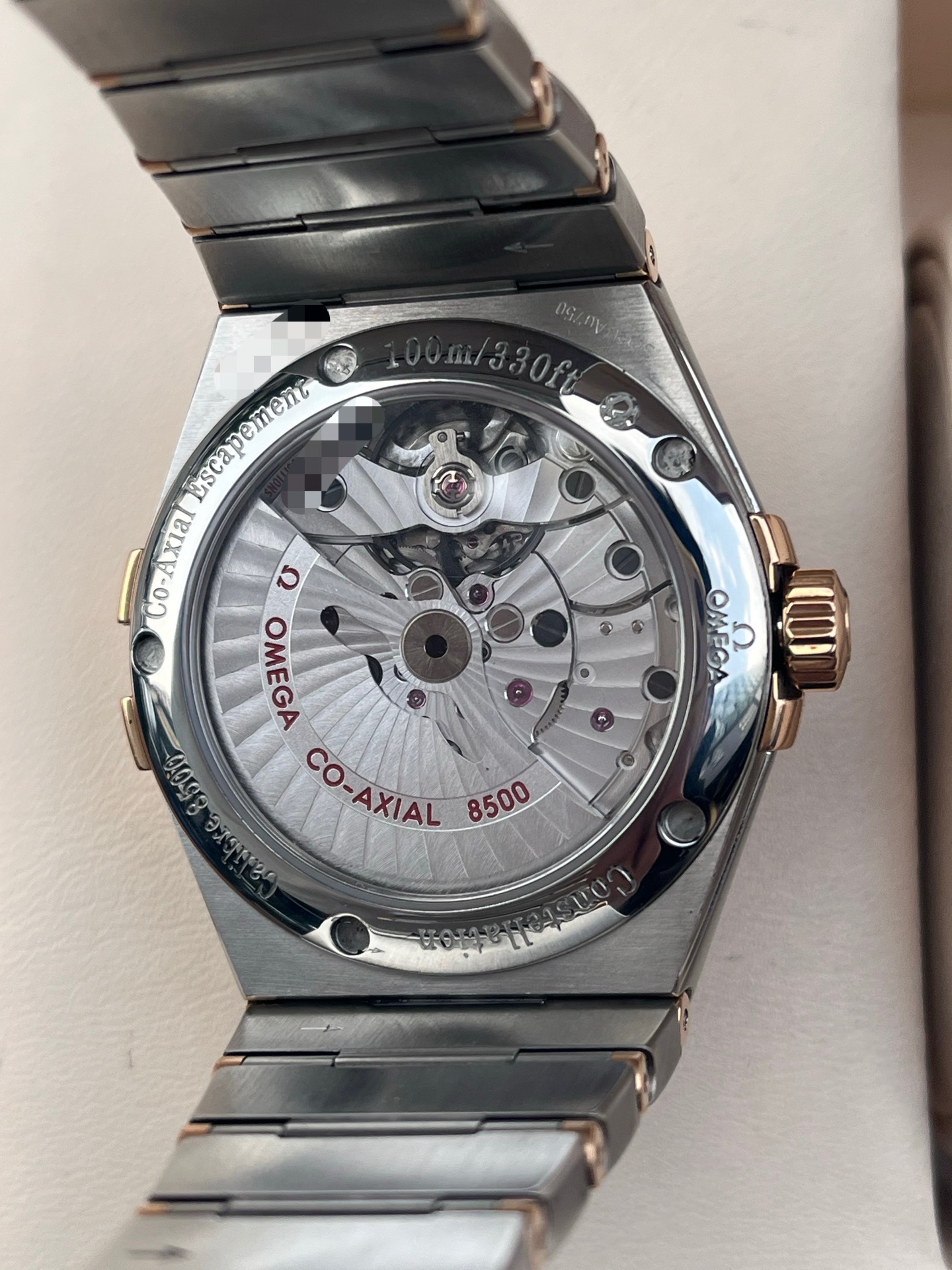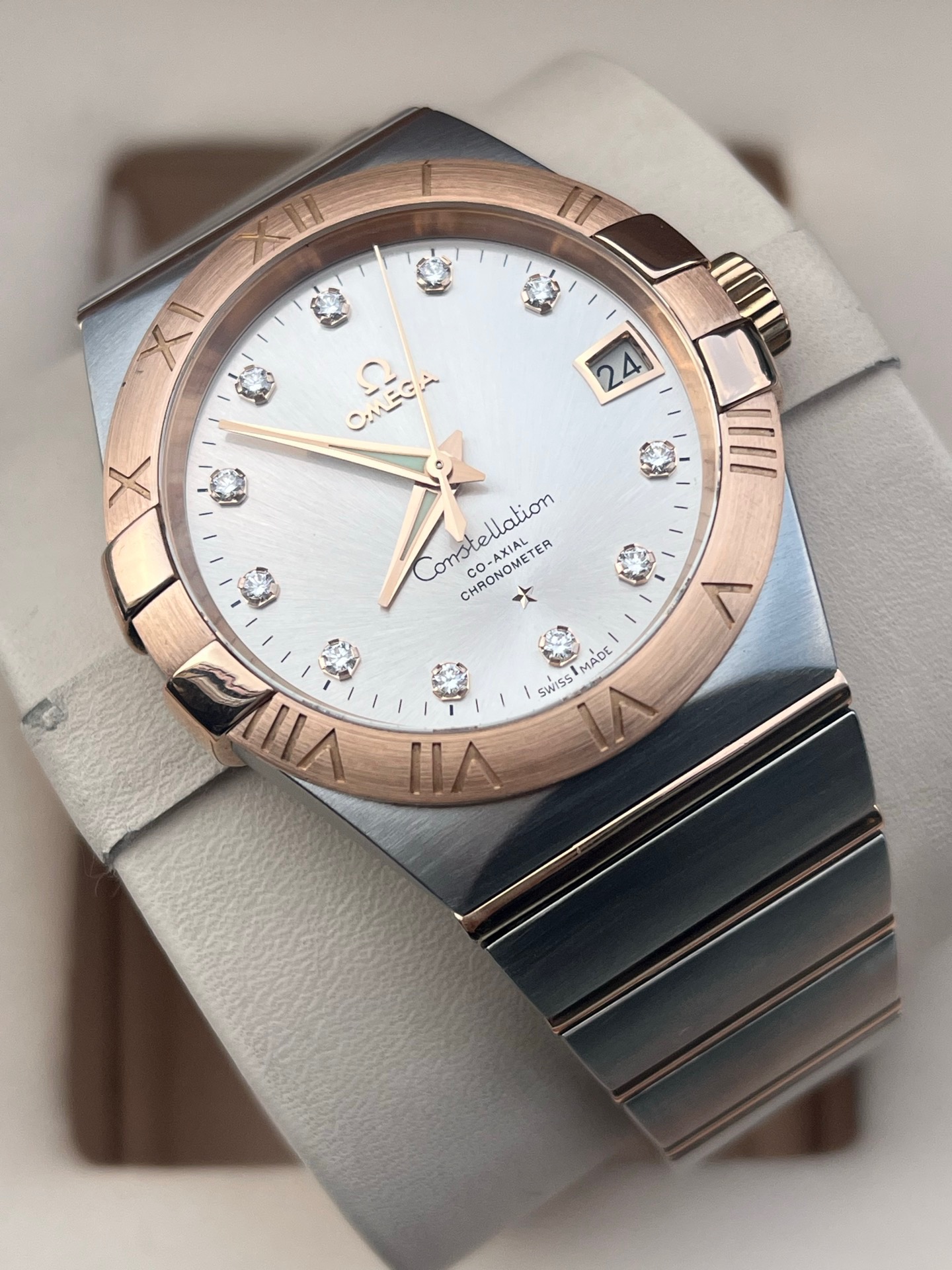欧米茄星座系列123.20.38.21.52.001、男士自动机械腕表、表径:38mm、材质:精钢/18k玫瑰金、银白色盘面、钻石刻度、日期显示、自产8500机芯、瑞士天文台认证、原价:78500元