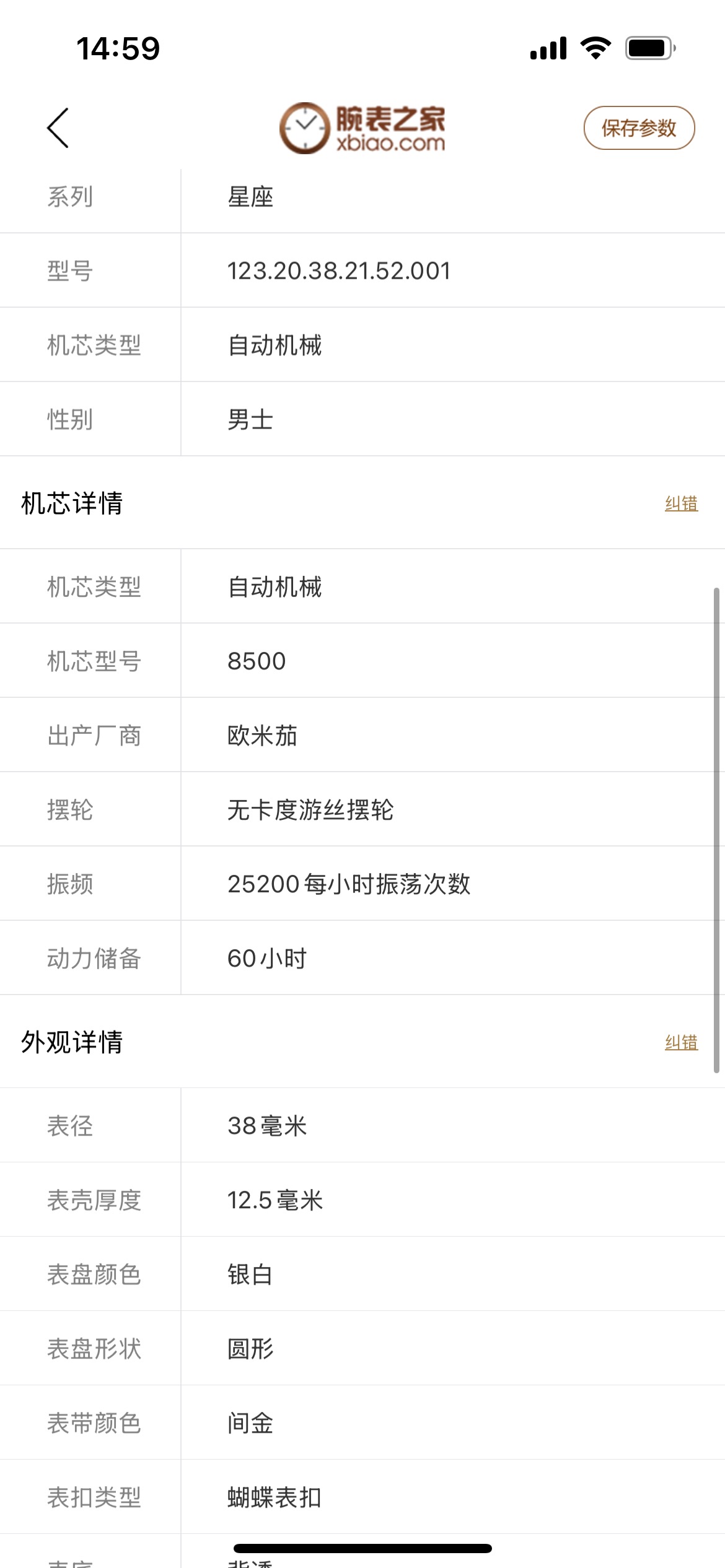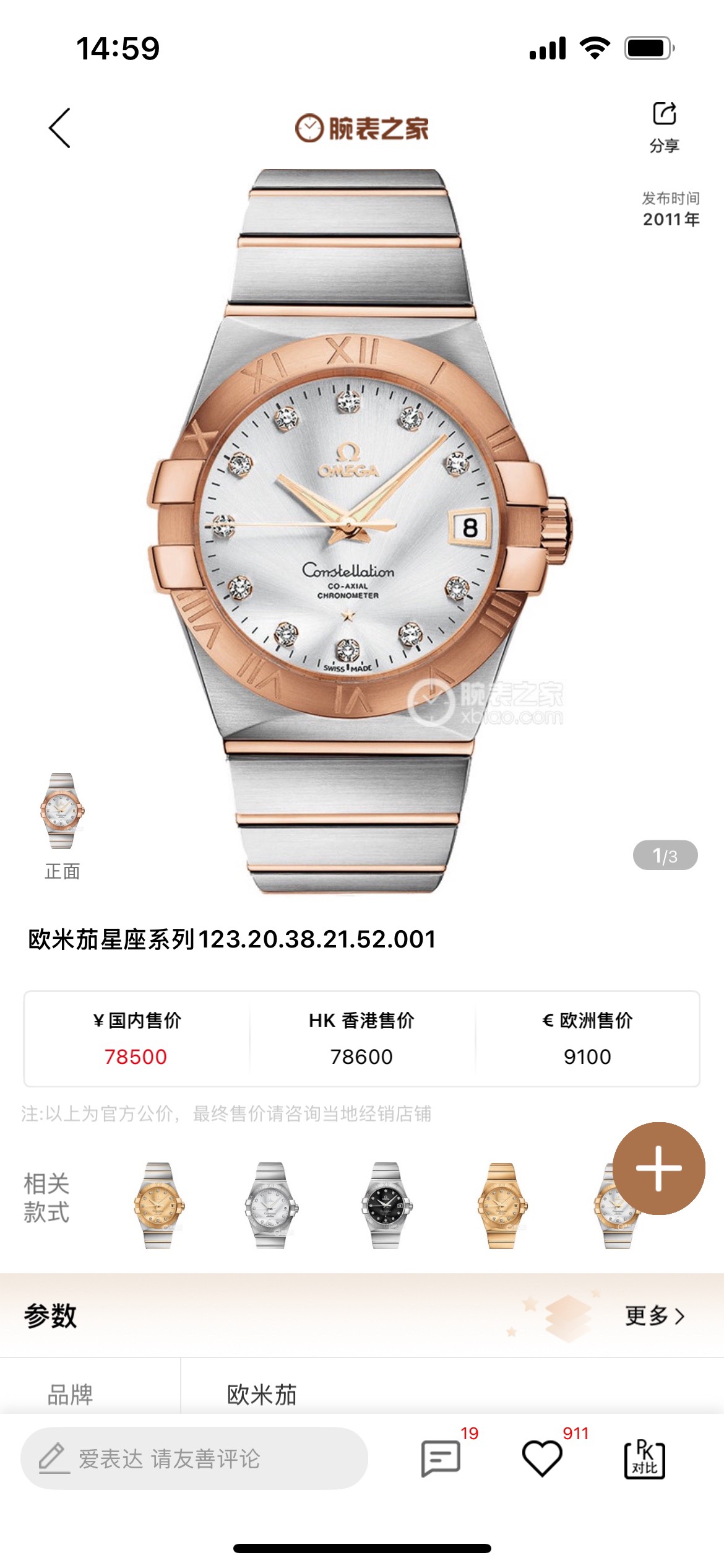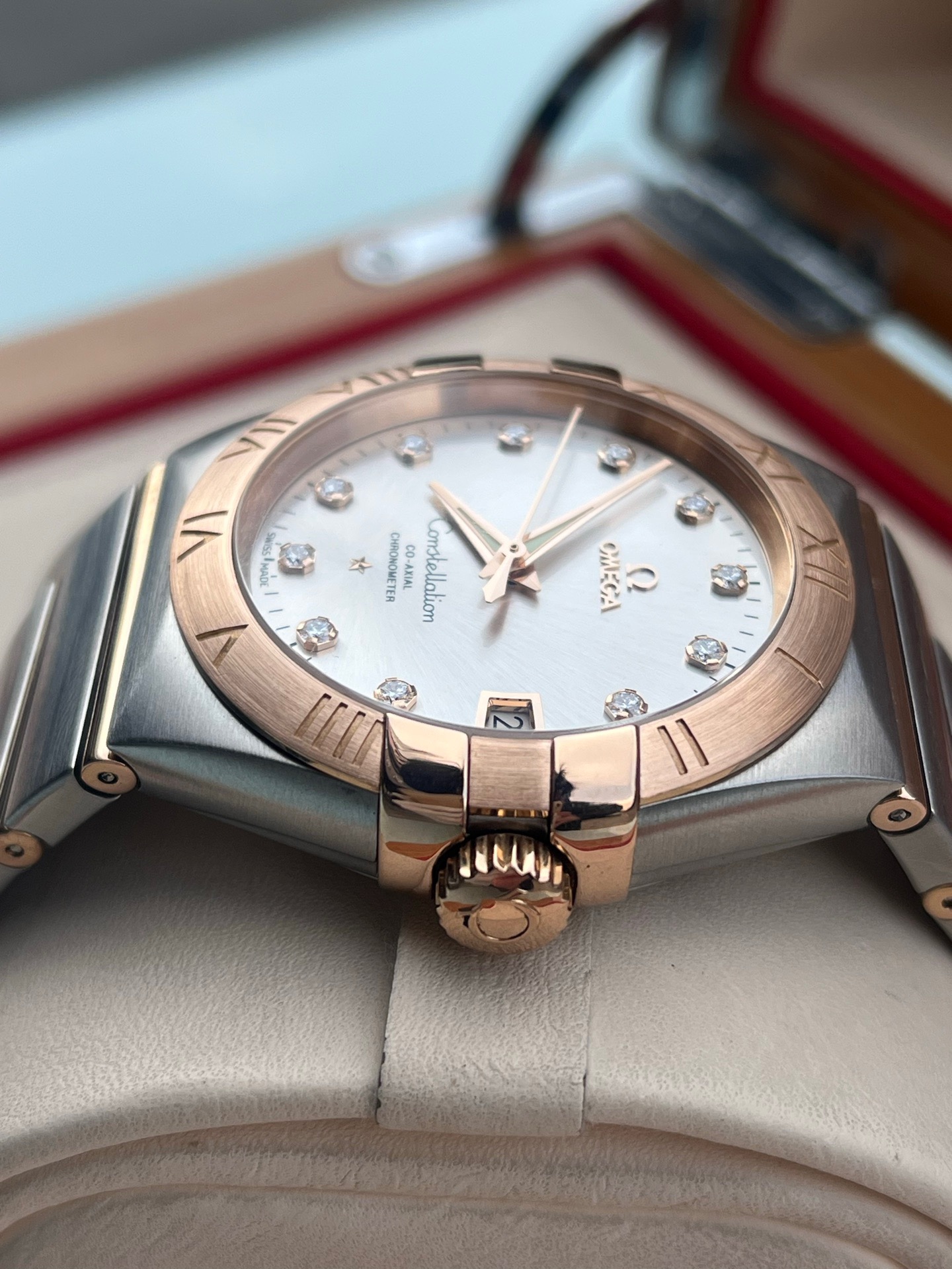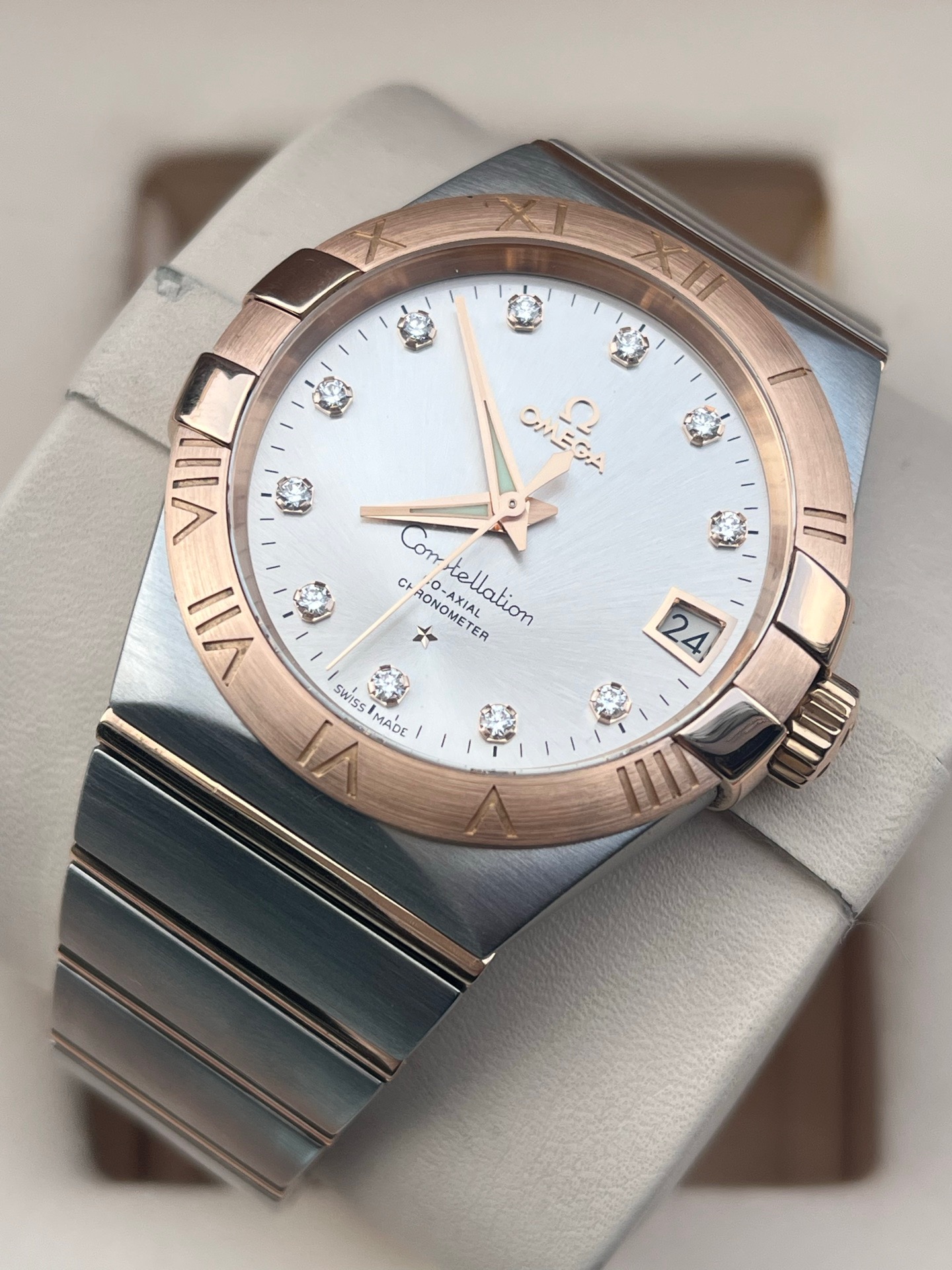 欧米茄星座系列123.20.38.21.52.001、男士自动机械腕表、表径:38mm、材质:精钢/18k玫瑰金、银白色盘面、钻石刻度、日期显示、自产8500机芯、瑞士天文台认证、原价:78500元