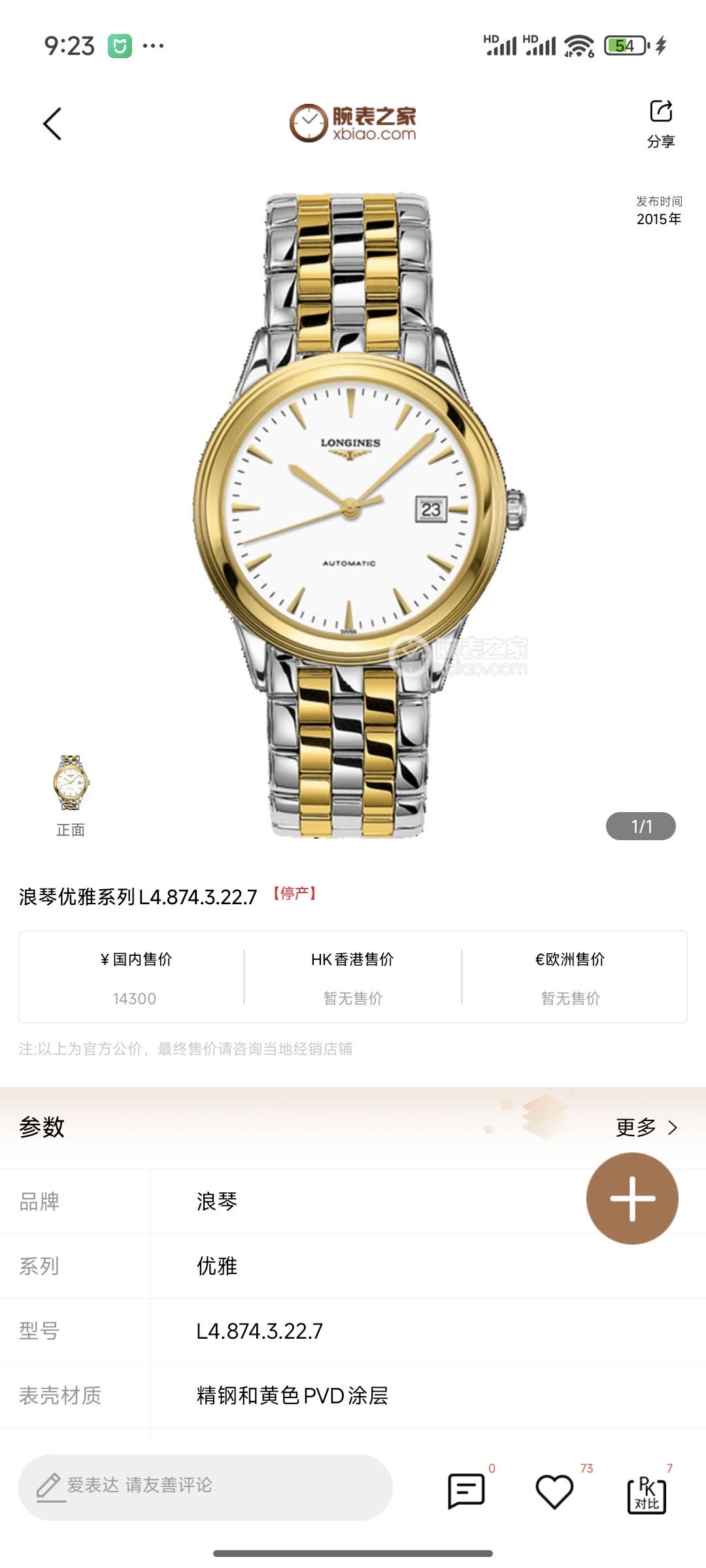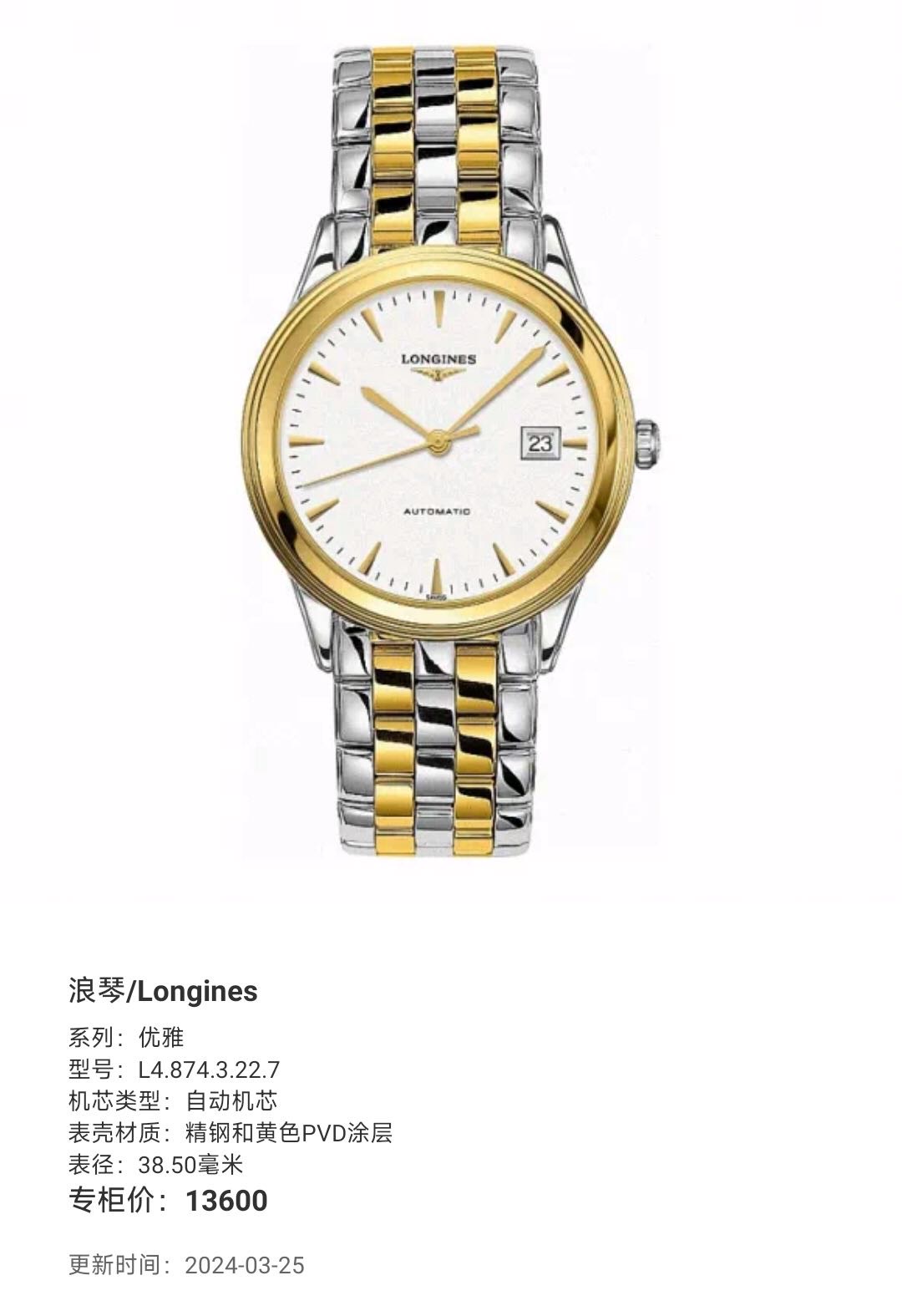 浪琴/Longines 优雅 L4.874.3.22.7 自动机芯 精钢和黄色PVD涂层 38.50毫米 专柜价13600