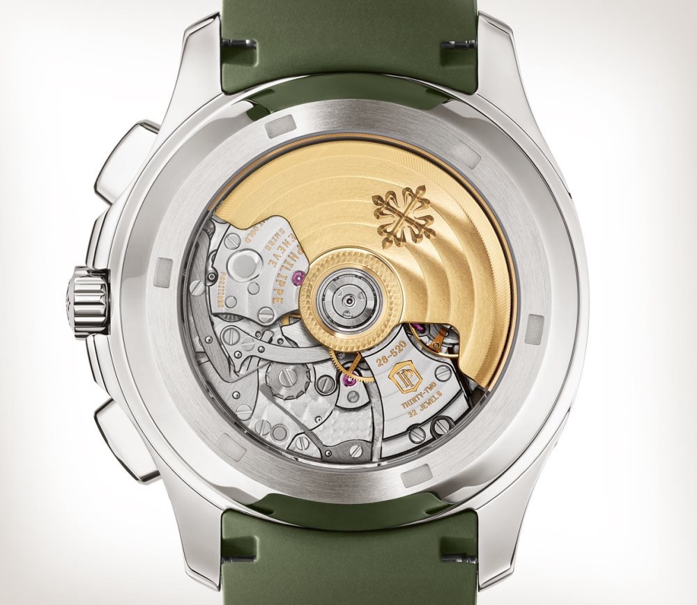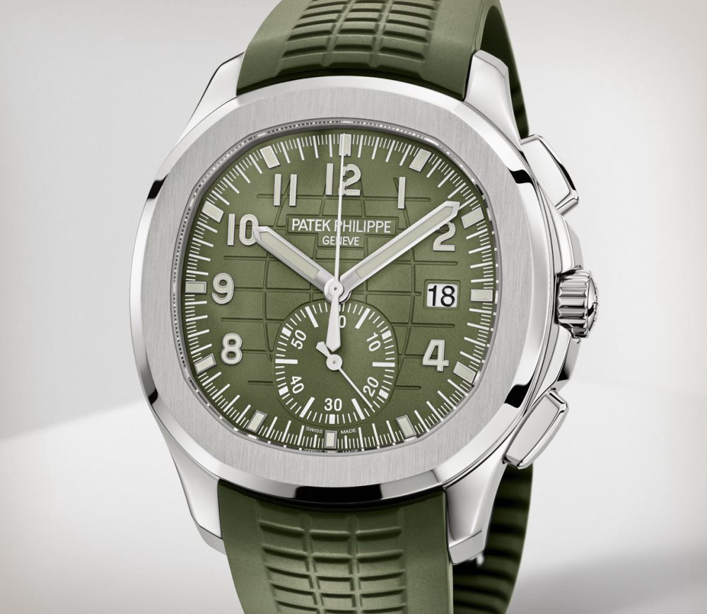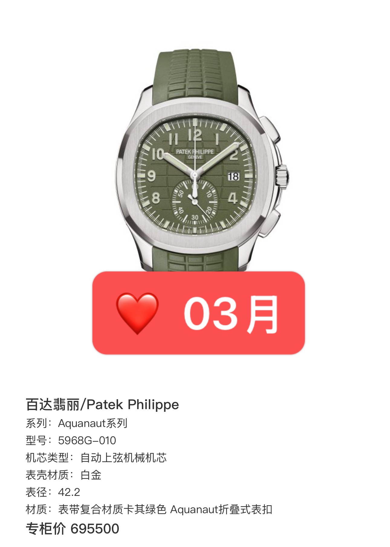 百达翡丽/Patek Philippe Aquanaut系列 5968G-010 自动上弦机械机芯 白金 42.2 表带复合材质卡其绿色 Aquanaut折叠式表扣 专柜价695500~