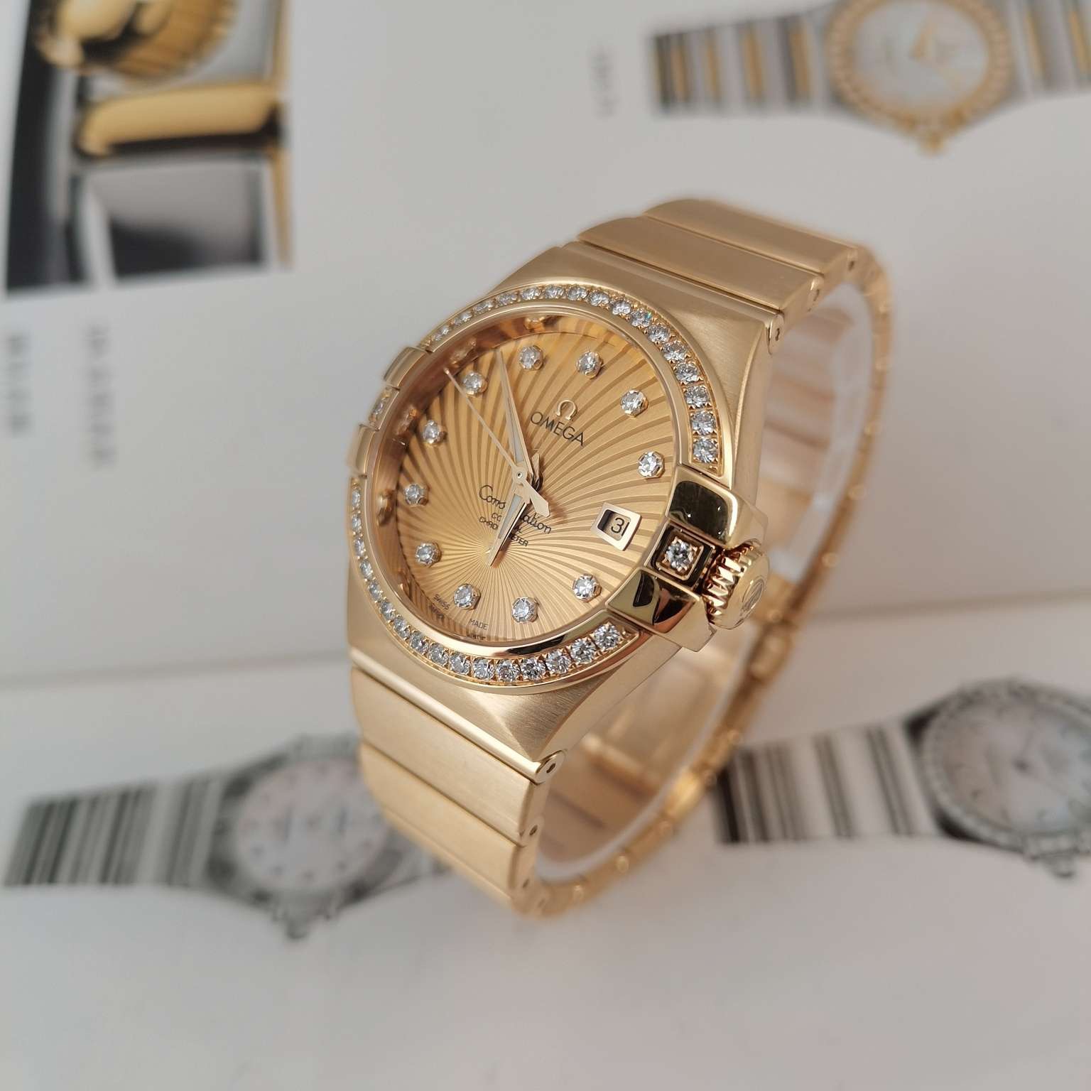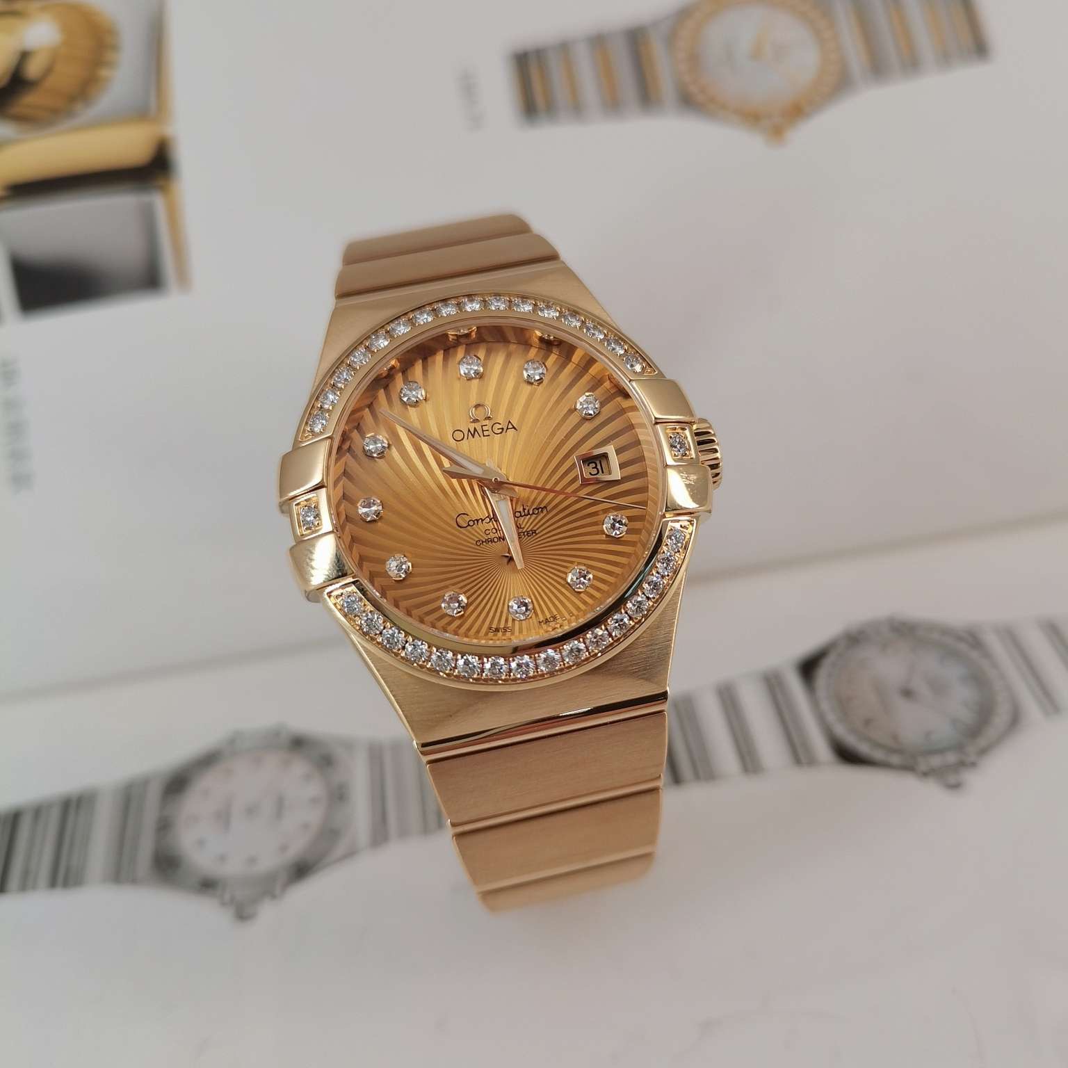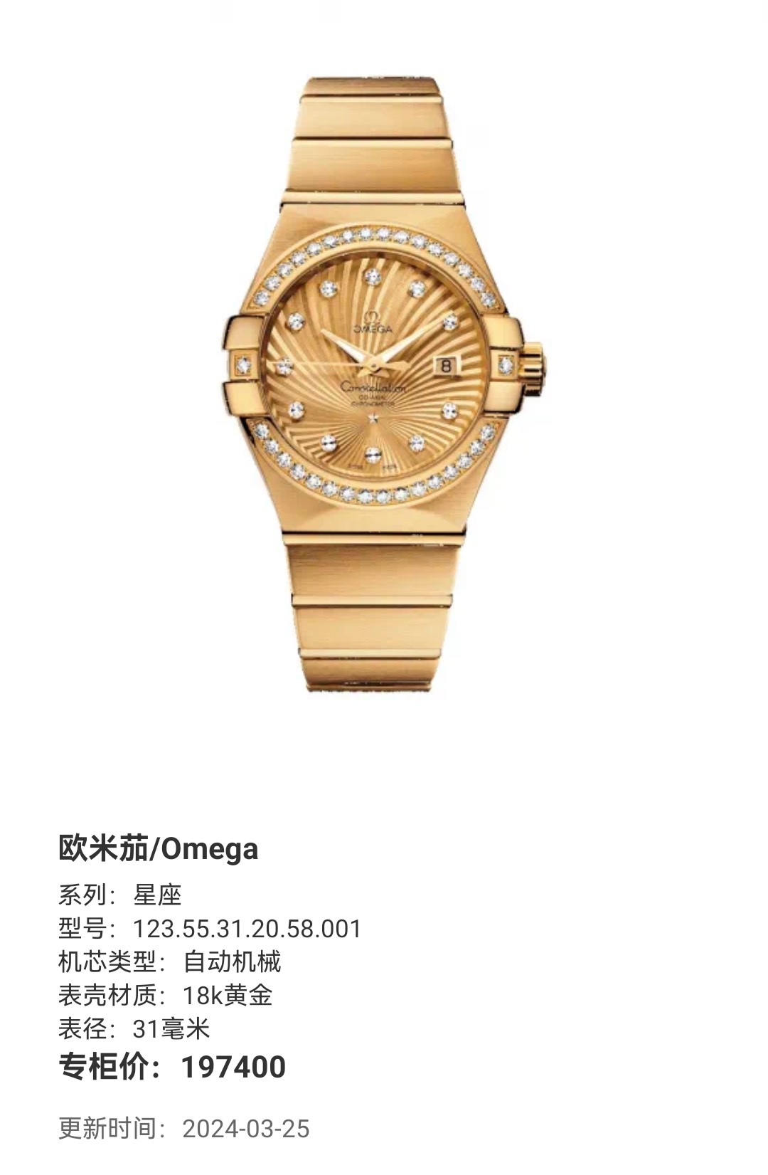 全套欧米茄星座系列女士腕表 型号:123.55.31.20.58.001 整表18k黄金材质 自动机械透底机芯 表圈镶钻 31mm太阳放射图案圆形表盘 钻石时标搭配夜光指针 3 点位日历显示窗 折叠表扣方便佩戴。公价197400 现货好价得~
